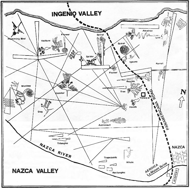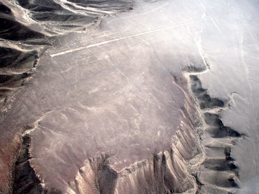 Egy másik szinte mindenki által ismert dolog, a Nazca vonalak. Nem ezek az egyetlen geoglifák, de méretük miatt kiemelkedők. Az állatfigurák közös jellemzője, hogy egyetlen, önmagát sehol nem metsző vonalból állnak. Mivel sivatagi környezet, ezért az eső nem veszélyeztette az idők során, ezért maradhatott fenn ilyen jó állapotban. Szimplán eltávolították a vörös kődarabokat, mely a fehéres talajt takarta. A legnagyobb figura több mint 200 méter hosszú. Valós céljukat még nem derítették ki, valamint azt sem, hogyan voltak képesek létrehozni őket. Egy-egy egyenest még könnyű, de egy teljes ábrát ilyen méretben, a sivatagban, repülő vagy hőlégballon nélkül...