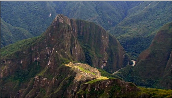 "Machu Picchu romjai Cuzcotól 112 km-re északnyugatra, az Urubamba-folyó (Wilka maio, „a Napfolyó”) völgyében, a perui Andok déli láncolatában, 2450 méteres magasságban, a Vilcabamba-Kordillera egyik meredek sziklás hegygerincén fekszenek. A város területe 13 km². Az elszigetelt, bevehetetlen helyet két hegyes csúcs határolja."