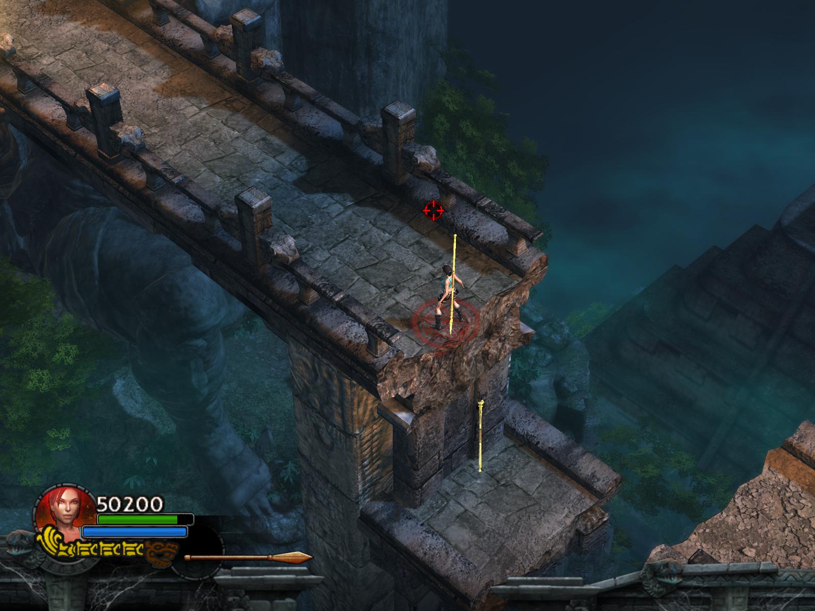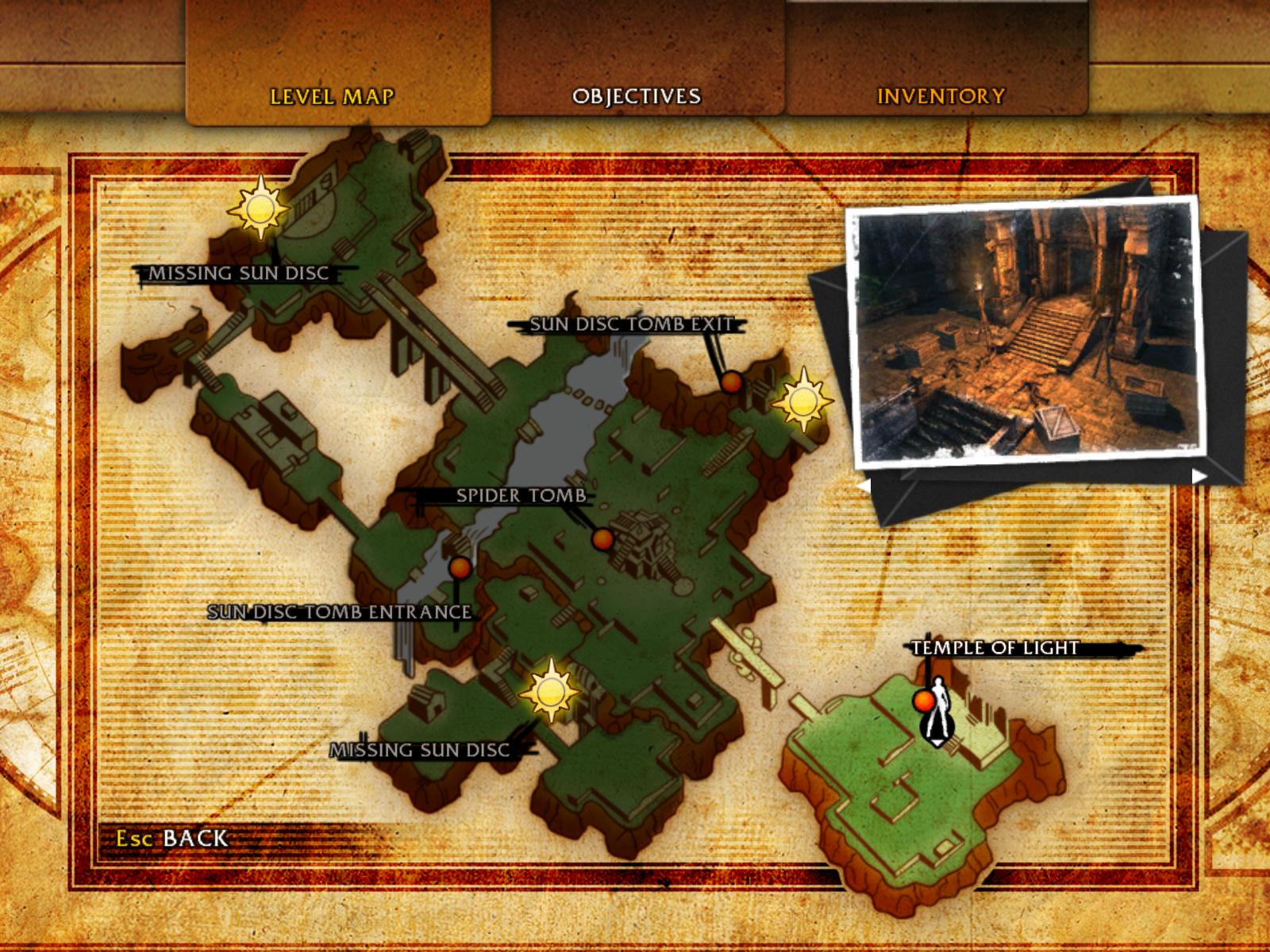 Irány vissza a templom elé. Menj körbe balra indulva, és végezz közben az összes ellenséggel. Van belőlük jócskán. Balra tarts, és a templom baloldalán menj le a lépcsőn. Itt rengeteg ellenség fogad. Viszont itt robbanthatod fel a harmadik terepjárót. Ha végeztél velük menj végig a hídon, és a csáklya segítségével átjutsz a túloldalra. A falba dobott lándzsáról már eléred a kis beugrót, ahol megtalálod az 1.Missing Sun Disc-et.