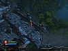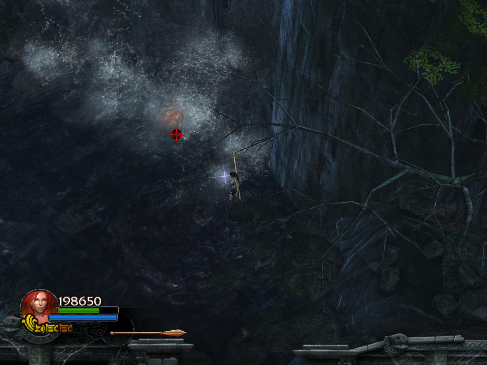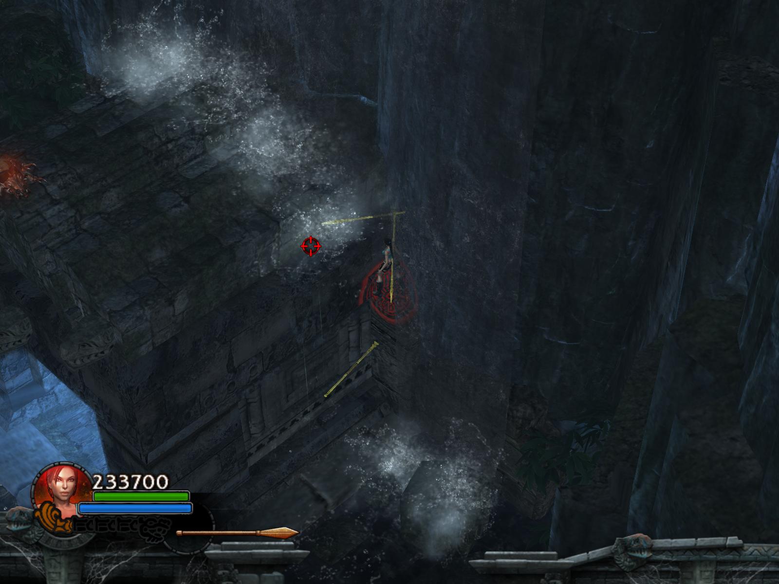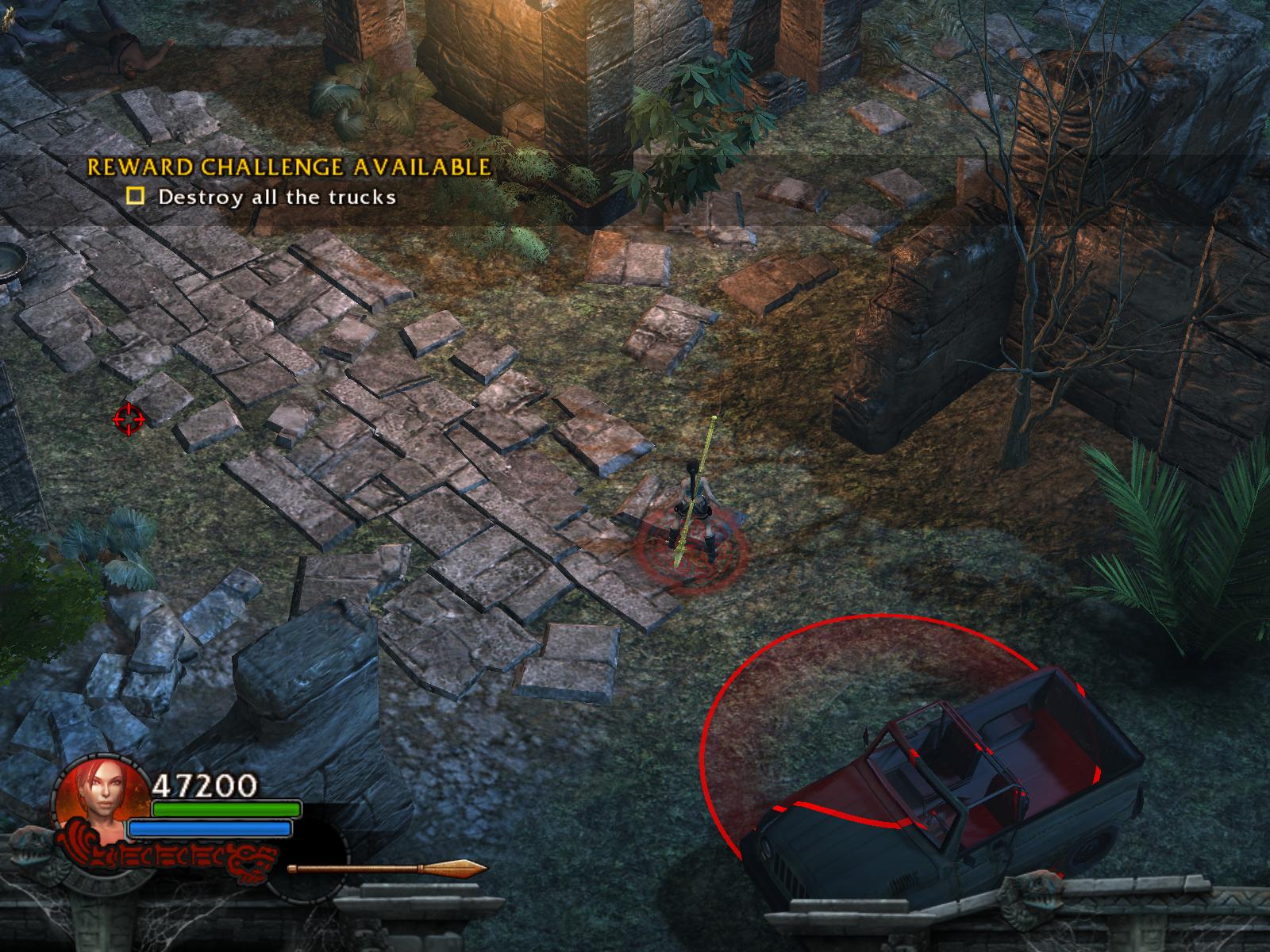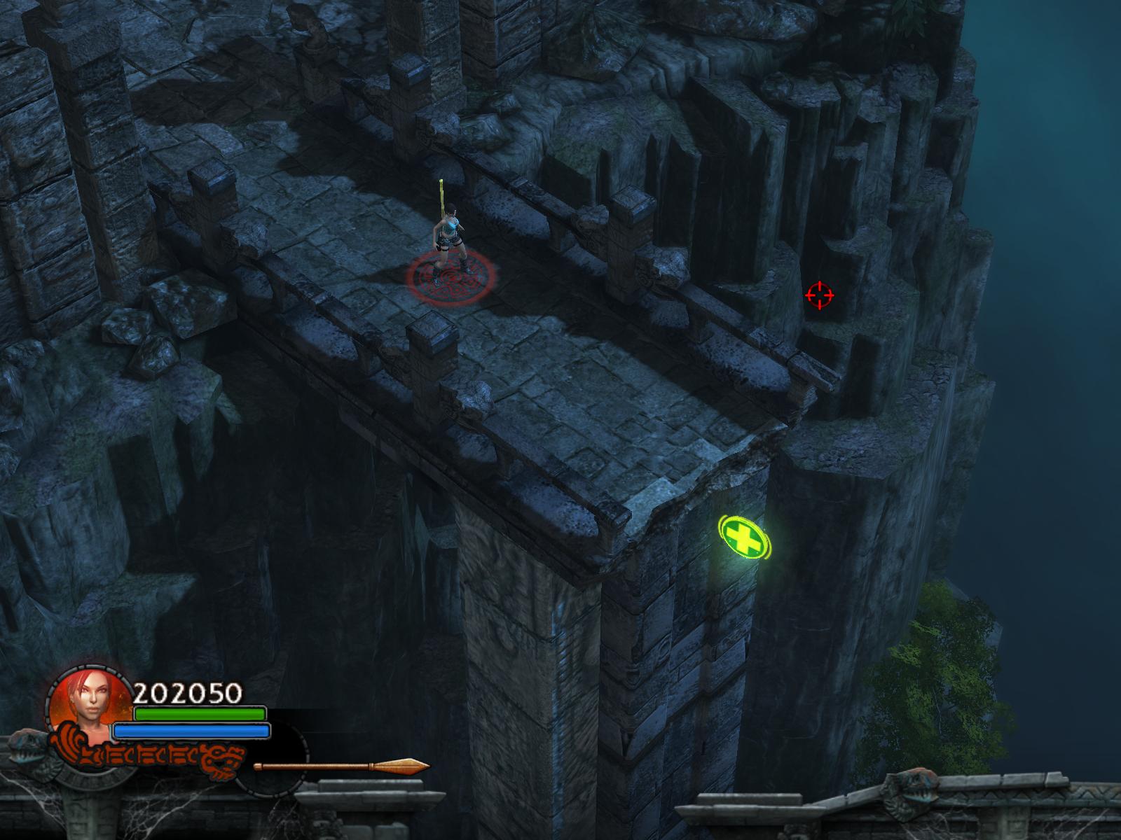 Menj most át az épület túloldalára. Ismét rengetegen rohannak rád, főleg a törött híd felől. Közben juss fel az oszlopok tetejére is, néhol a lándzsa, néhol az odatolt gömb segítségével. A gömbre felállva magasabbra dobhatod a lándzsát. Az oszlopok tetején full medipackot, és full lőszert is találsz. Megtalálod a negyedik terepjárót is, robbantsd fel. Menj ki a folyópartra, és a vízesés alatt megtalálod a 6. Vörös Koponyát.