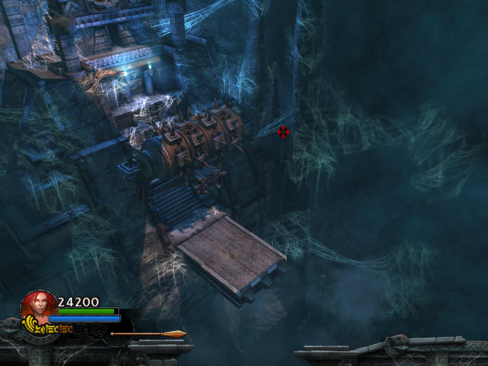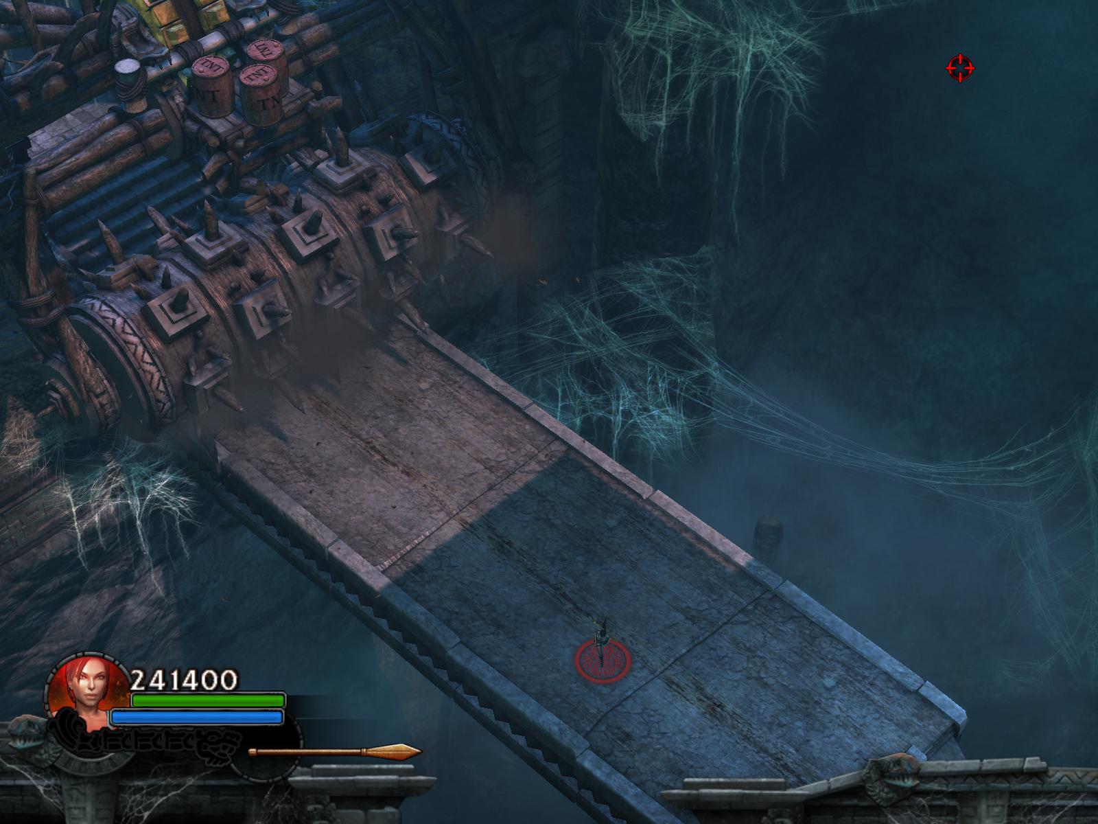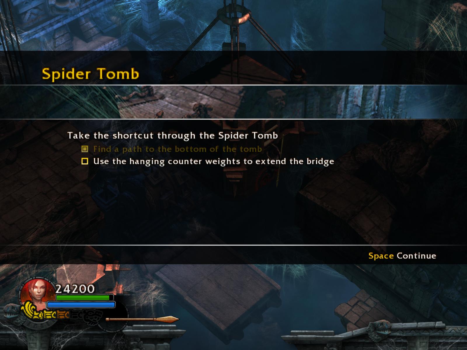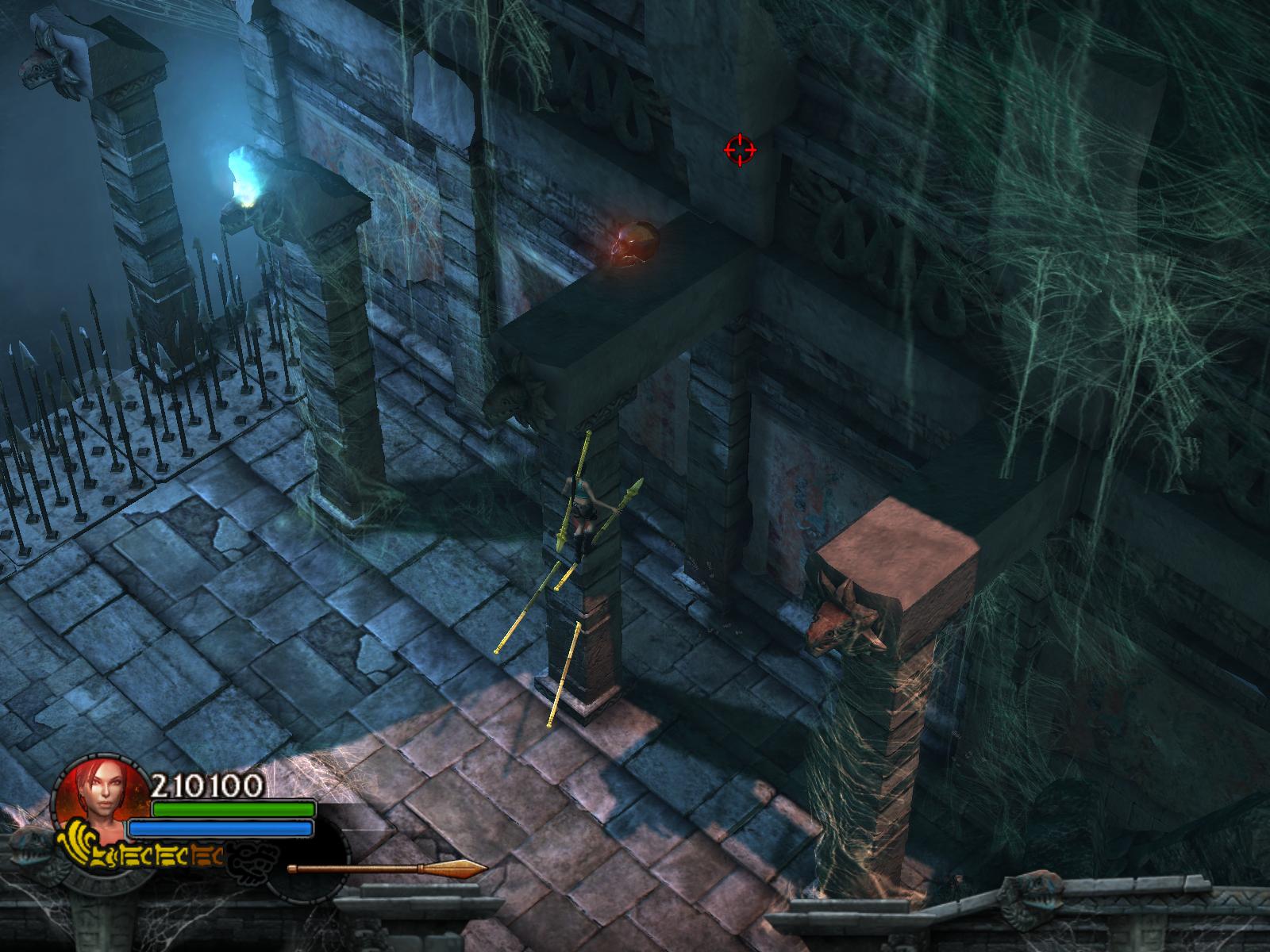 A pókok két hullámban támadnak. Végezz velük, ha kell menj vissza a medipackkért, lőszerért a pálya elejére. Irány vissza, és most már húzd meg a fogantyút. Időre megy a feladat. A csáklya segítségével átjutsz a túloldalra, ha gyors vagy. Ha nem, akkor van más megoldás is. Dobj pár lándzsát a falba, így rajtuk ugrálva átjutsz a gödrön. Menj végig a hídon, és jobbra tartva a csáklya segítségével átjutsz egy párkányra, ahonnan felugorhatsz egy kis lebegő platformra, a rövid létrára. Lent, kinyúlik a híd egyik fele. Mássz fel a létrán, ugorj jobbra, a fal melletti párkányra. Menj tovább, és ráállva a kapu előtti nyomáskapcsolóra kinyílik előtted a kapu. Gyilkold le a sok pókot, és vedd fel a sarokból az 1.Vörös Koponyá-t.