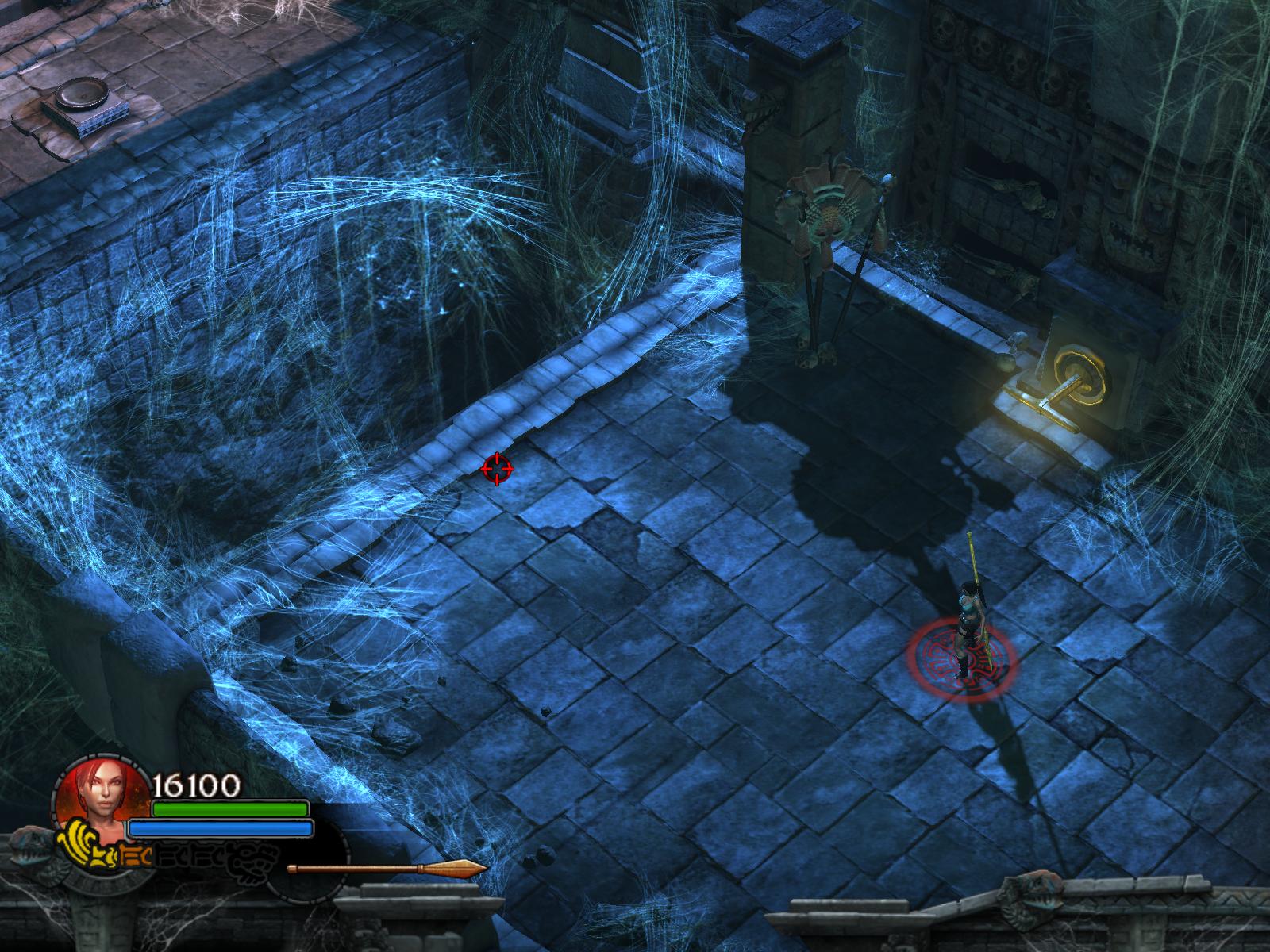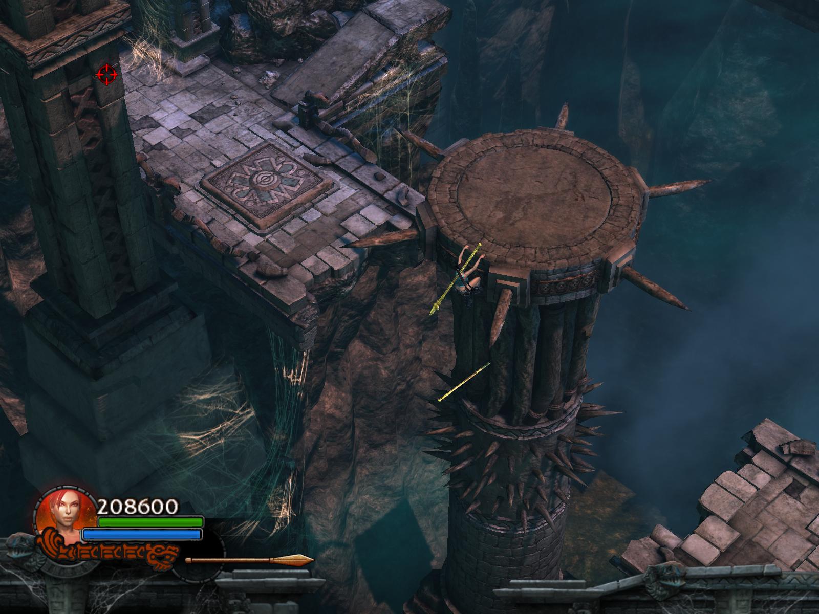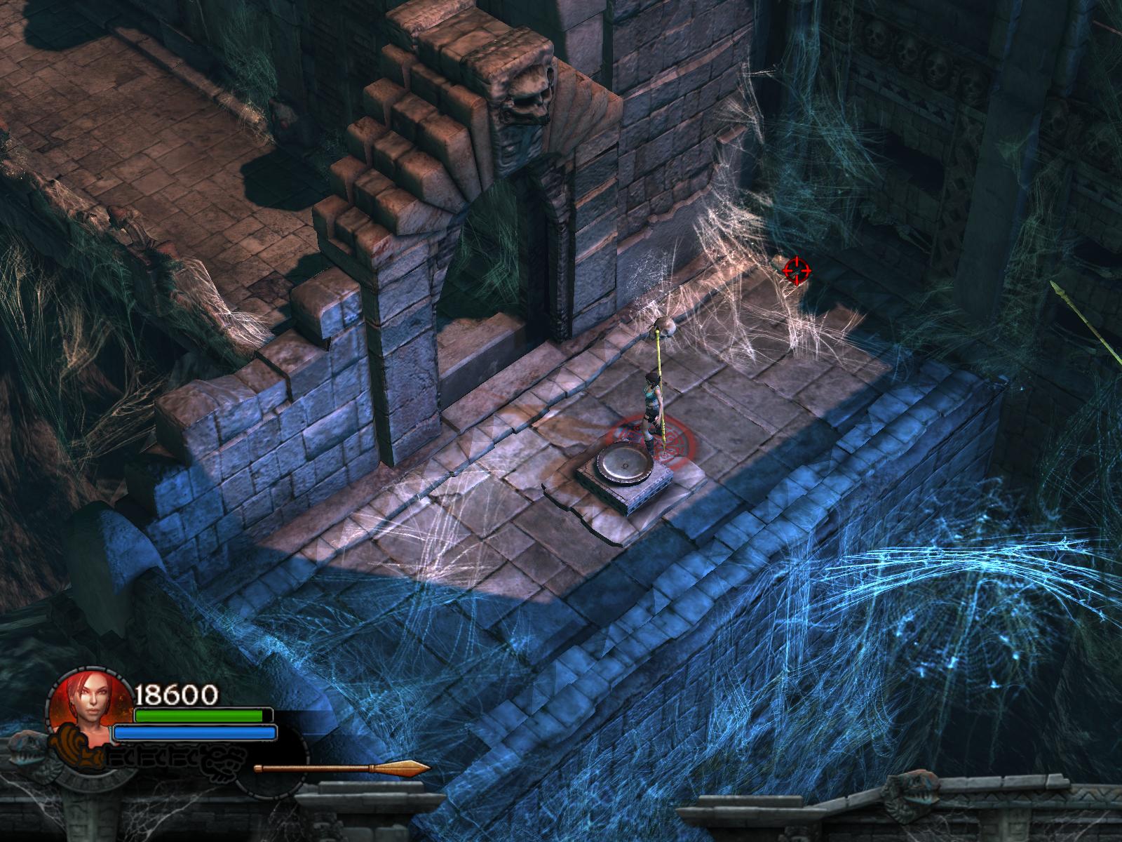 A pókok két hullámban támadnak. Végezz velük, ha kell menj vissza a medipackkért, lőszerért a pálya elejére. Irány vissza, és most már húzd meg a fogantyút. Időre megy a feladat. A csáklya segítségével átjutsz a túloldalra, ha gyors vagy. Ha nem, akkor van más megoldás is. Dobj pár lándzsát a falba, így rajtuk ugrálva átjutsz a gödrön. Menj végig a hídon, és jobbra tartva a csáklya segítségével átjutsz egy párkányra, ahonnan felugorhatsz egy kis lebegő platformra, a rövid létrára. Lent, kinyúlik a híd egyik fele. Mássz fel a létrán, ugorj jobbra, a fal melletti párkányra. Menj tovább, és ráállva a kapu előtti nyomáskapcsolóra kinyílik előtted a kapu. Gyilkold le a sok pókot, és vedd fel a sarokból az 1.Vörös Koponyá-t.