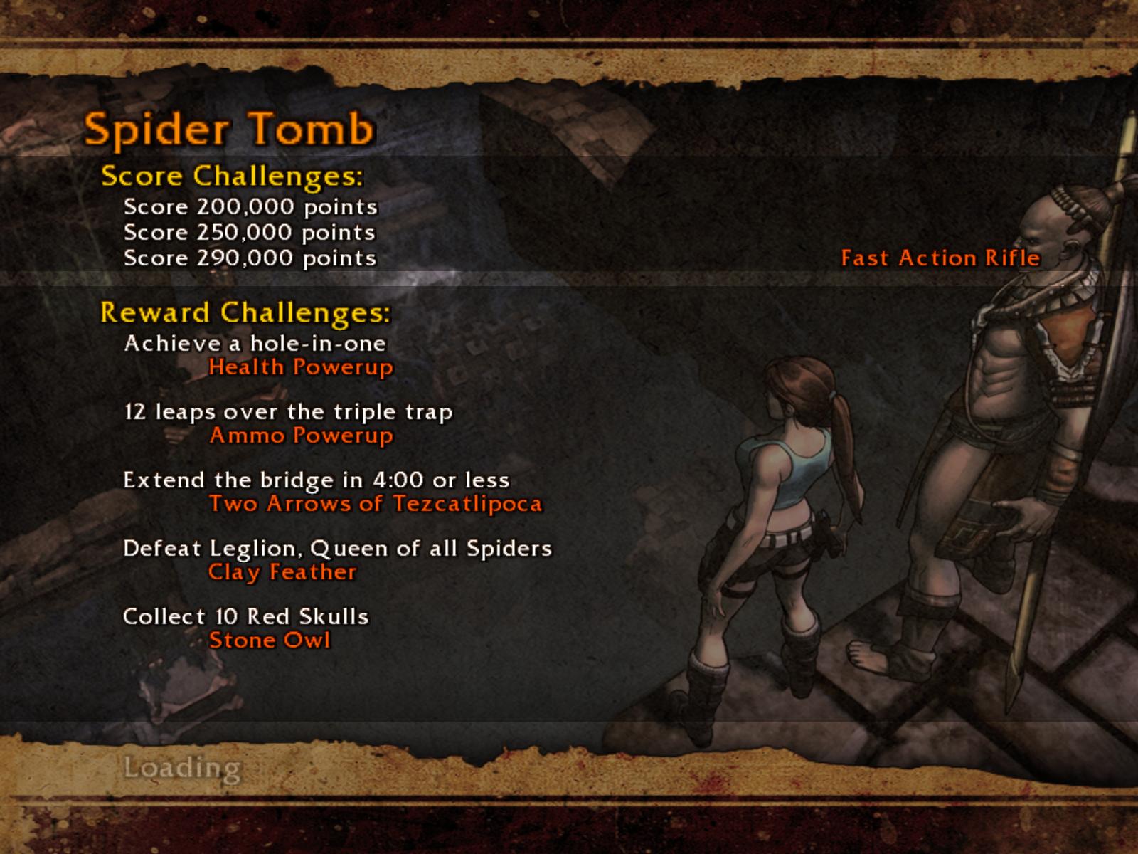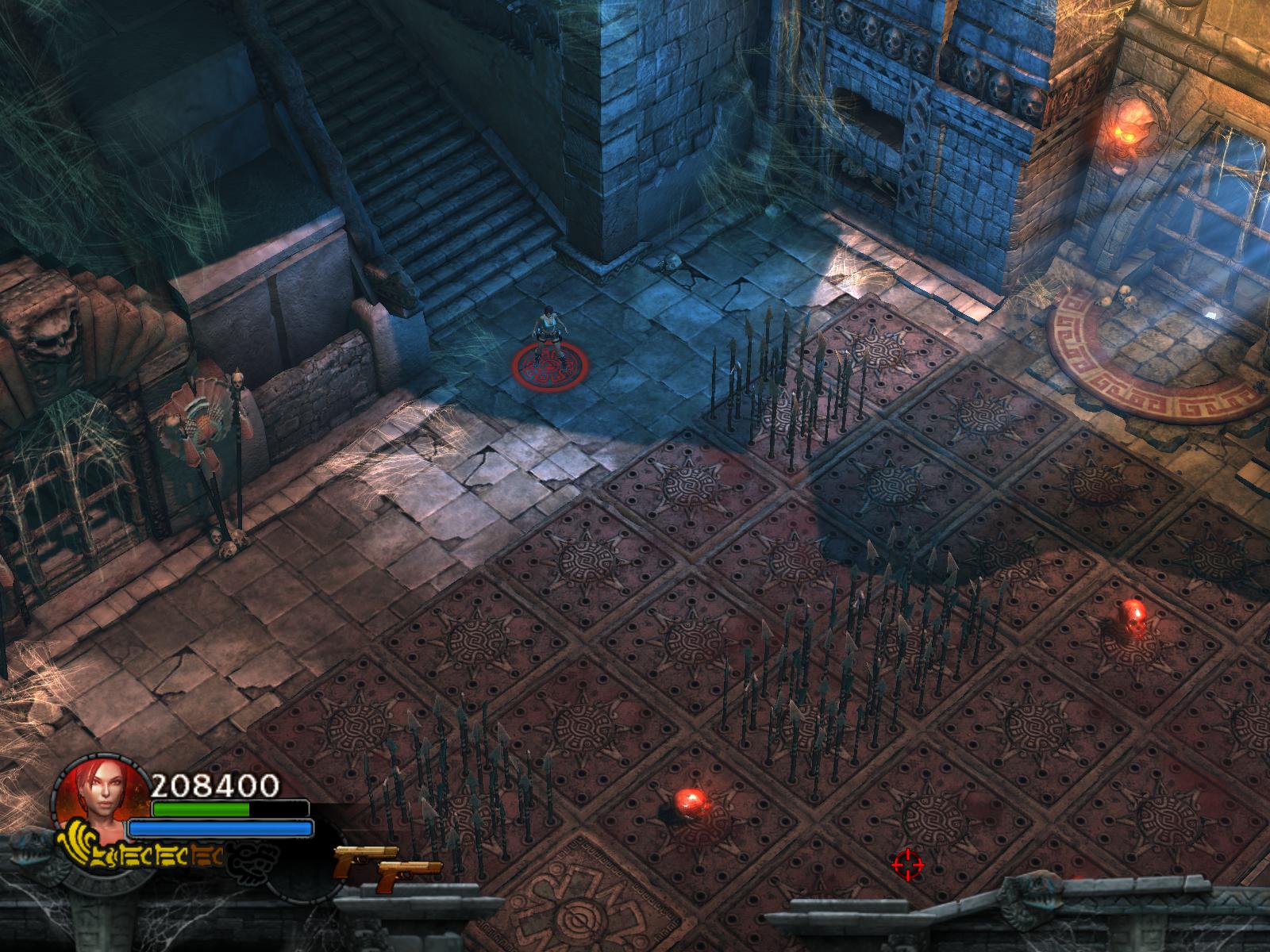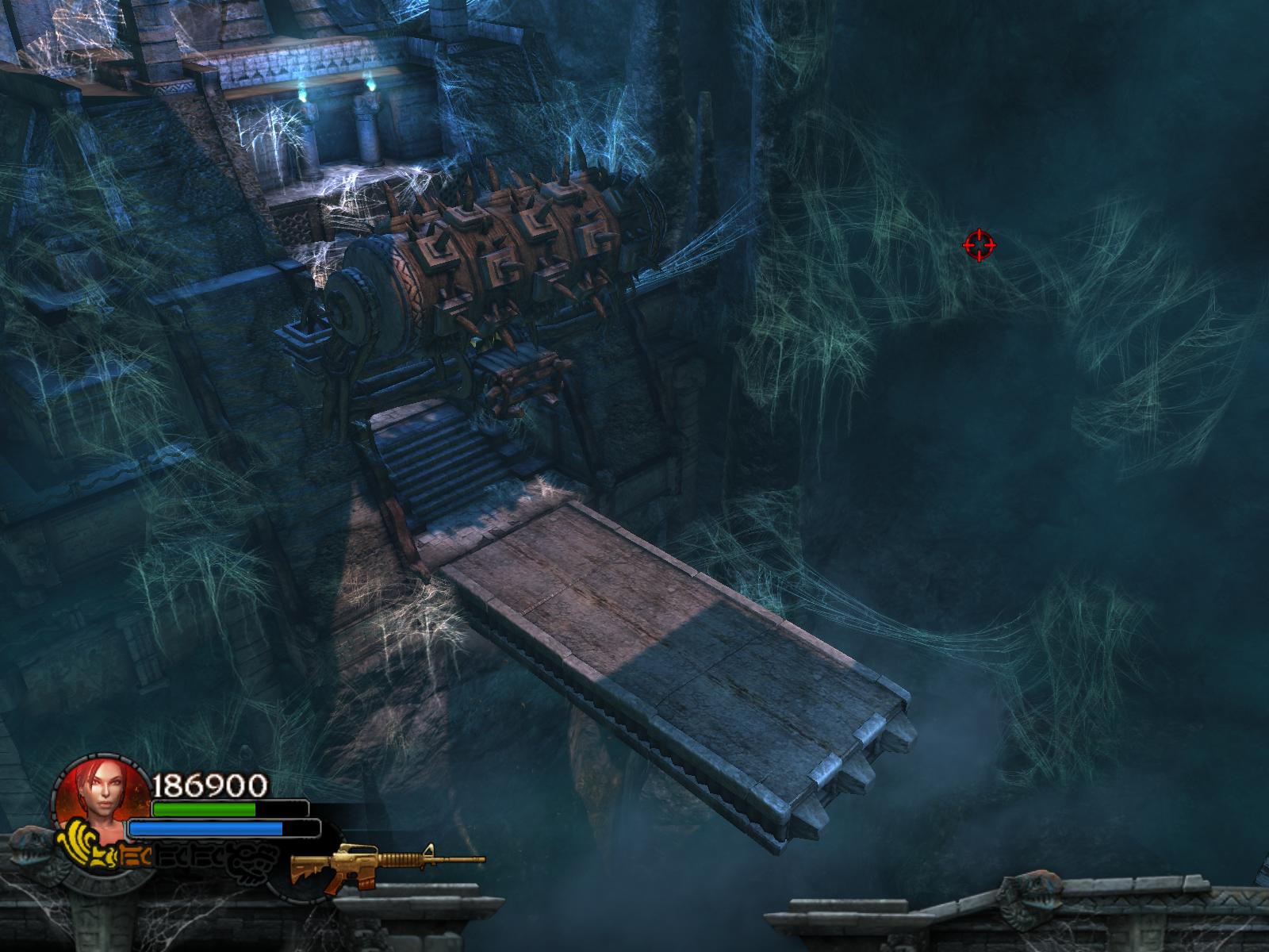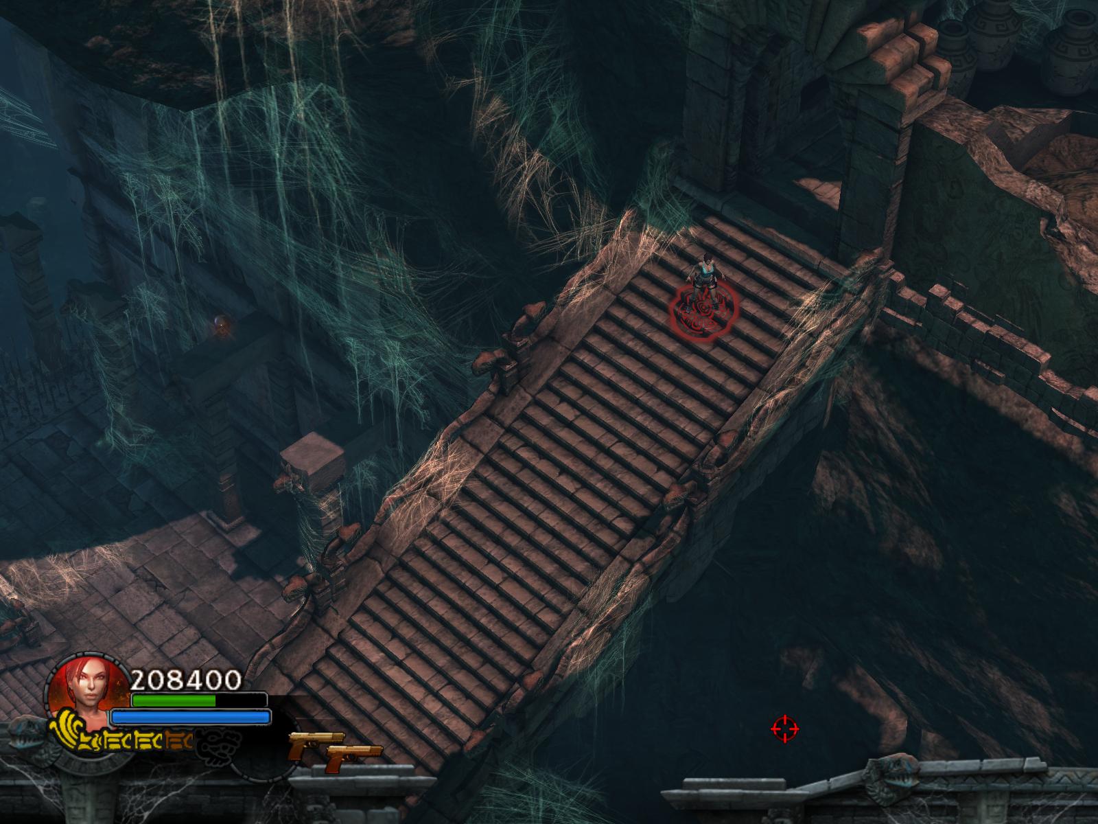 A pókok két hullámban támadnak. Végezz velük, ha kell menj vissza a medipackkért, lőszerért a pálya elejére. Irány vissza, és most már húzd meg a fogantyút. Időre megy a feladat. A csáklya segítségével átjutsz a túloldalra, ha gyors vagy. Ha nem, akkor van más megoldás is. Dobj pár lándzsát a falba, így rajtuk ugrálva átjutsz a gödrön. Menj végig a hídon, és jobbra tartva a csáklya segítségével átjutsz egy párkányra, ahonnan felugorhatsz egy kis lebegő platformra, a rövid létrára. Lent, kinyúlik a híd egyik fele. Mássz fel a létrán, ugorj jobbra, a fal melletti párkányra. Menj tovább, és ráállva a kapu előtti nyomáskapcsolóra kinyílik előtted a kapu. Gyilkold le a sok pókot, és vedd fel a sarokból az 1.Vörös Koponyá-t.