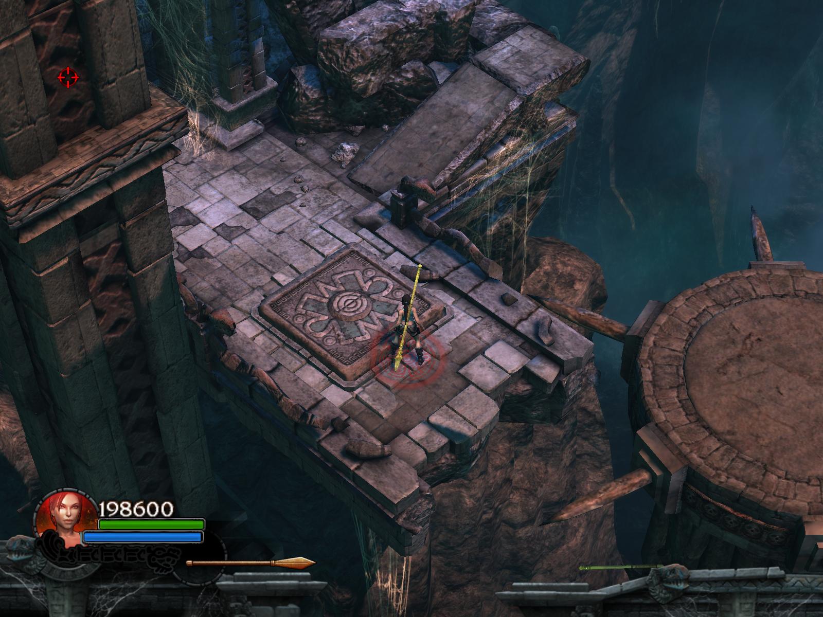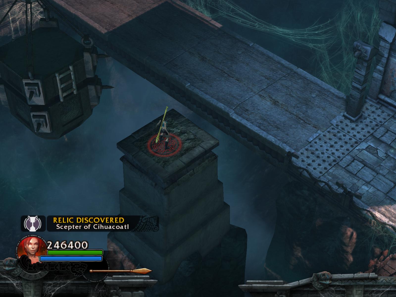 Most menj vissza, egészen a három forgógolyós helyhez. Ott is ugorj át a túloldalra, menj jobbra, ugrás a lebegő platformra. Az lesüllyed alattad, és jobbra, egy oszlopra átugorva megtalálod a Relikviát, a Scepter of Cihuacoatl-t. Azért itt vigyázz, ha véletlenül ezt már megszerezted, NE ugorj át a három golyós platformról, mert nincs visszaút. Kis szerkesztői hiba ez. :)
