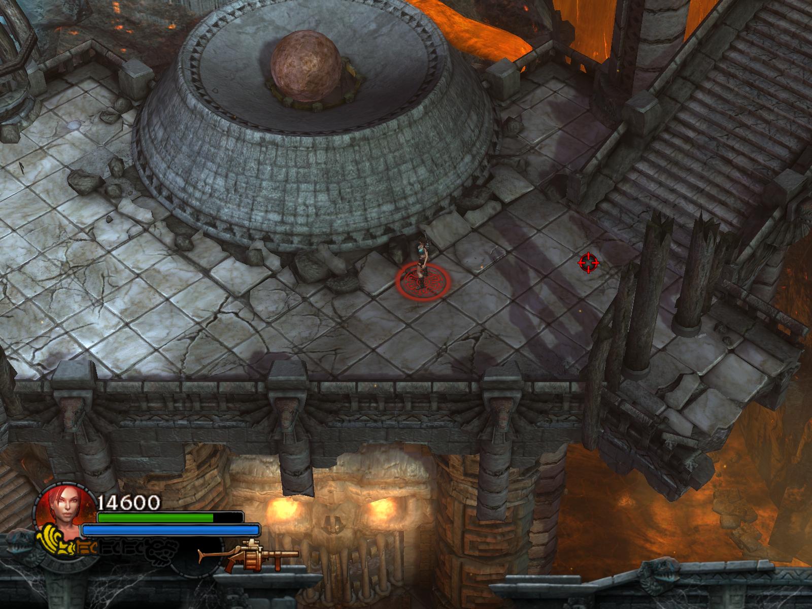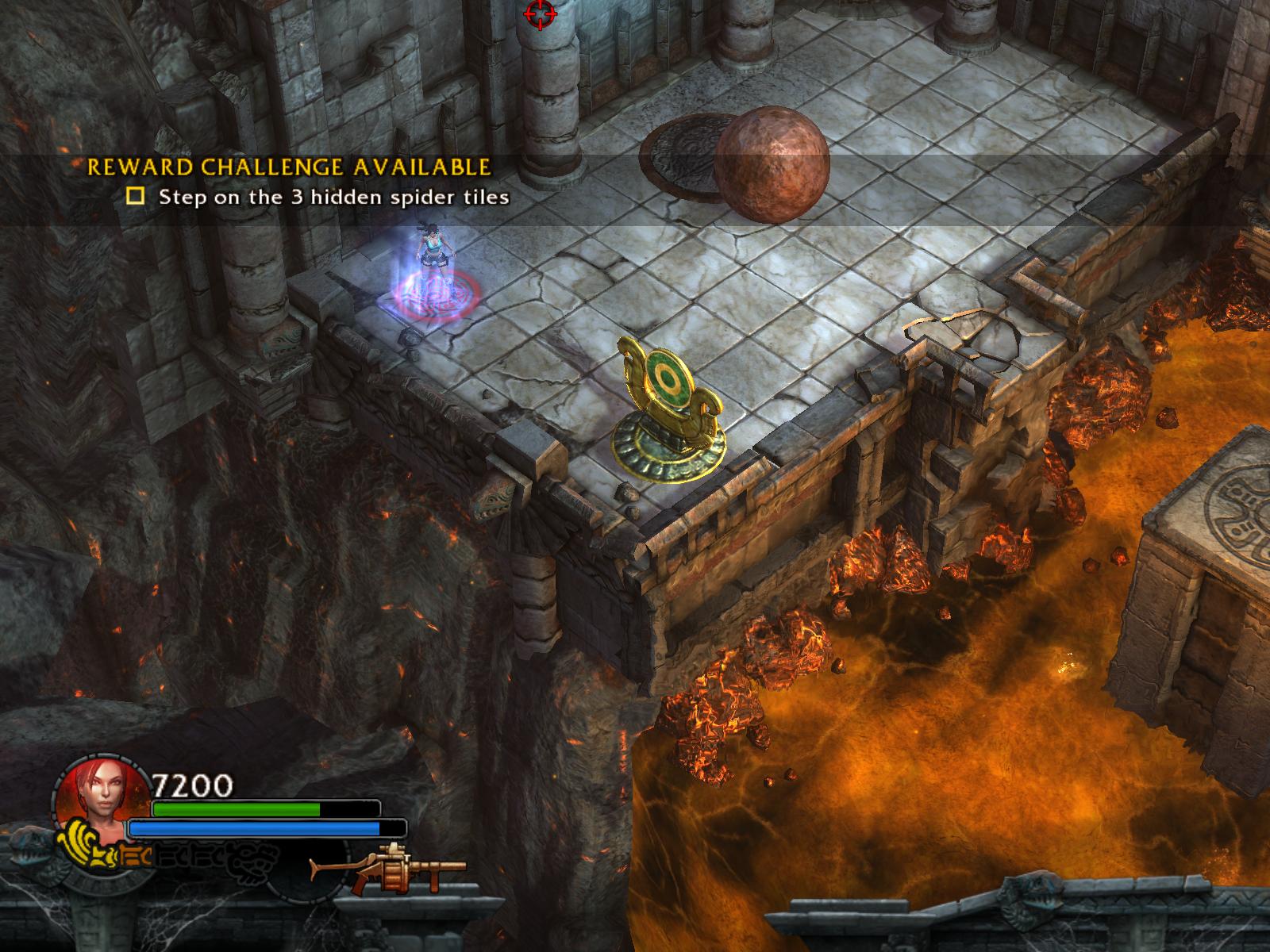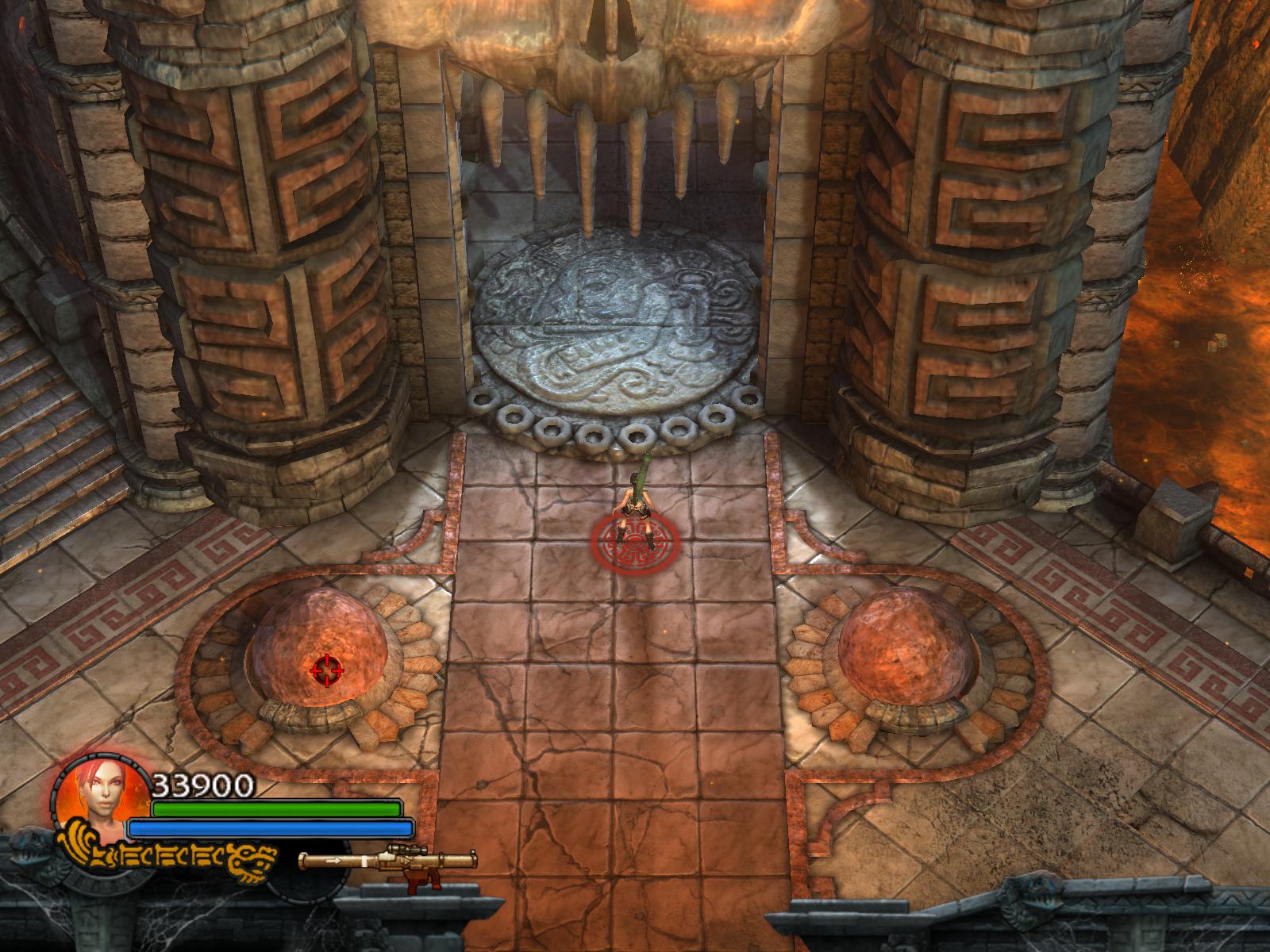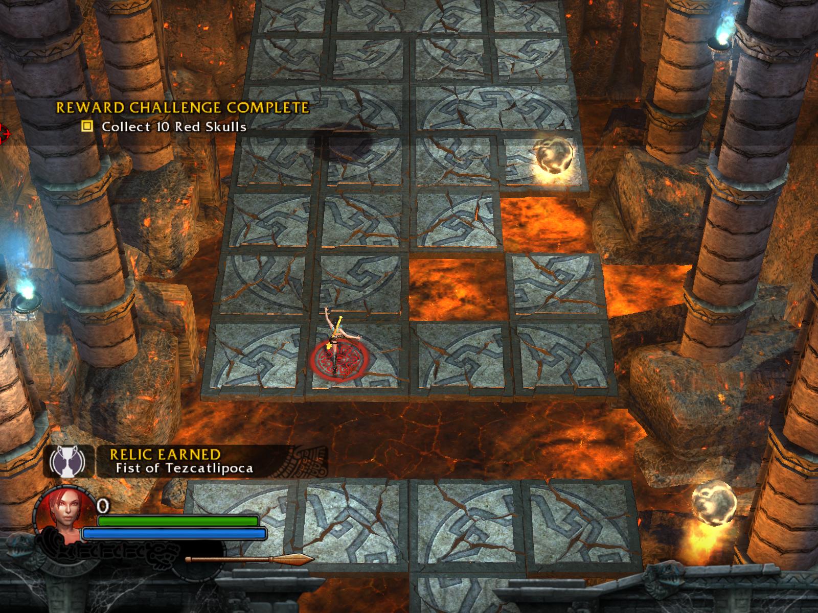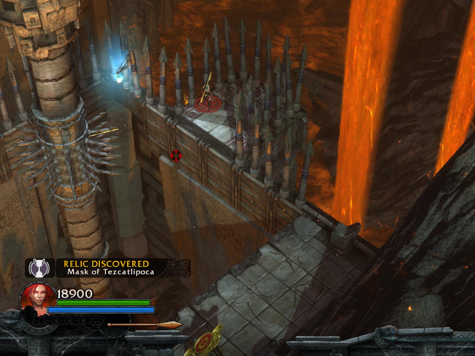 Menj be először balra, a fényes kapun. Löj bele egyet a gongba. Az oszlopon visszahúzódnak a tüskék, de az ajtó zárva van a relikviánál. Tegyél egy bombát a gonghoz, dobj egy lándzsát az oszlopba, a relikvia felöl, és ugorj rá. Robbants, és rögtön ugorj be a kinyílt ajtó mögé, és meg is van a Mask of Tezcatlipoca relikvia.