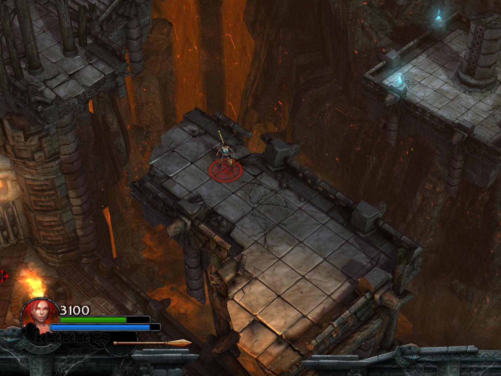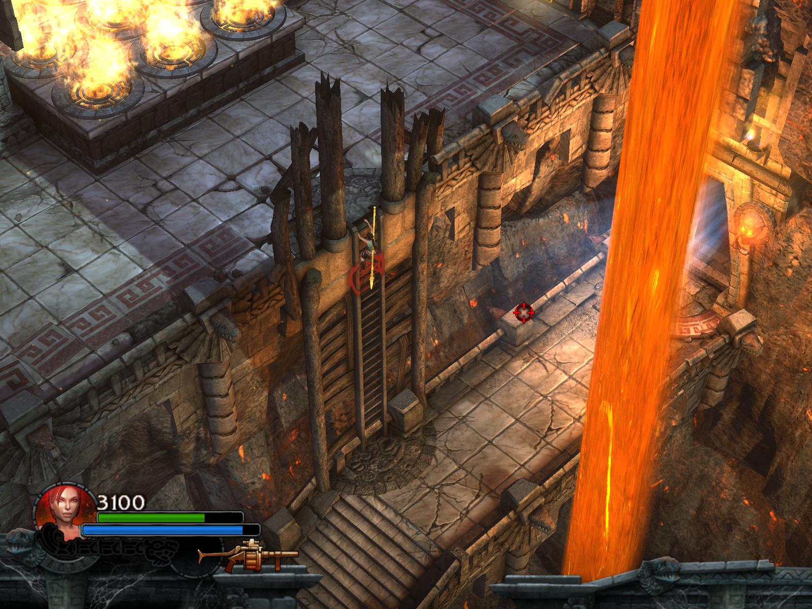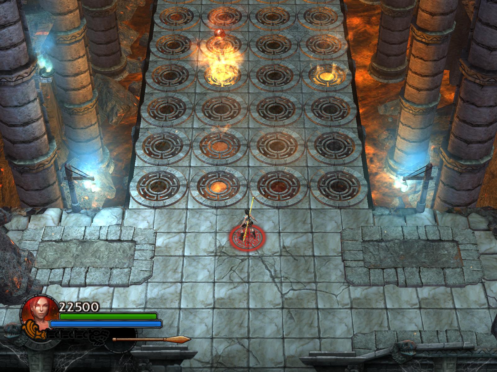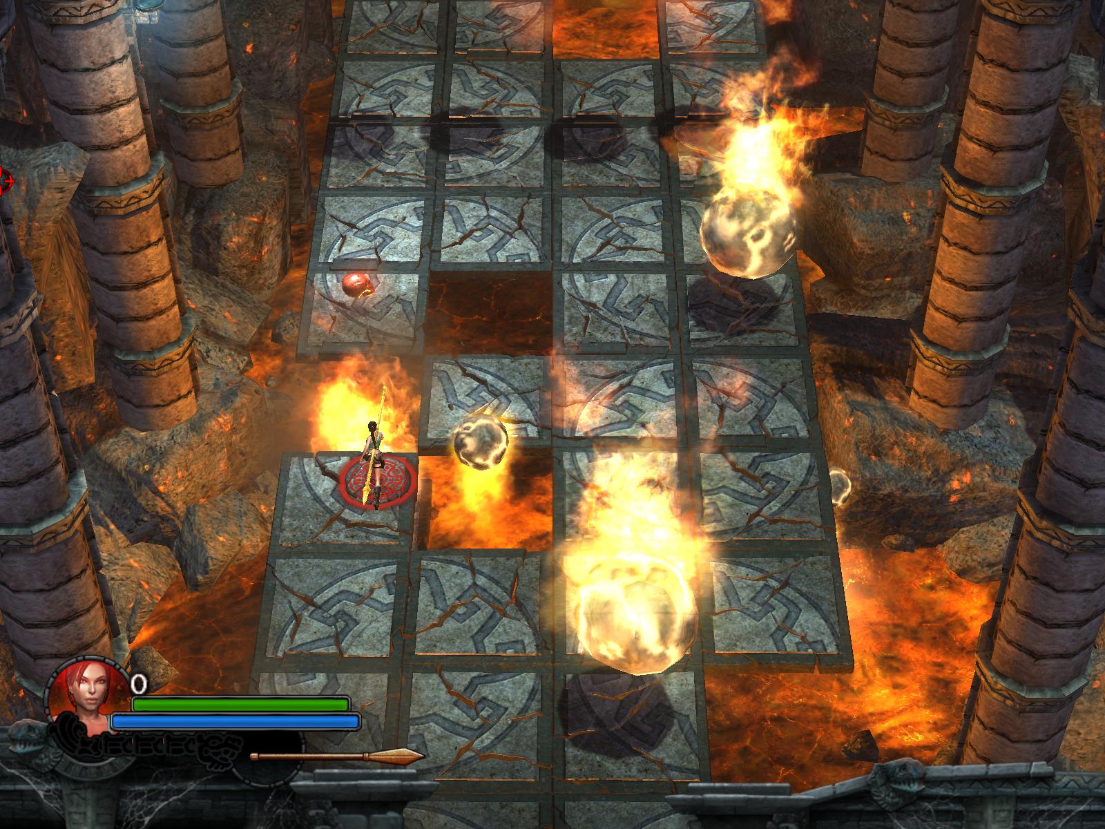 3.golyó: Menj tovább, és elérsz egy tüzekkel körülvett platformig. Dobj egy lándzsát a hátsó oszlopra, menj, és húzd ki ott a kart a falból. Siess, ugorj a lándzsára, majd kapaszkodj fel az oszlopra, és rohanj, ugorj át a felemelkedett platformokon a túloldalra. DE közben ejts le a tűzbe, a golyó mellé egy bombát. Robbantsd fel, és a golyó most már mozgatható, kiugrott a tűzből. Végezz a megjelenő tüzes érdeklődőkkel, majd told a kijárathoz a golyót. Bizony nem fér ki. No nem baj. Tegyél egy bombát mögé, menj ki a kapun kívülre, és húzd ki a falból a kart. Robbantsd fel a bombát, így ki tudod hozni a golyót. Nosza kapd el, és taszítsd a mélybe. Menj utána, le a lépcsőn, és ezt is repítsd fel a tölcsérbe egy jól irányzott bombával.