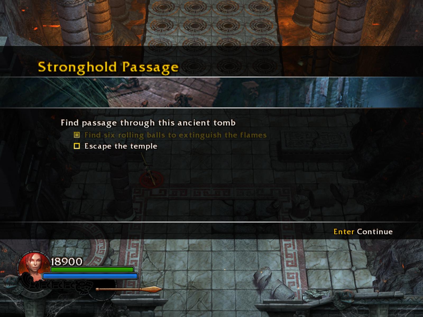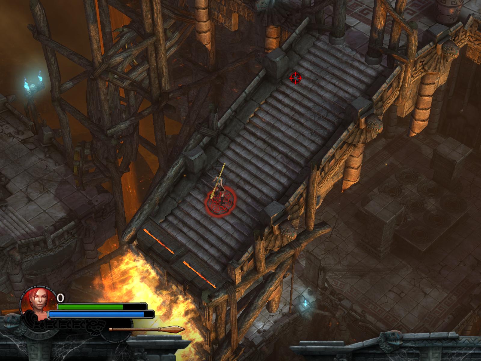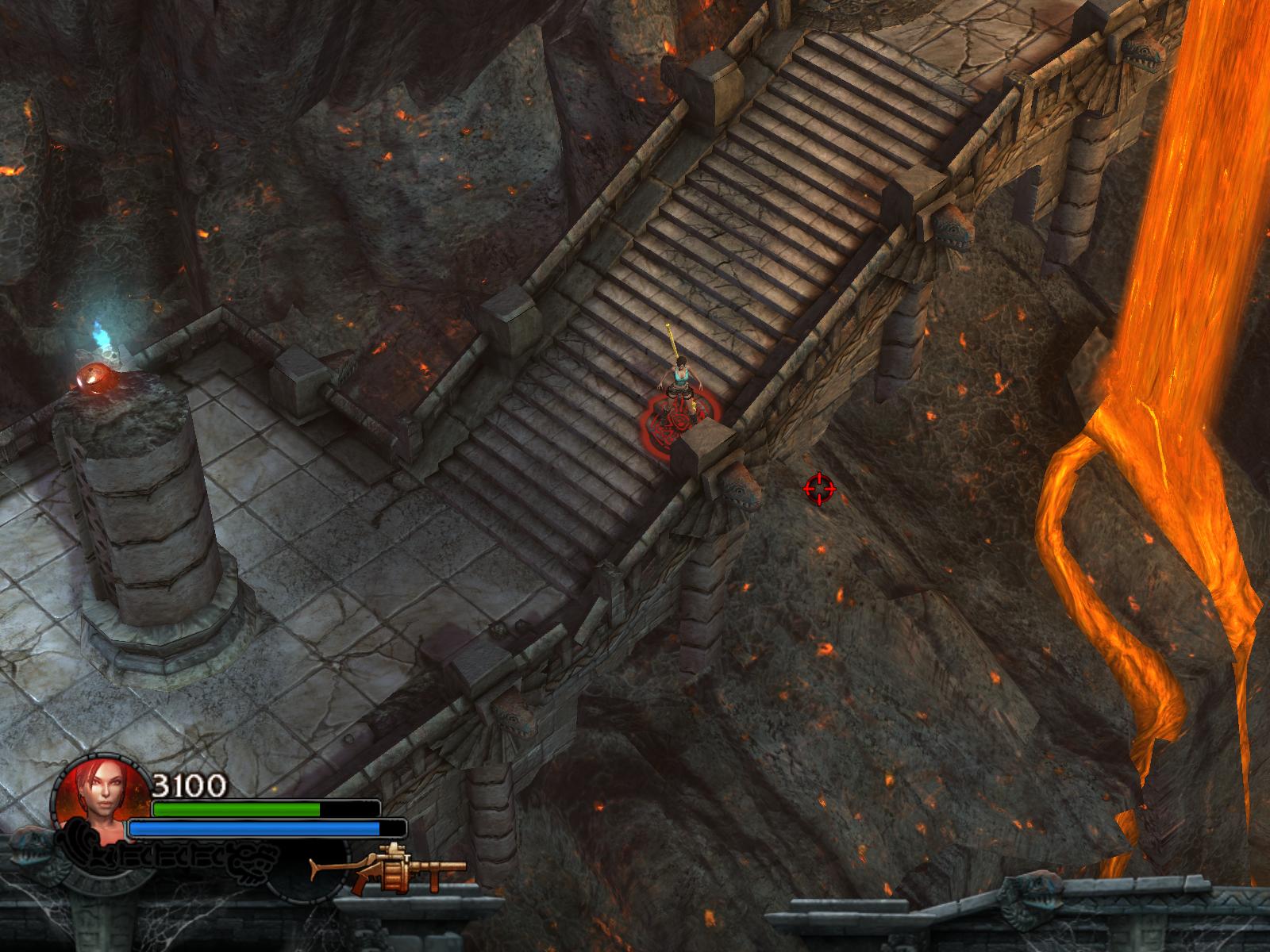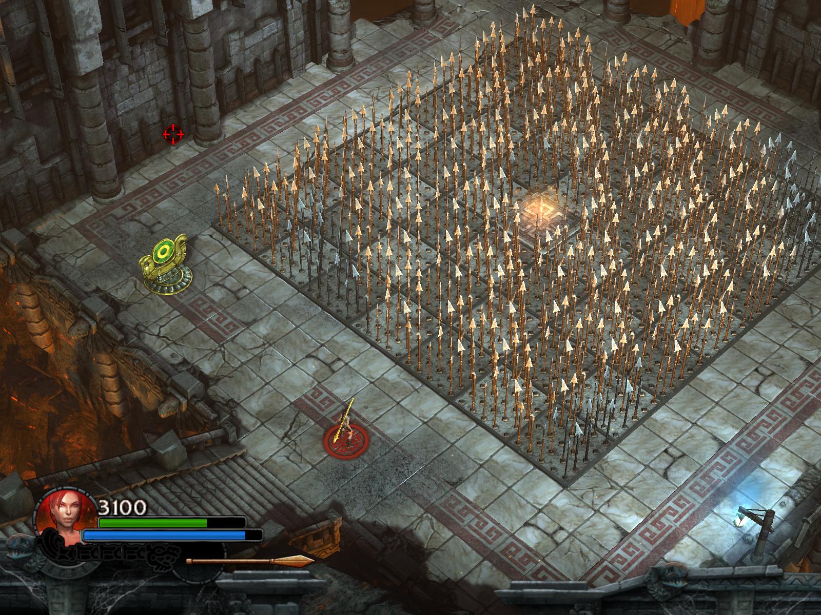 3.golyó: Menj tovább, és elérsz egy tüzekkel körülvett platformig. Dobj egy lándzsát a hátsó oszlopra, menj, és húzd ki ott a kart a falból. Siess, ugorj a lándzsára, majd kapaszkodj fel az oszlopra, és rohanj, ugorj át a felemelkedett platformokon a túloldalra. DE közben ejts le a tűzbe, a golyó mellé egy bombát. Robbantsd fel, és a golyó most már mozgatható, kiugrott a tűzből. Végezz a megjelenő tüzes érdeklődőkkel, majd told a kijárathoz a golyót. Bizony nem fér ki. No nem baj. Tegyél egy bombát mögé, menj ki a kapun kívülre, és húzd ki a falból a kart. Robbantsd fel a bombát, így ki tudod hozni a golyót. Nosza kapd el, és taszítsd a mélybe. Menj utána, le a lépcsőn, és ezt is repítsd fel a tölcsérbe egy jól irányzott bombával.