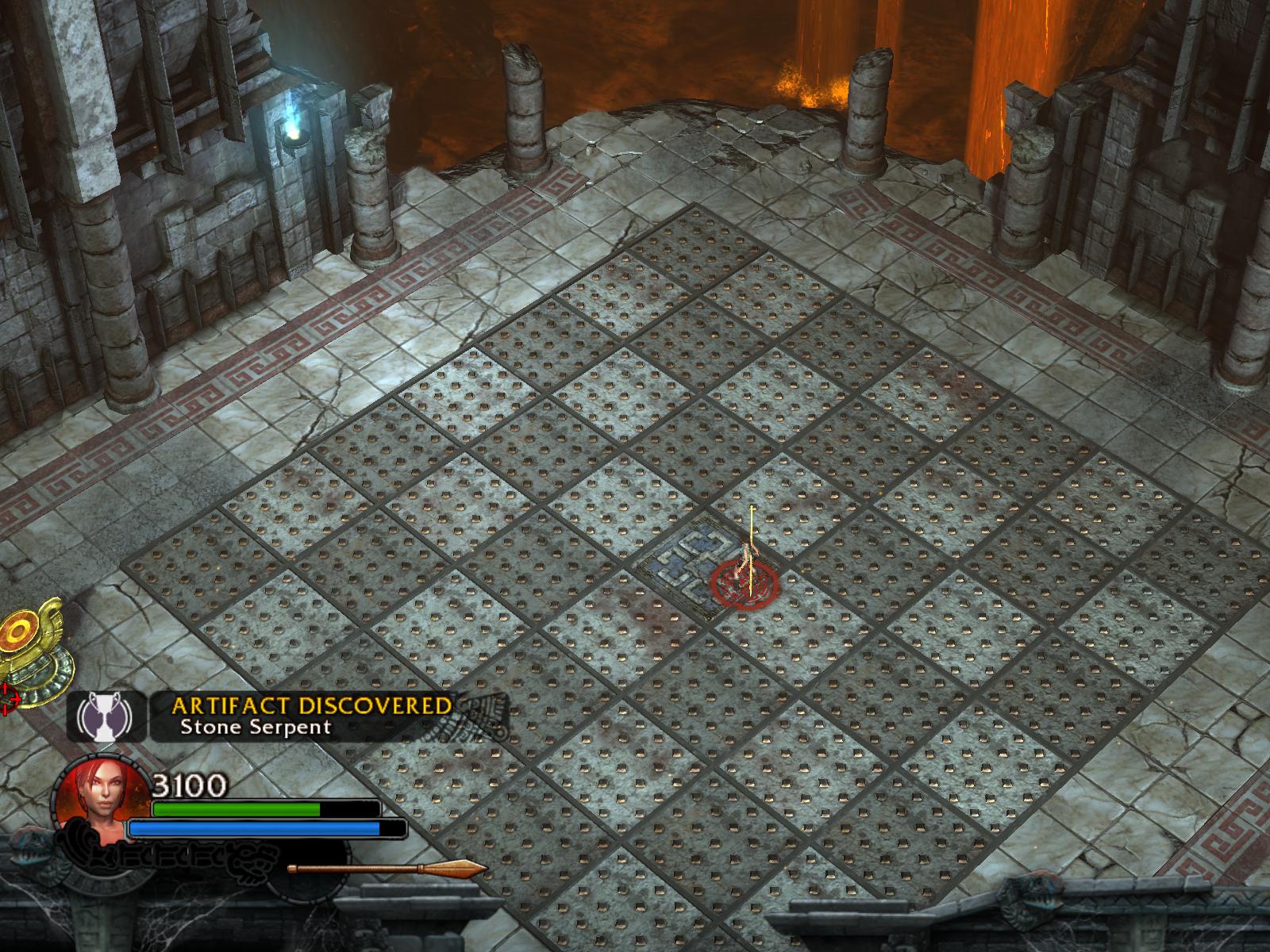 Menj most felfelé, menj be a fényes kapun, és elérsz egy kis térre, ahol tüskés platformokat látsz, és balról egy gongot, ami változtatja a felállást. Egyszerű a feladat, juss el a középső padlólapra. Máris megkaptad a Stone Serpent artifact-ot.