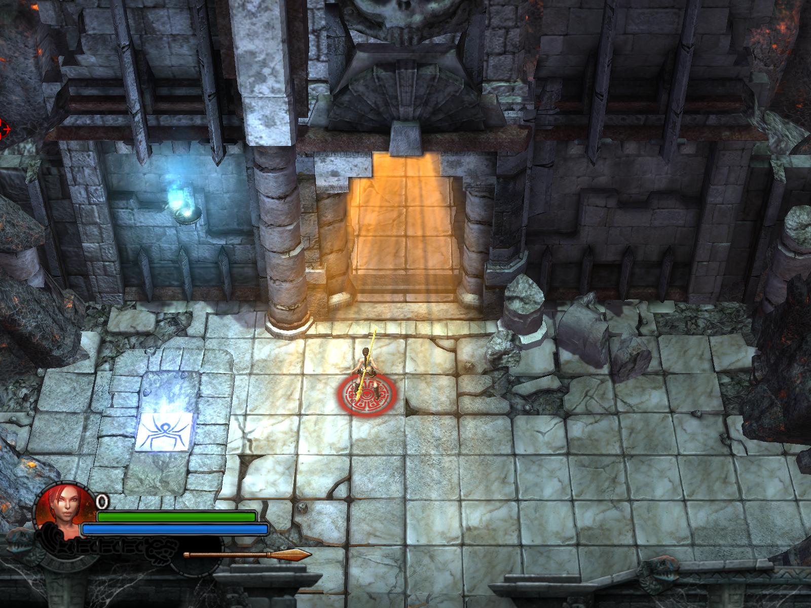 Ha sikerült átérned a kapuhoz, még ne menj ki. Balra robbantsd fel a kriptát, és állj rá a harmadik pókmintás padlólapra. Ez a 3/3.