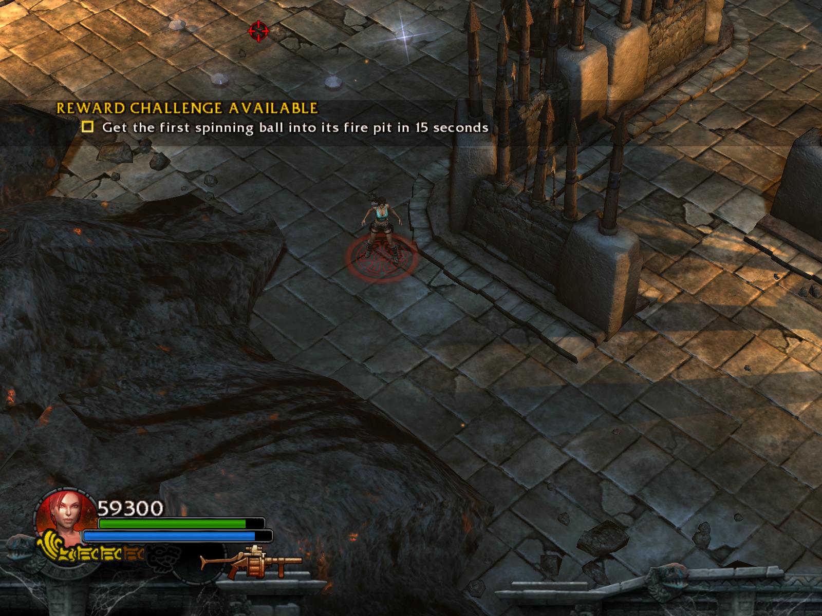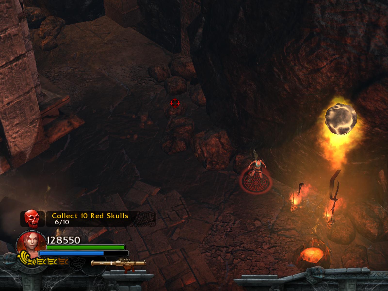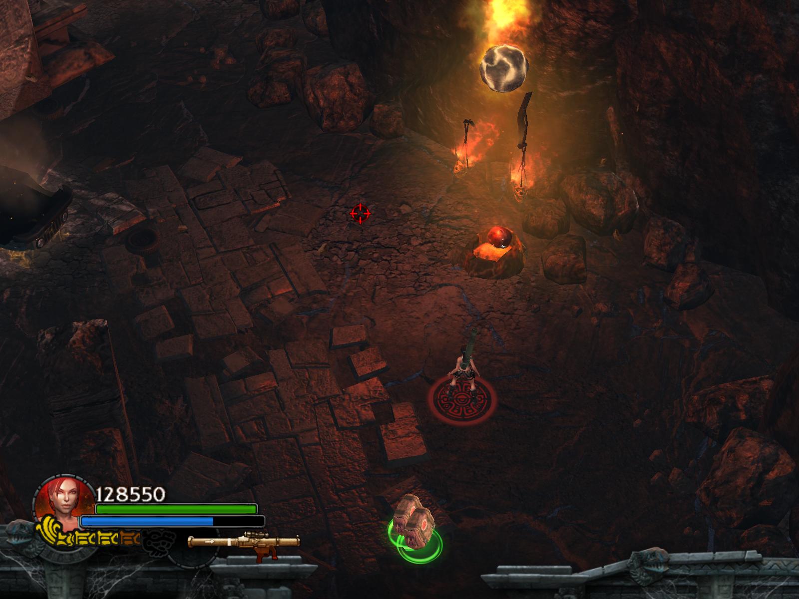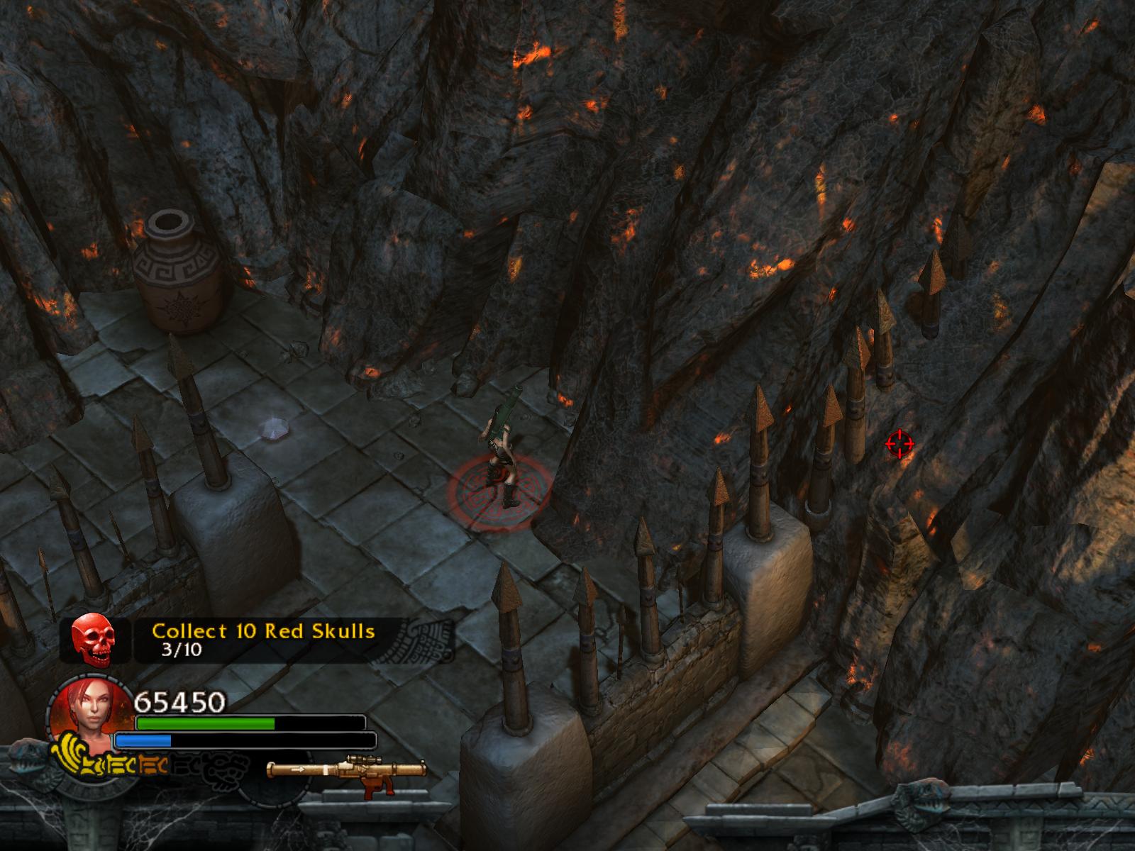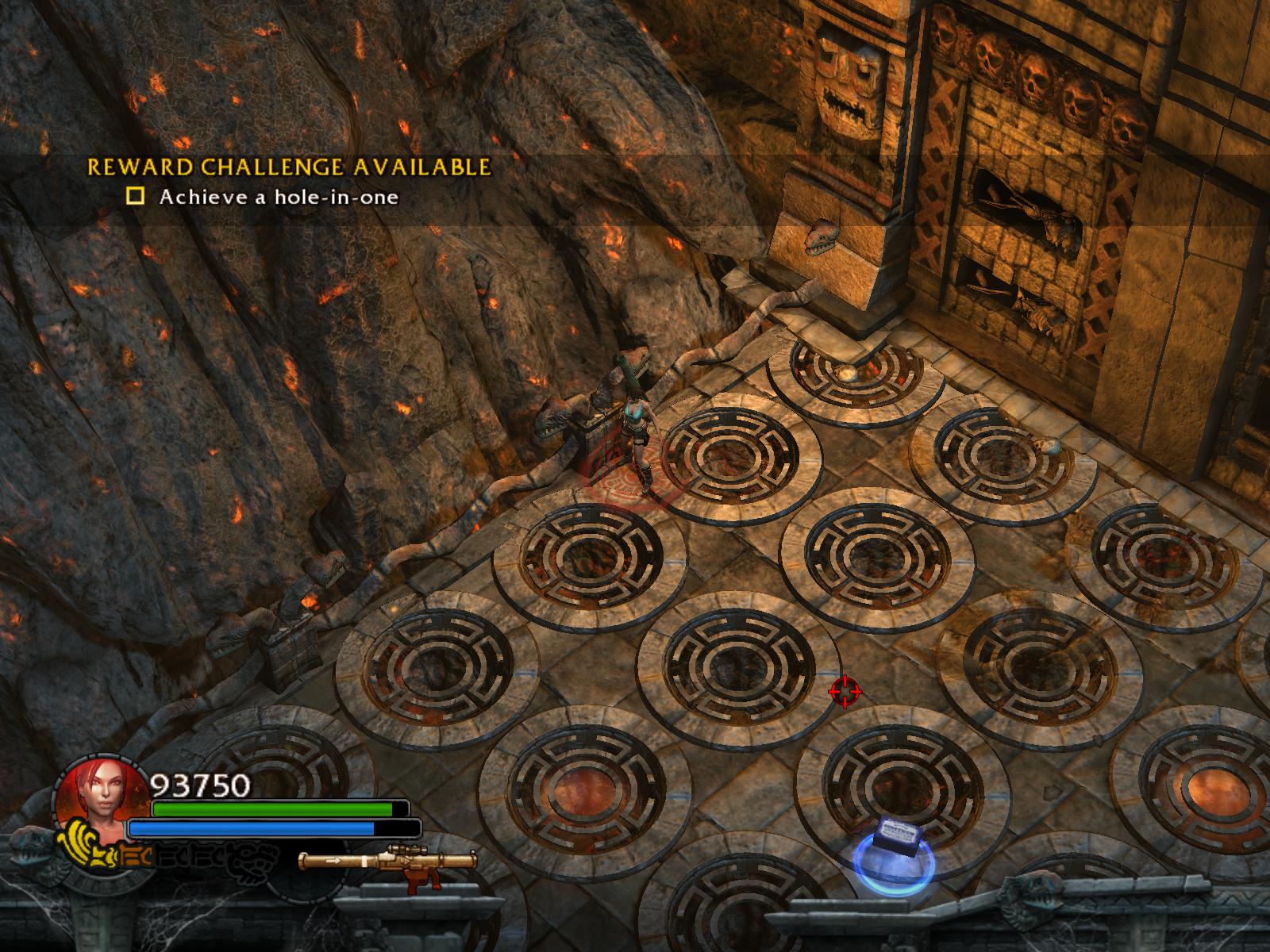 Menj tovább, keresd meg, és menj át a hídon. Végezz a pajzsos döggel, legjobb, ha a TNT-vel robbantasz előbb. Átérve egy lávaóriást is le kell gyűrnöd, pár gyíkkal, és csontival együtt. Menj vissza a pálya elejére, ha végeztél velük, fogd a golyót, és told ide. Told át a másik kőpillér alatt, és lökd le a mélybe. Láthatod, ott van a foglalata. Ess hát le a területre. Öld le a pajzsost, told a golyót a tűzbe. Full életerőt kapsz érte.