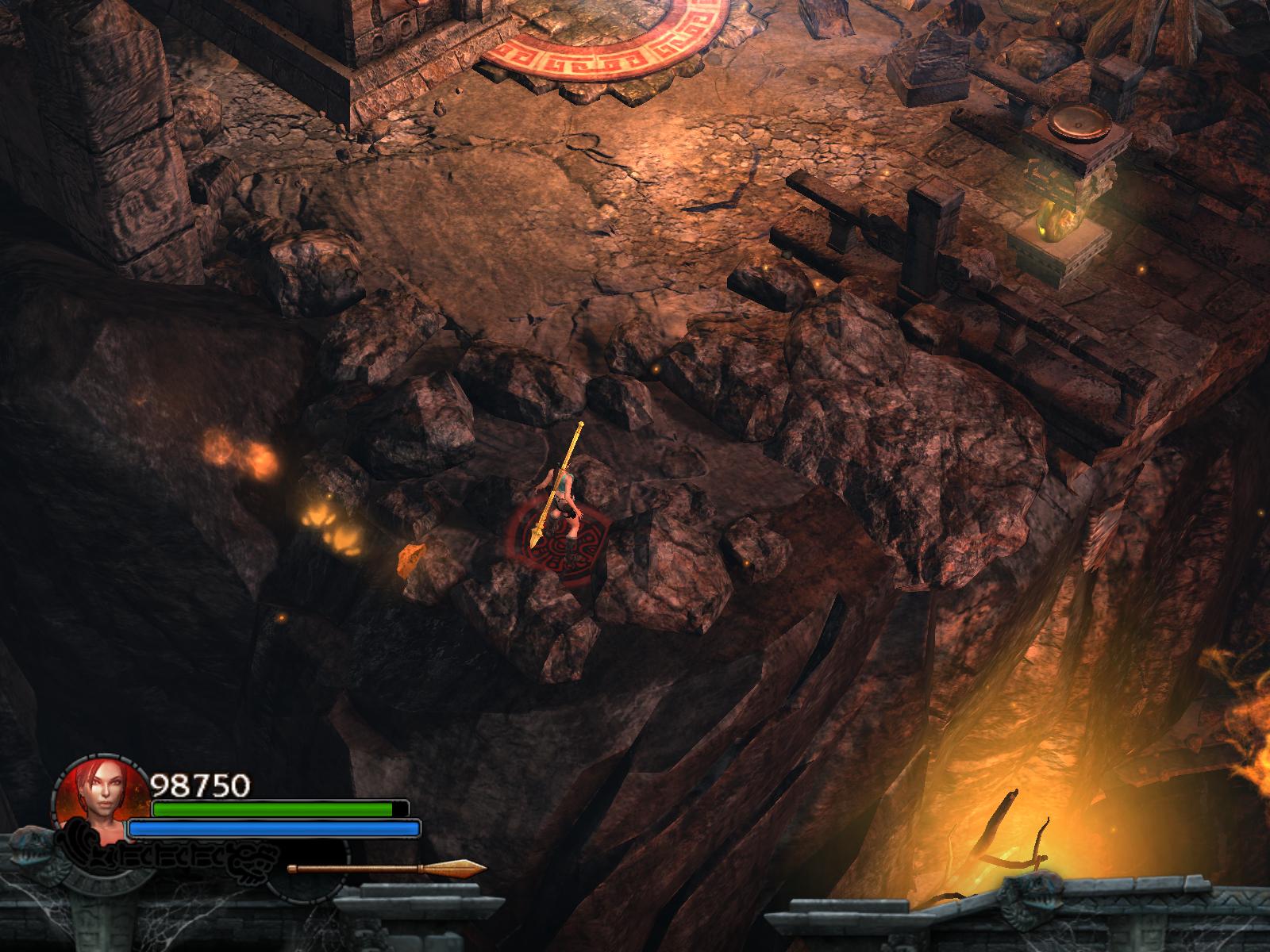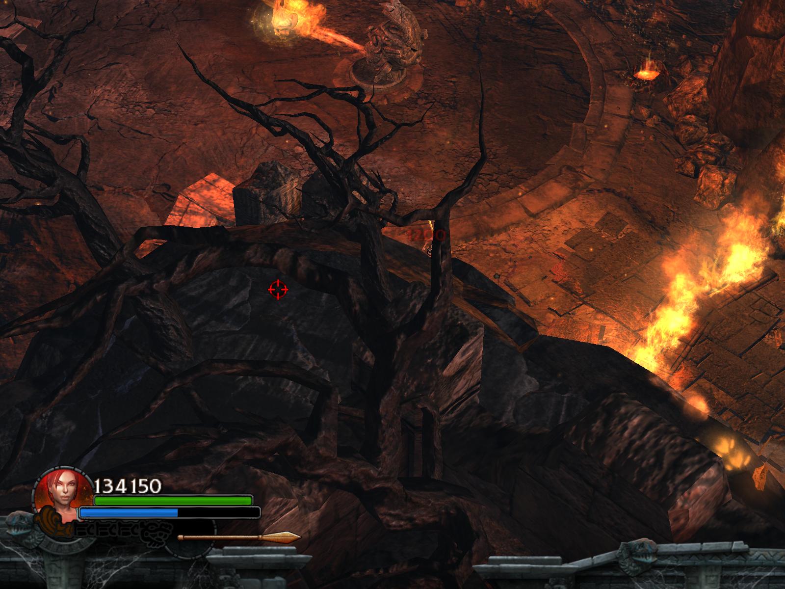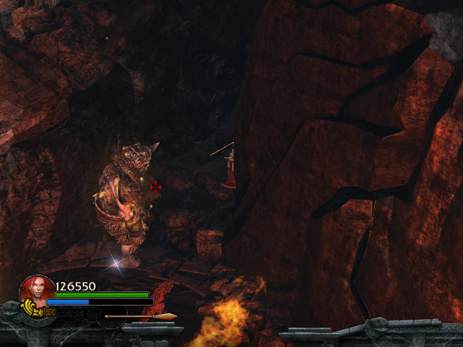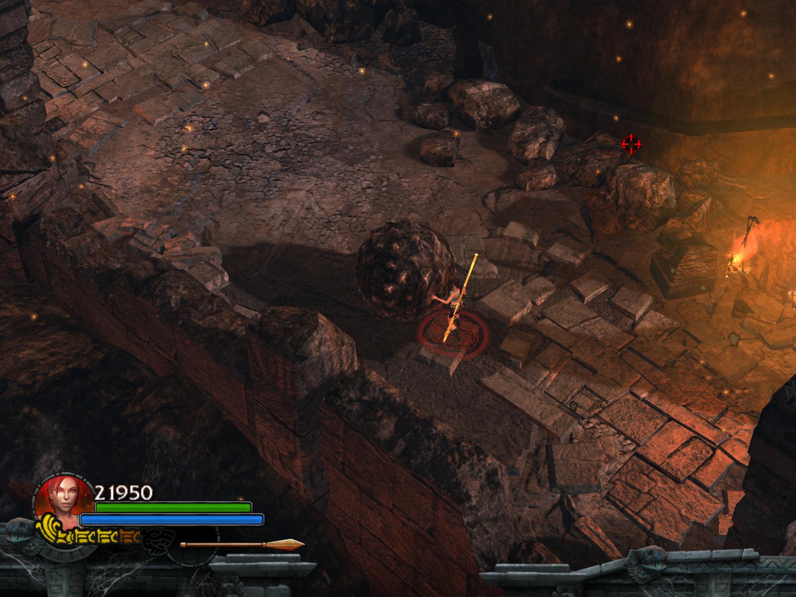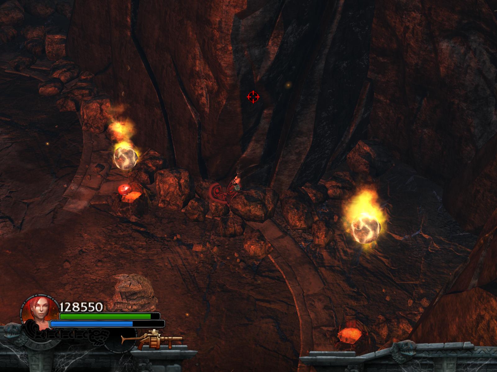 Menj tovább, keresd meg, és menj át a hídon. Végezz a pajzsos döggel, legjobb, ha a TNT-vel robbantasz előbb. Átérve egy lávaóriást is le kell gyűrnöd, pár gyíkkal, és csontival együtt. Menj vissza a pálya elejére, ha végeztél velük, fogd a golyót, és told ide. Told át a másik kőpillér alatt, és lökd le a mélybe. Láthatod, ott van a foglalata. Ess hát le a területre. Öld le a pajzsost, told a golyót a tűzbe. Full életerőt kapsz érte.