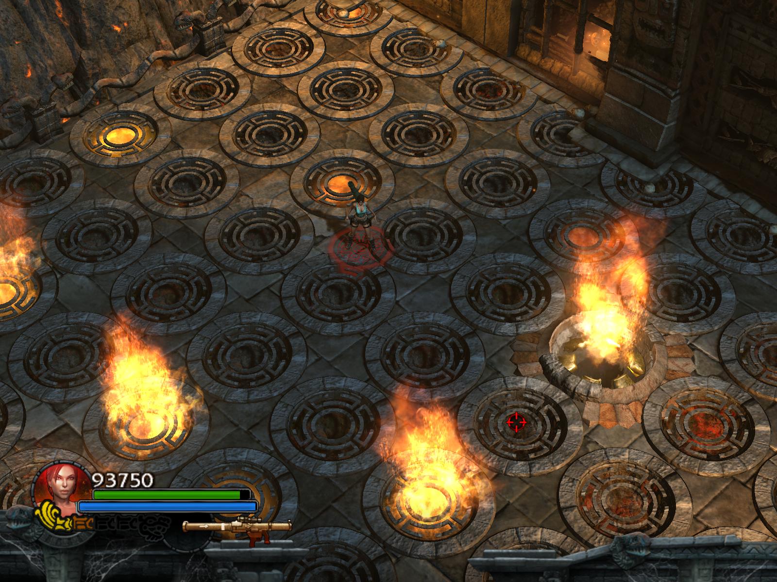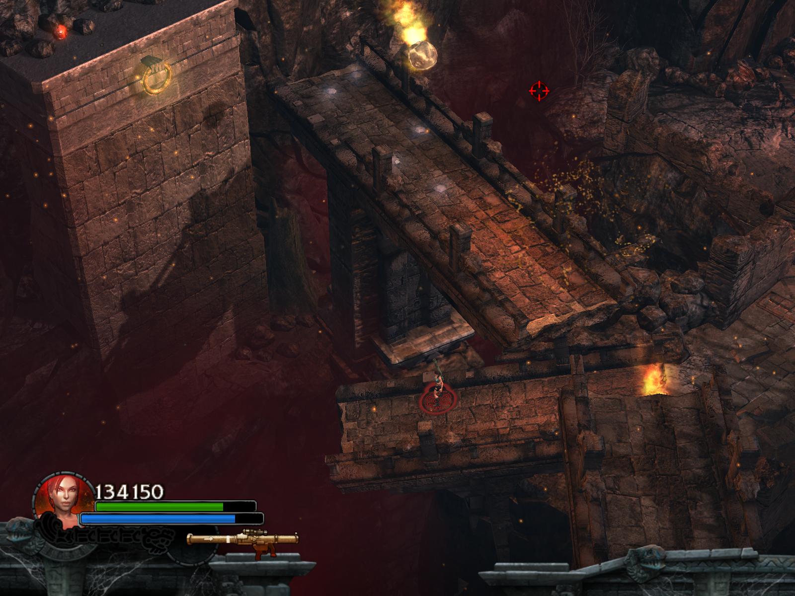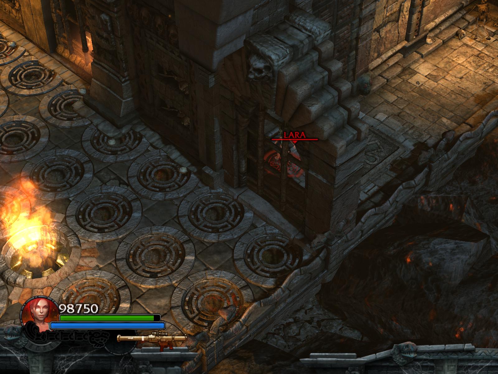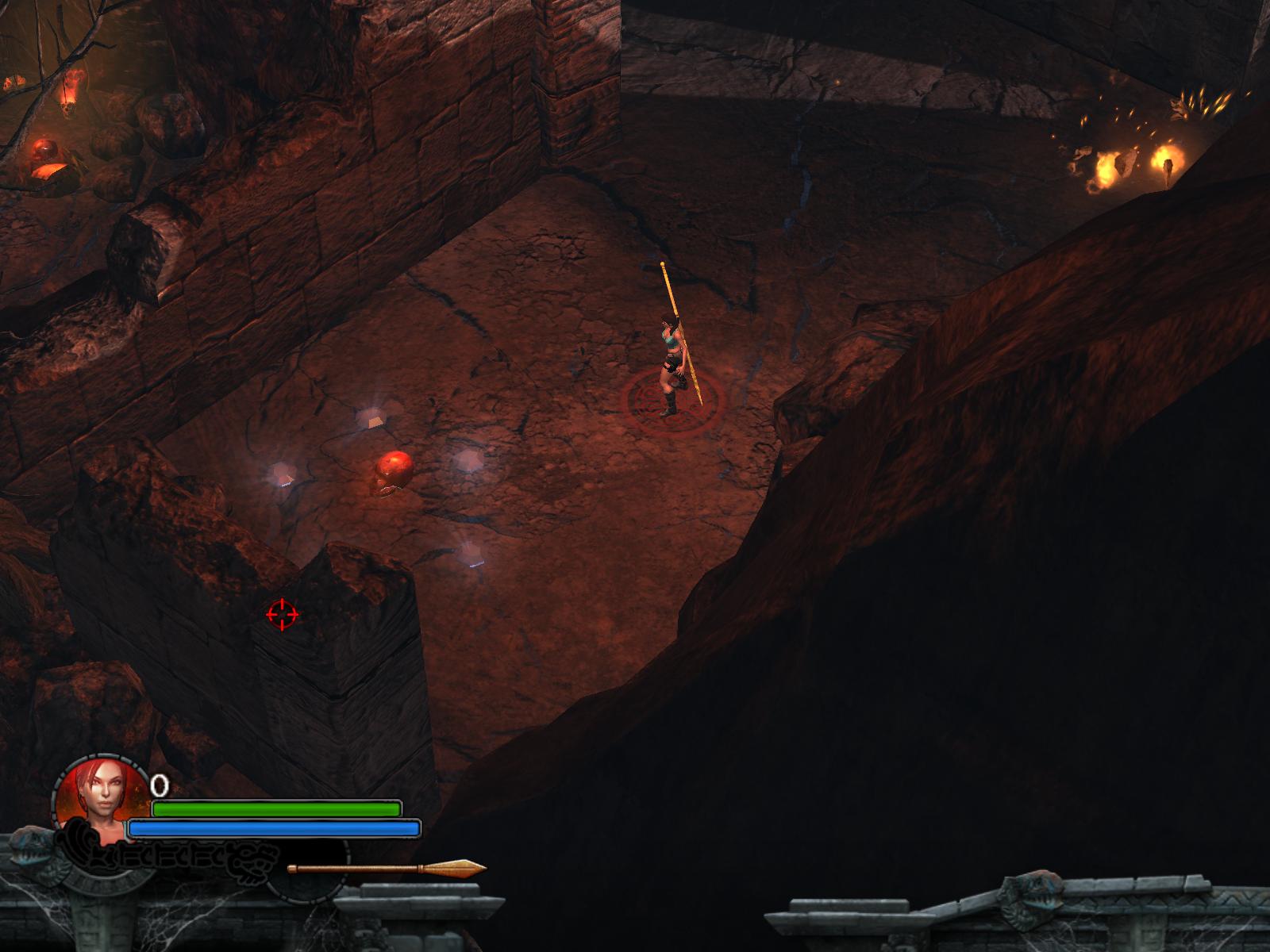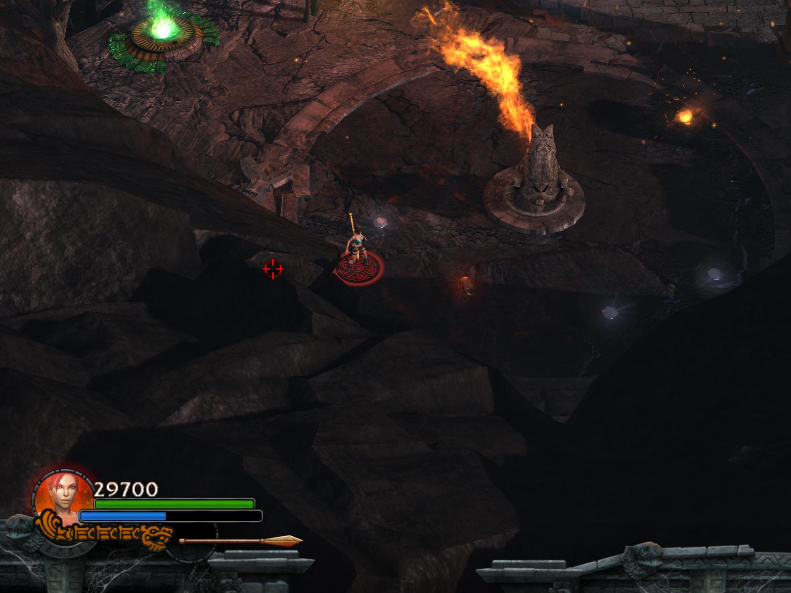 Menj tovább, keresd meg, és menj át a hídon. Végezz a pajzsos döggel, legjobb, ha a TNT-vel robbantasz előbb. Átérve egy lávaóriást is le kell gyűrnöd, pár gyíkkal, és csontival együtt. Menj vissza a pálya elejére, ha végeztél velük, fogd a golyót, és told ide. Told át a másik kőpillér alatt, és lökd le a mélybe. Láthatod, ott van a foglalata. Ess hát le a területre. Öld le a pajzsost, told a golyót a tűzbe. Full életerőt kapsz érte.