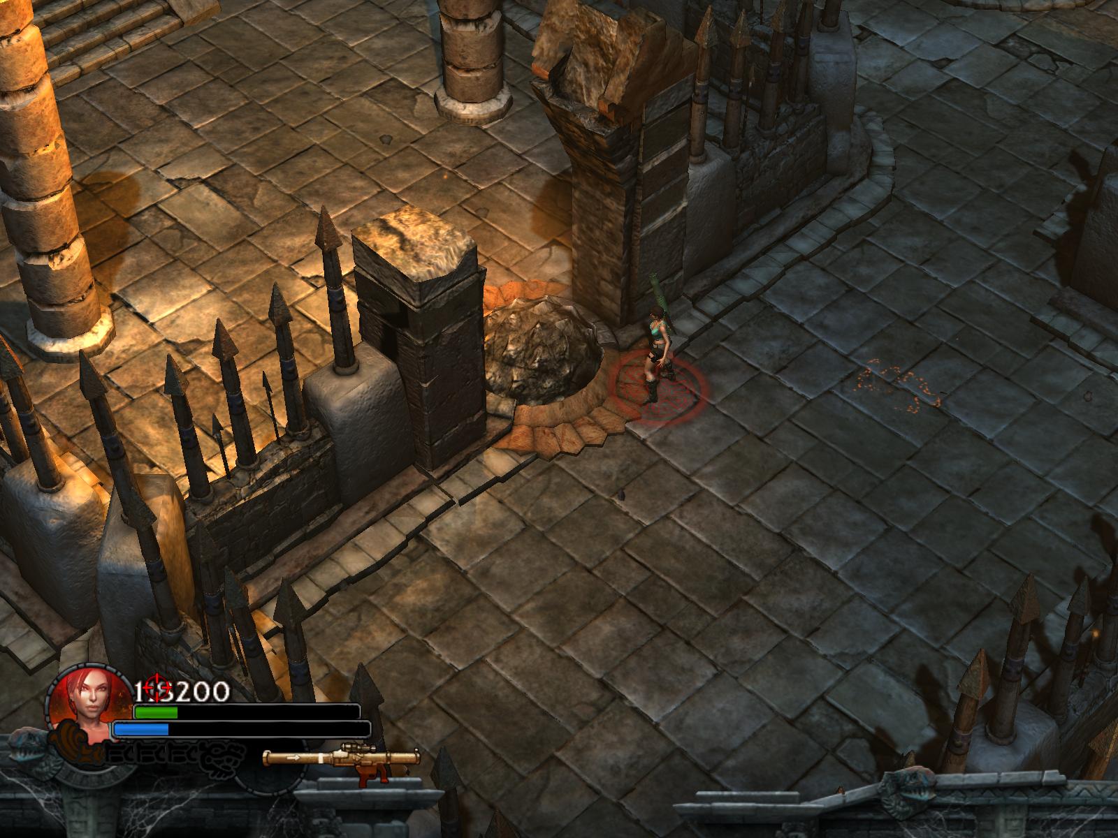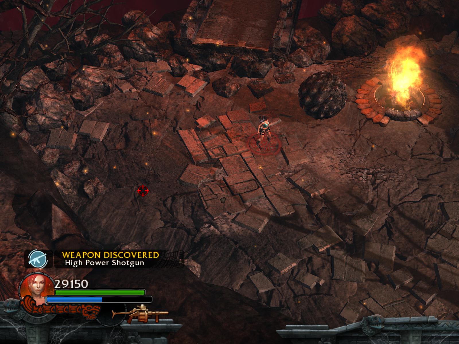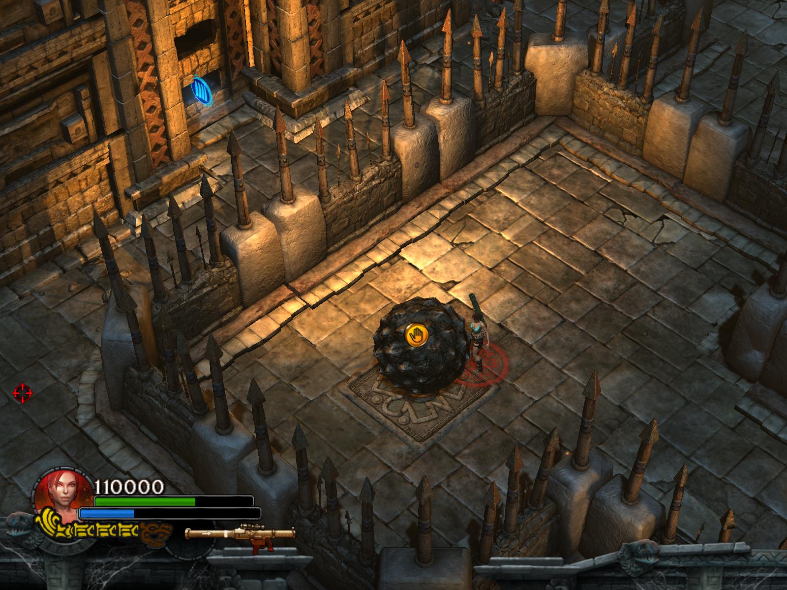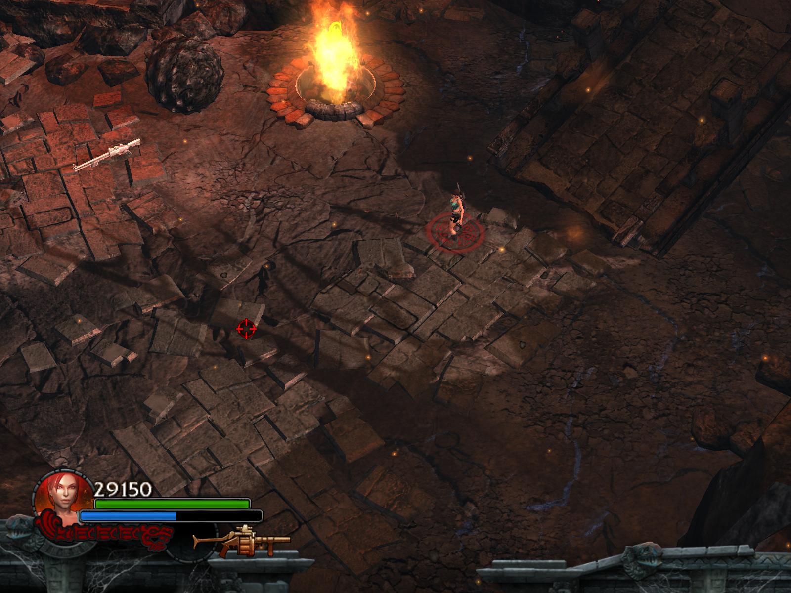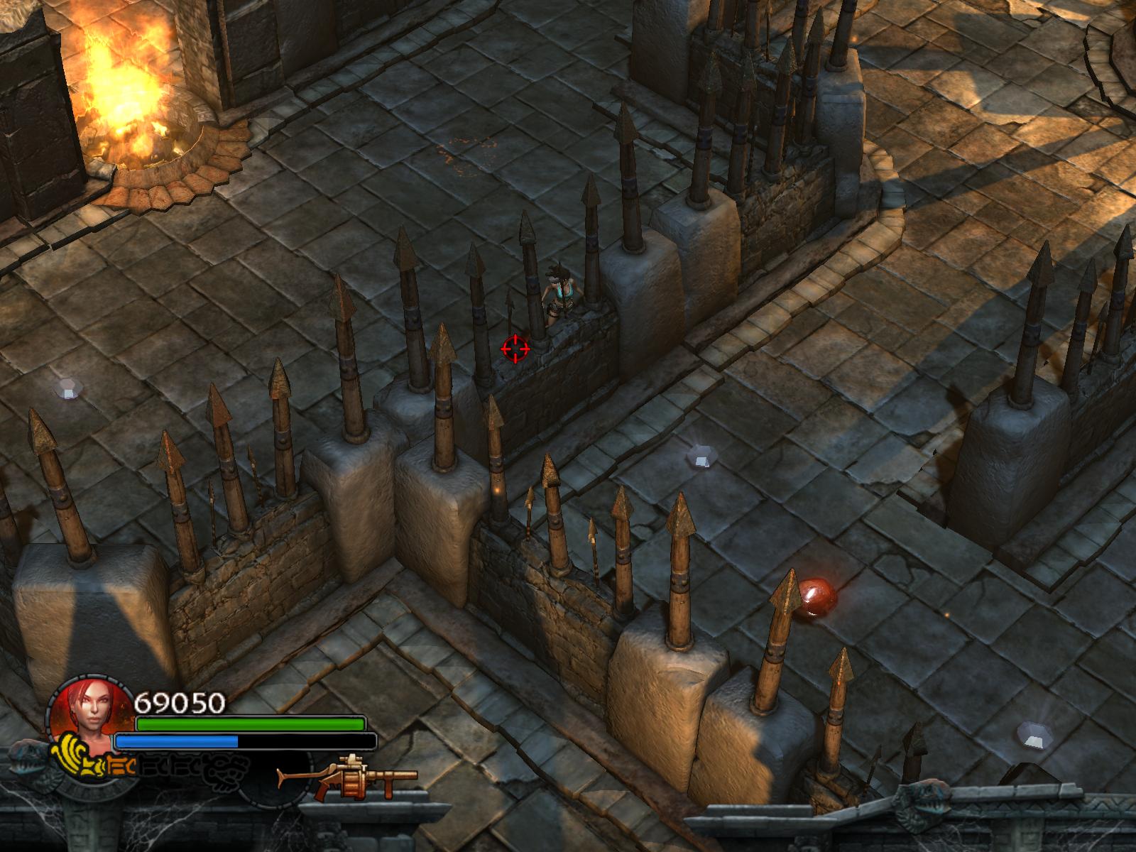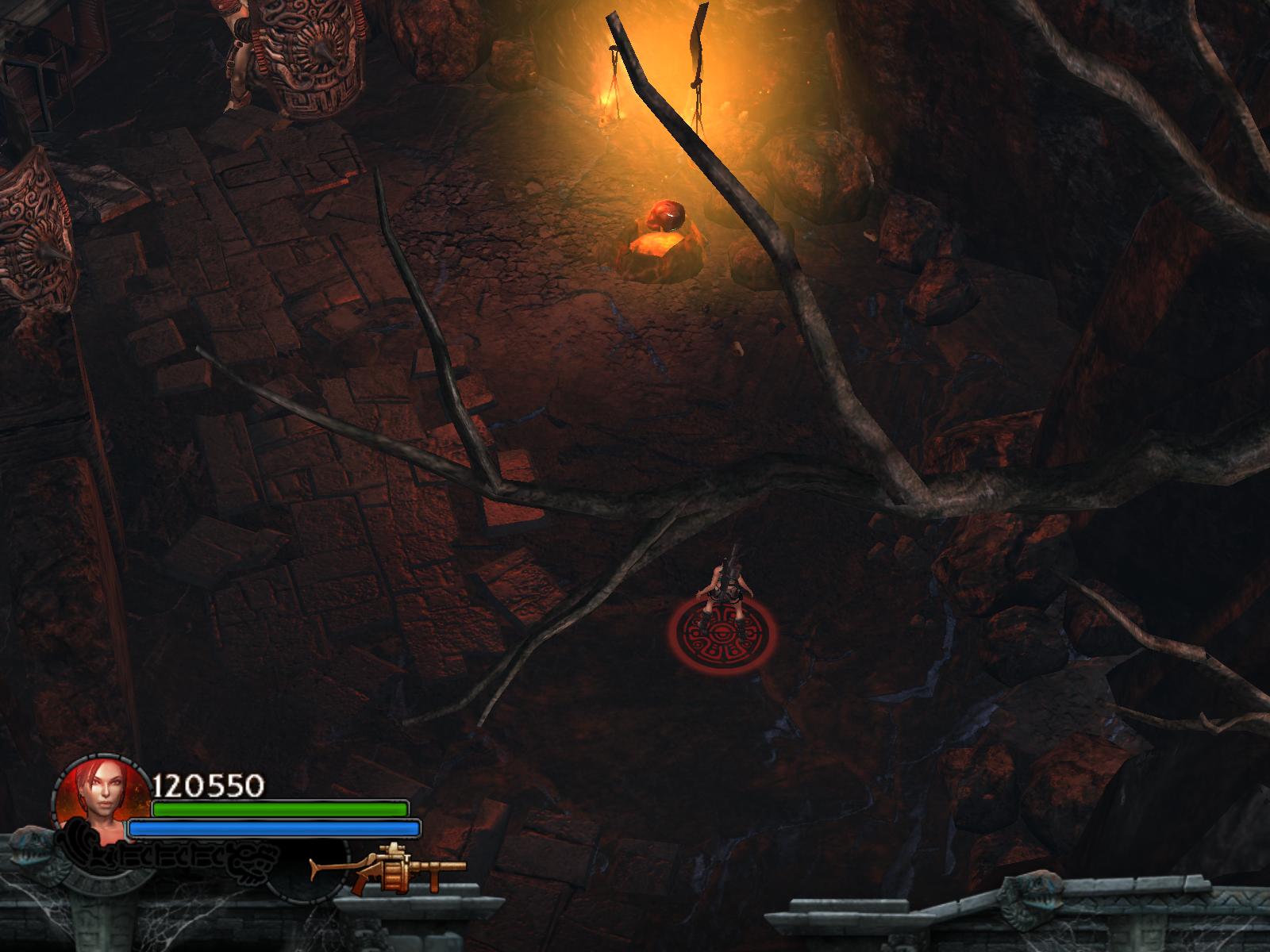 Menj tovább, keresd meg, és menj át a hídon. Végezz a pajzsos döggel, legjobb, ha a TNT-vel robbantasz előbb. Átérve egy lávaóriást is le kell gyűrnöd, pár gyíkkal, és csontival együtt. Menj vissza a pálya elejére, ha végeztél velük, fogd a golyót, és told ide. Told át a másik kőpillér alatt, és lökd le a mélybe. Láthatod, ott van a foglalata. Ess hát le a területre. Öld le a pajzsost, told a golyót a tűzbe. Full életerőt kapsz érte.