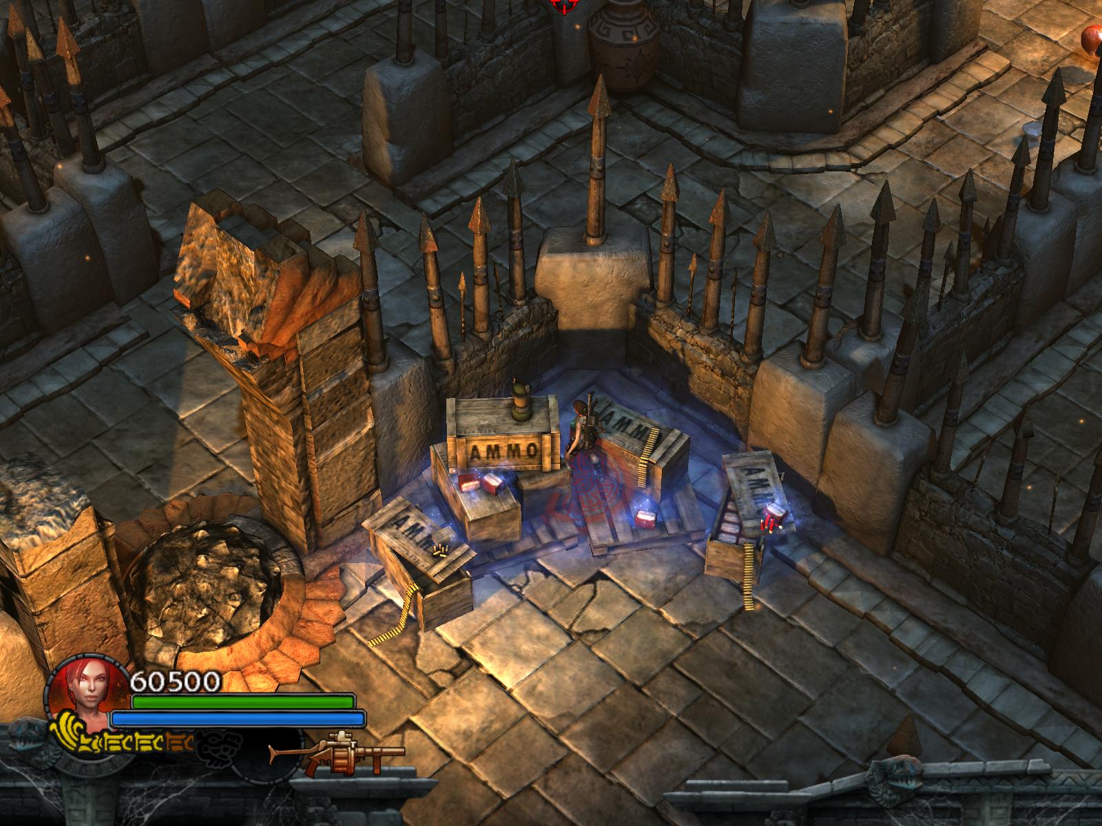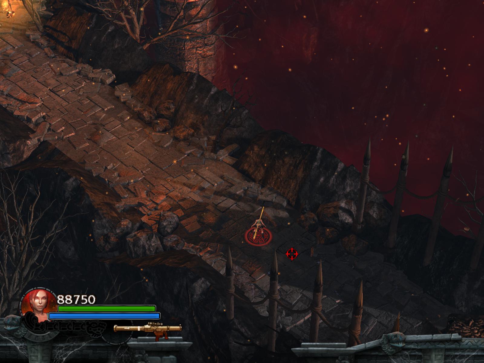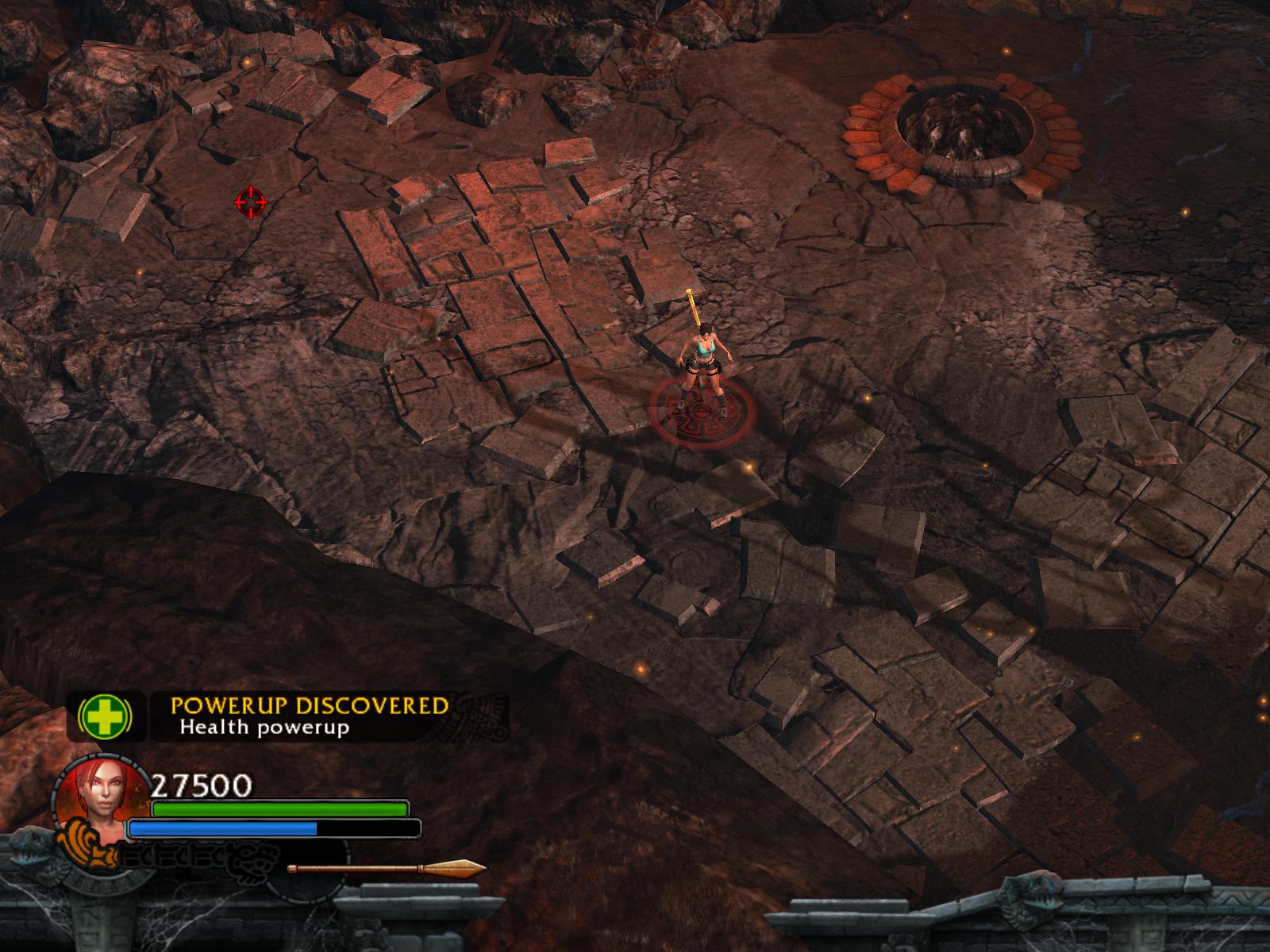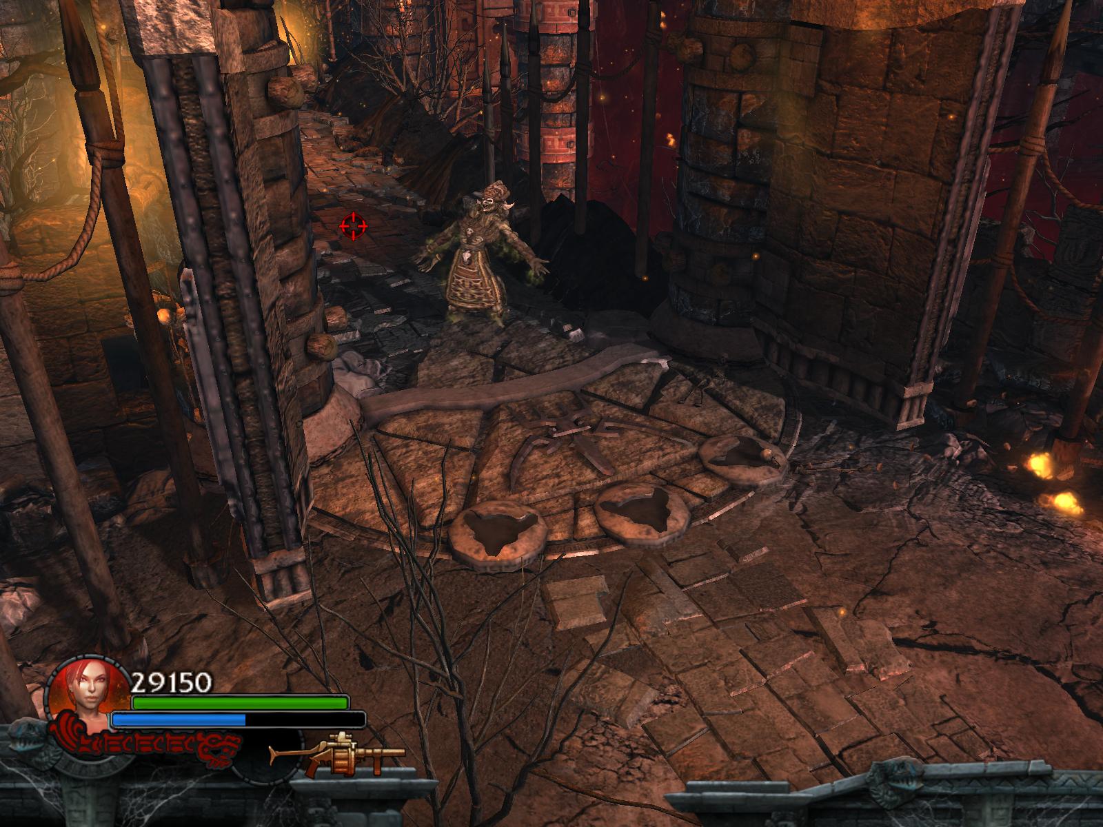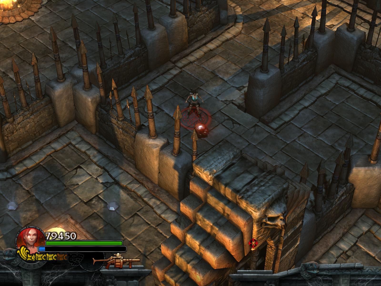 Menj tovább, keresd meg, és menj át a hídon. Végezz a pajzsos döggel, legjobb, ha a TNT-vel robbantasz előbb. Átérve egy lávaóriást is le kell gyűrnöd, pár gyíkkal, és csontival együtt. Menj vissza a pálya elejére, ha végeztél velük, fogd a golyót, és told ide. Told át a másik kőpillér alatt, és lökd le a mélybe. Láthatod, ott van a foglalata. Ess hát le a területre. Öld le a pajzsost, told a golyót a tűzbe. Full életerőt kapsz érte.