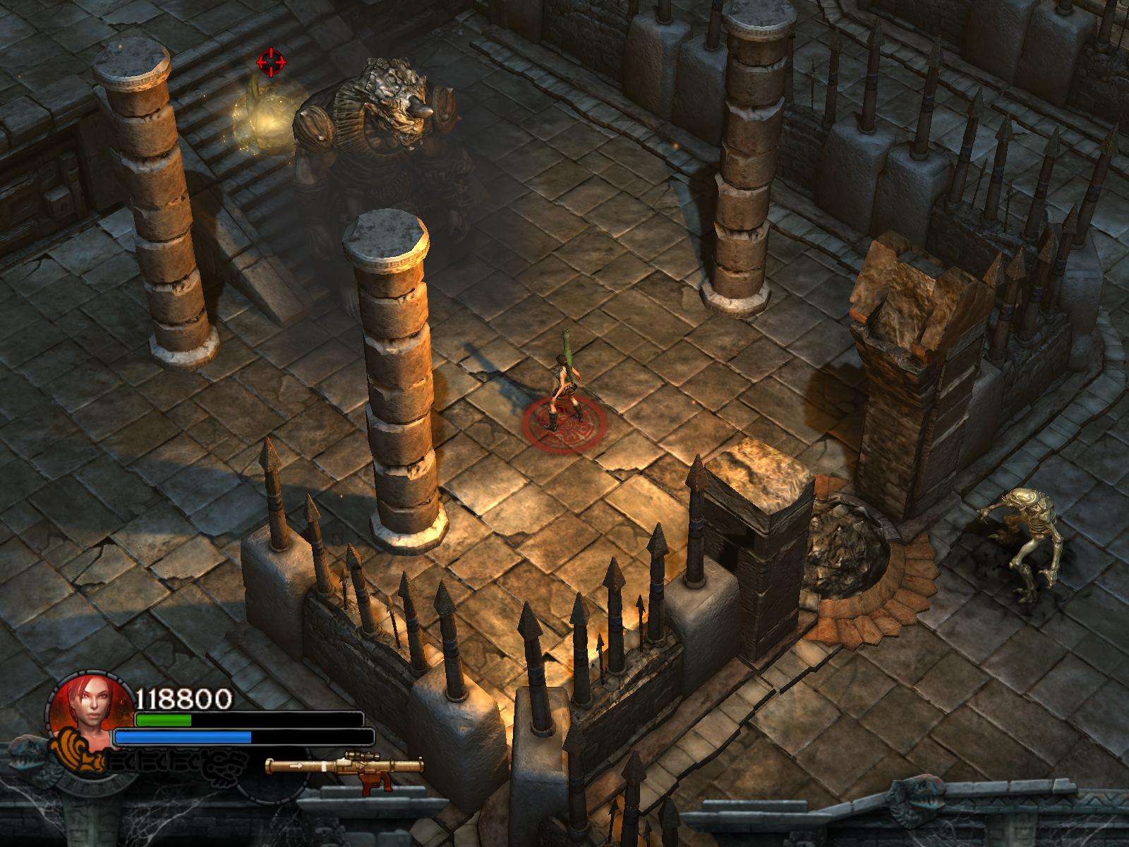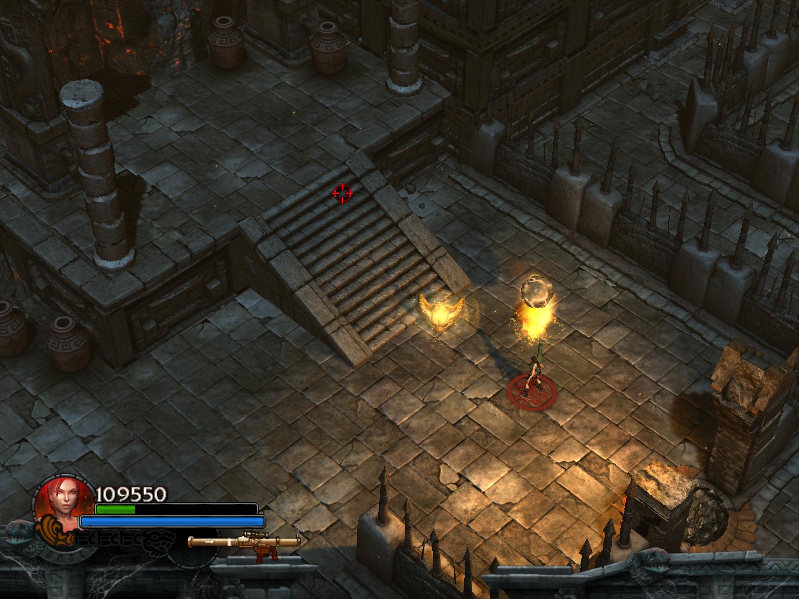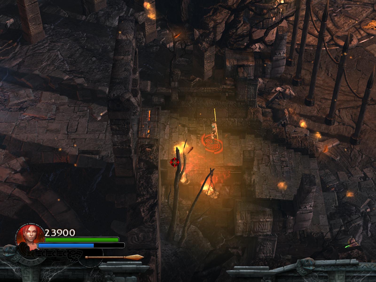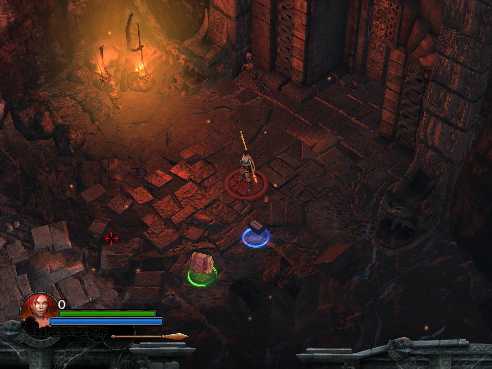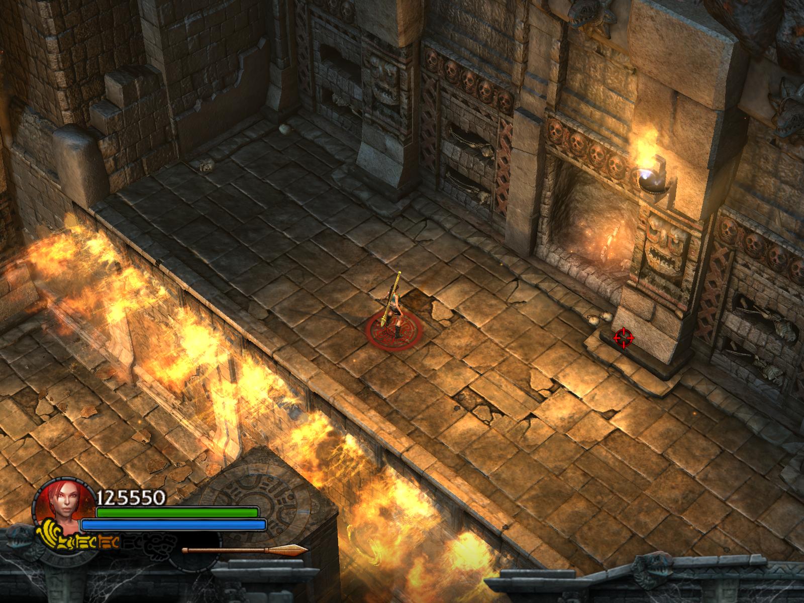 Menj tovább, keresd meg, és menj át a hídon. Végezz a pajzsos döggel, legjobb, ha a TNT-vel robbantasz előbb. Átérve egy lávaóriást is le kell gyűrnöd, pár gyíkkal, és csontival együtt. Menj vissza a pálya elejére, ha végeztél velük, fogd a golyót, és told ide. Told át a másik kőpillér alatt, és lökd le a mélybe. Láthatod, ott van a foglalata. Ess hát le a területre. Öld le a pajzsost, told a golyót a tűzbe. Full életerőt kapsz érte.