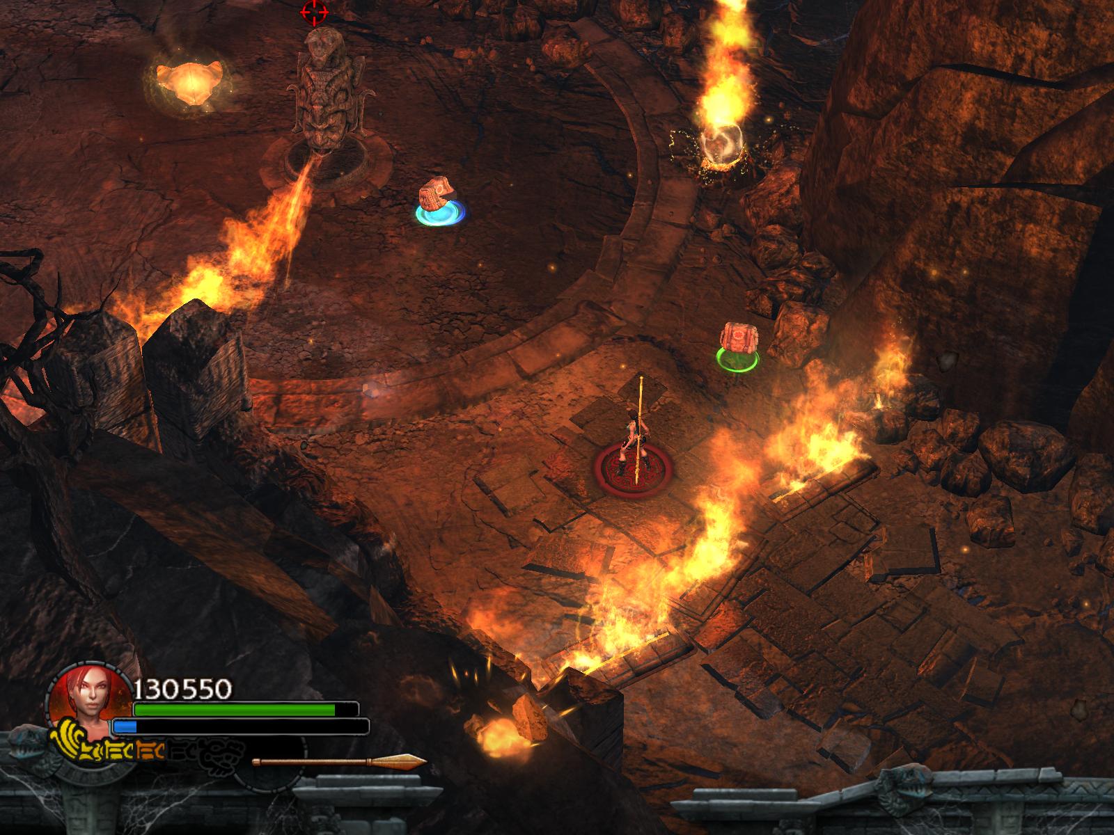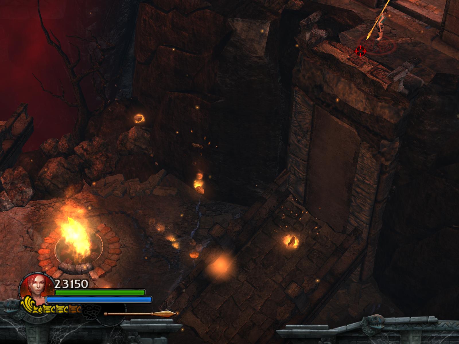 Menj most második forgó tűz mögé, és dobj egy lándzsát a jobb oldali falba. Ráugorva feljutsz a sziklatetőre, és bemehetsz a fényes kapun. Ugyanezt elérheted a kis oldalvölgyből is, ott is lándzsa segítségével. Majd felugorva megcsáklyázhatod a fenti karikát. Így is feljutsz. Lépj rá a súlykapcsolóra, és rohanj be a terembe. Öld le a tűzóriást, robbantsd le a karról a golyót. Ne felejtsd el, a tűzfújók közötti kis részek biztonságosak, még ha melletted kigyullad az összes, akkor is. Menj hát, fogd meg a golyót, és told a foglalatába.