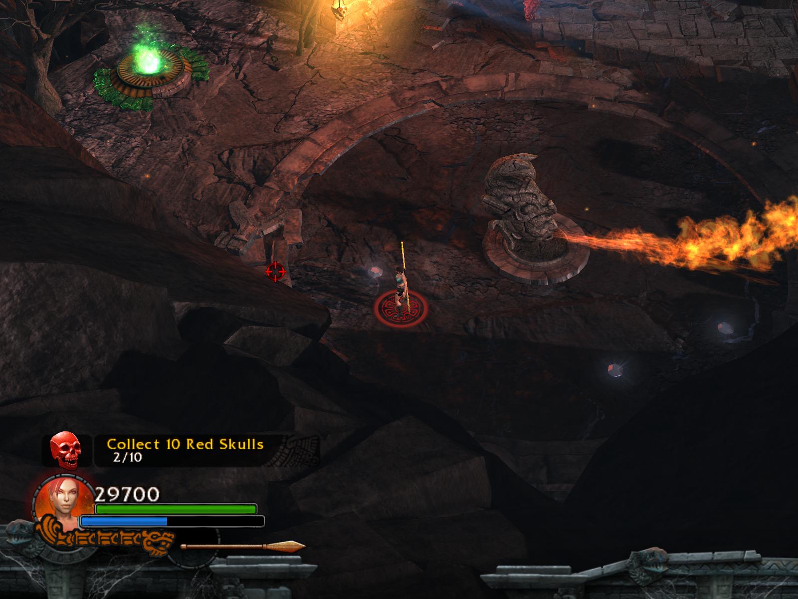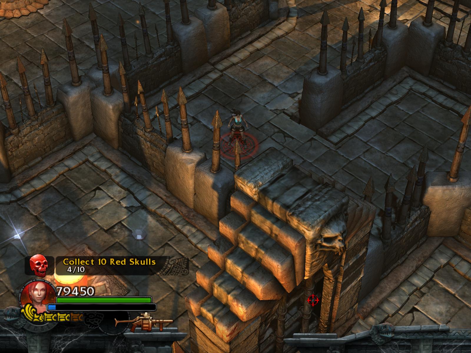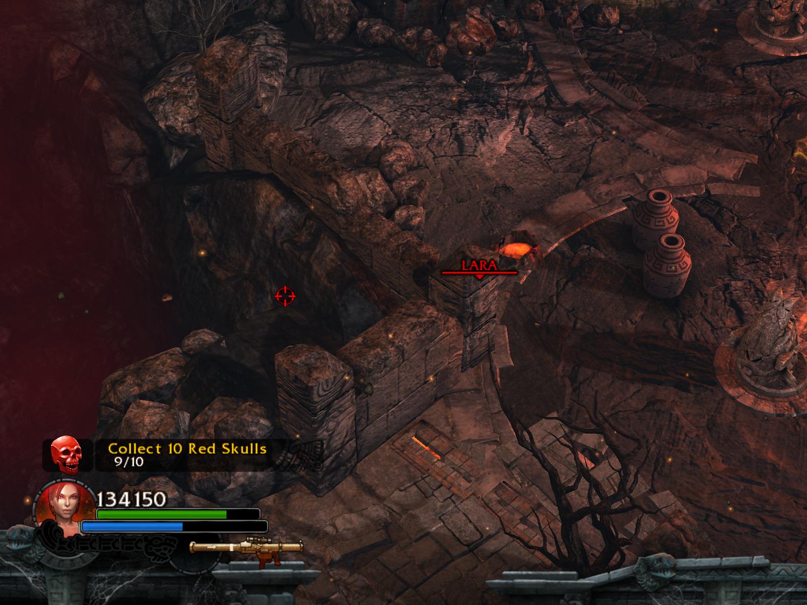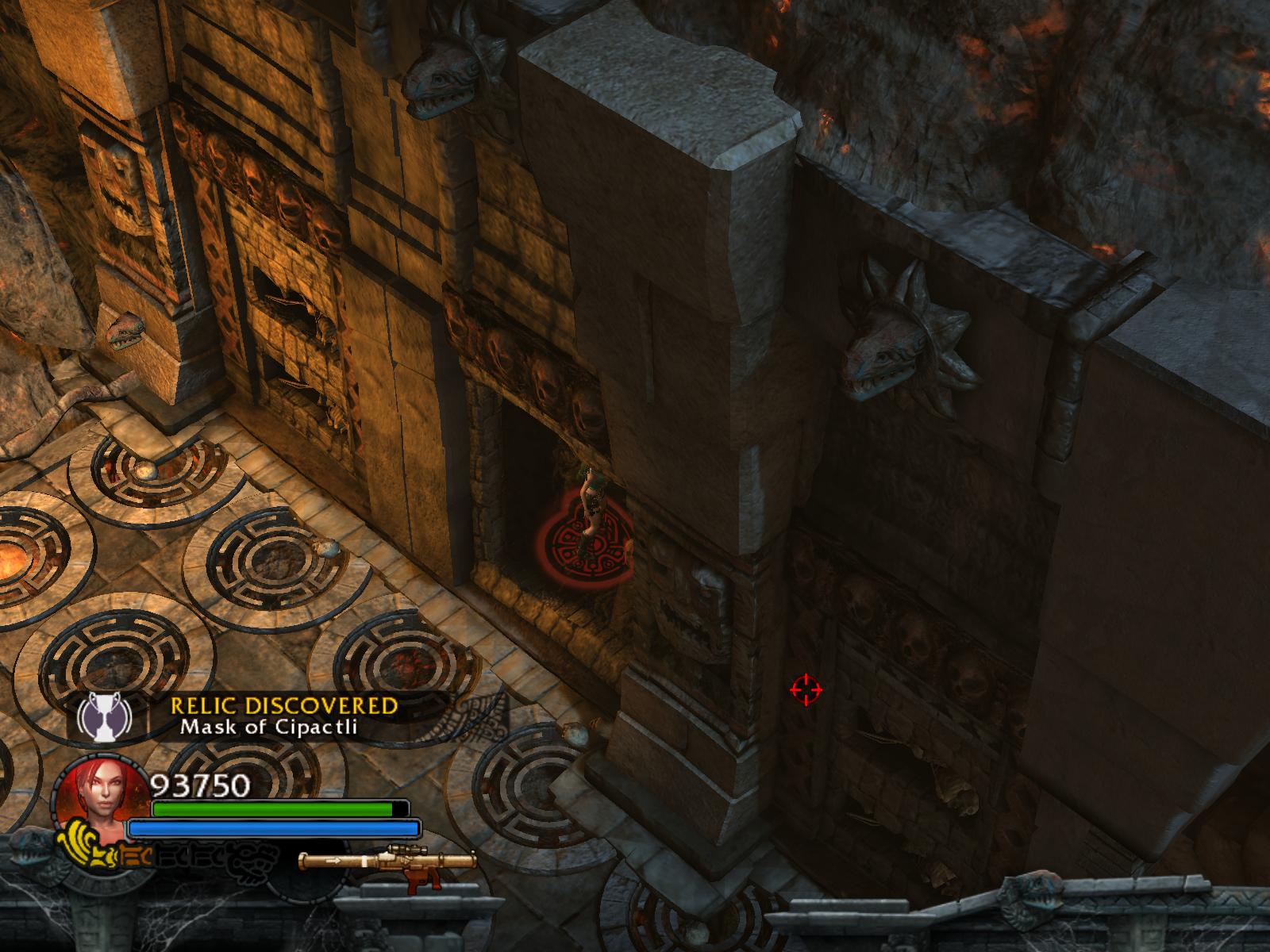 Ebből hármat kell összeszedni, hogy jutalmat kapj érte. Menj fel balra a kis emelkedőn. Először menj fent jobbra, és egy fényes kapujú épület elé értél. Ha az oszlopokba dobott lándzsákon át felmész a tetejére, életerőt, lőszert szerezhetsz. Az épület mellett balra, egy forgó tűzfújót találsz. Várd meg, amíg elforog, és szedd össze, amit tudsz, közötte a 2.Vörös Koponyát.