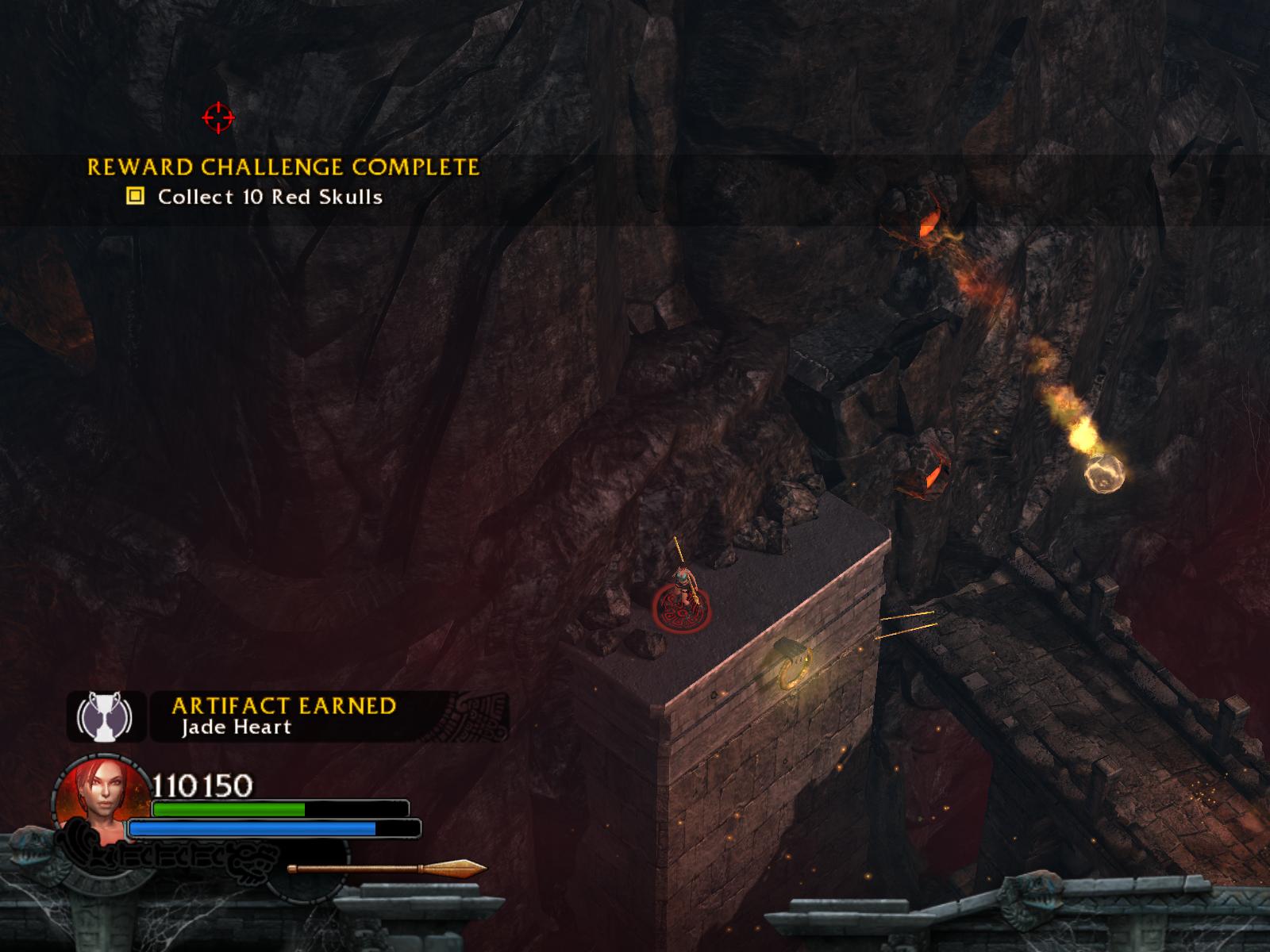 Menj ki, és le a sziklák alá, mássz le a csáklya segítségével. Menj át a forgó tüzeken, a törött híd végére. Csáklyázd meg a falon a karikát. Mássz kicsit fel, lengesd be magadat és landolj a törött hídon. Szedd össze a kristályokat, majd dobj egy lándzsát a falba, így azon keresztül feljutsz a tetőre, és megvan az utolsó, a 10.Vörös Koponya.