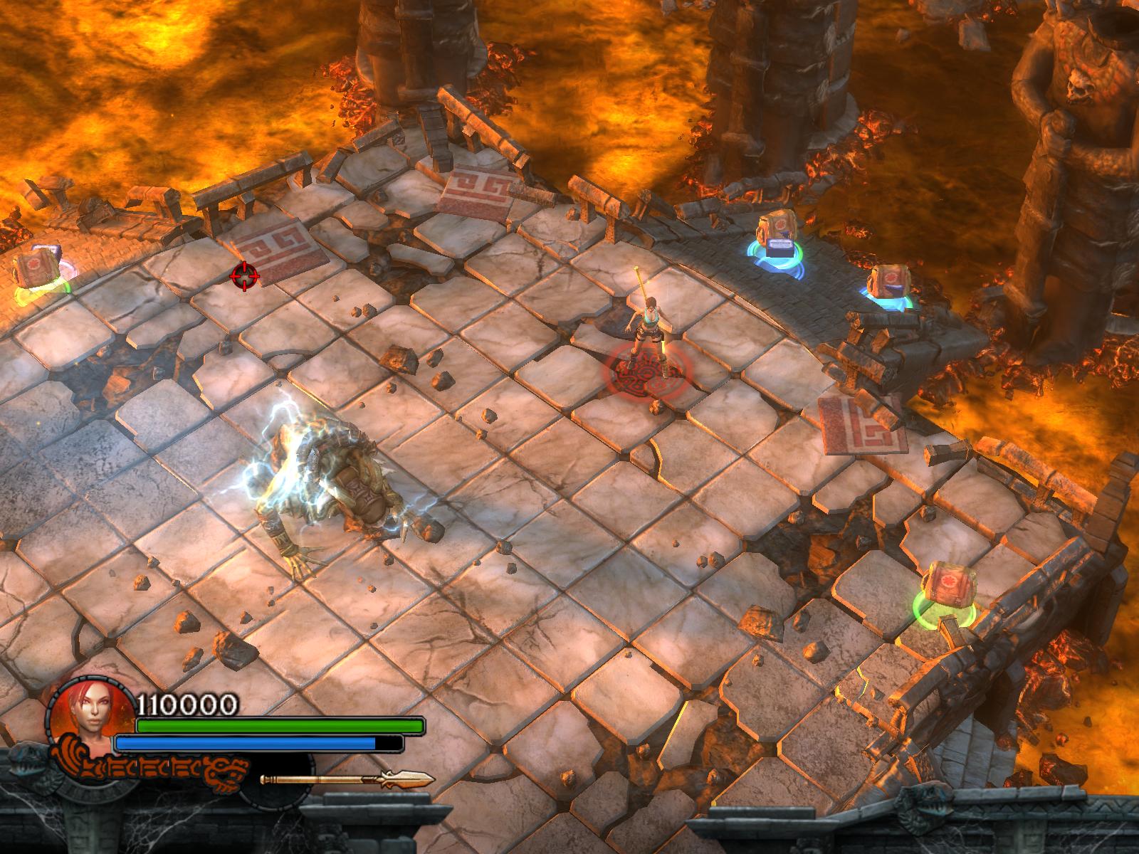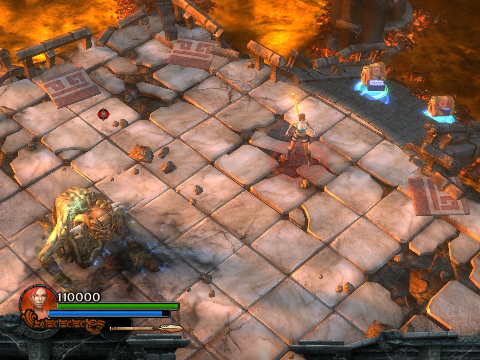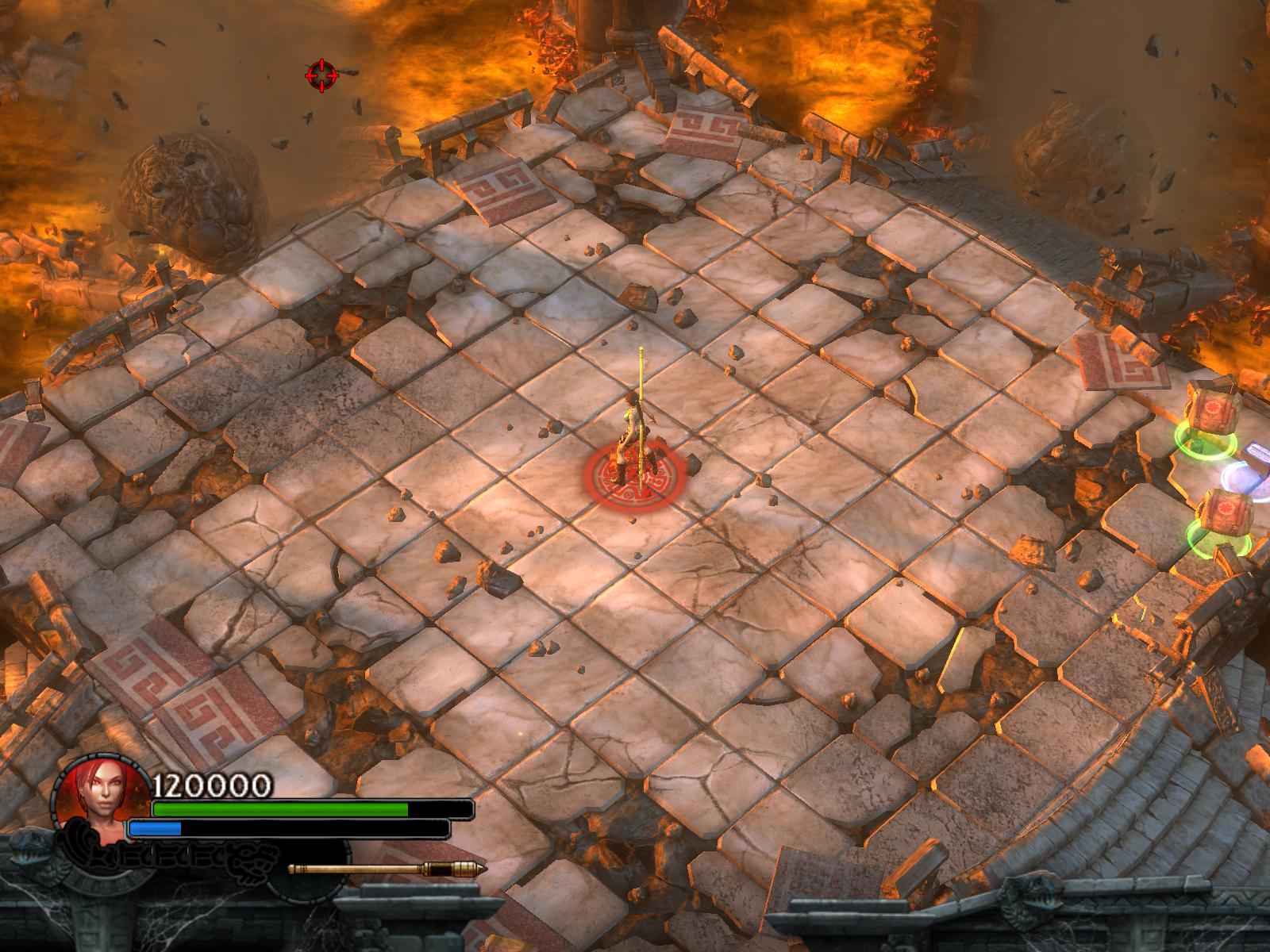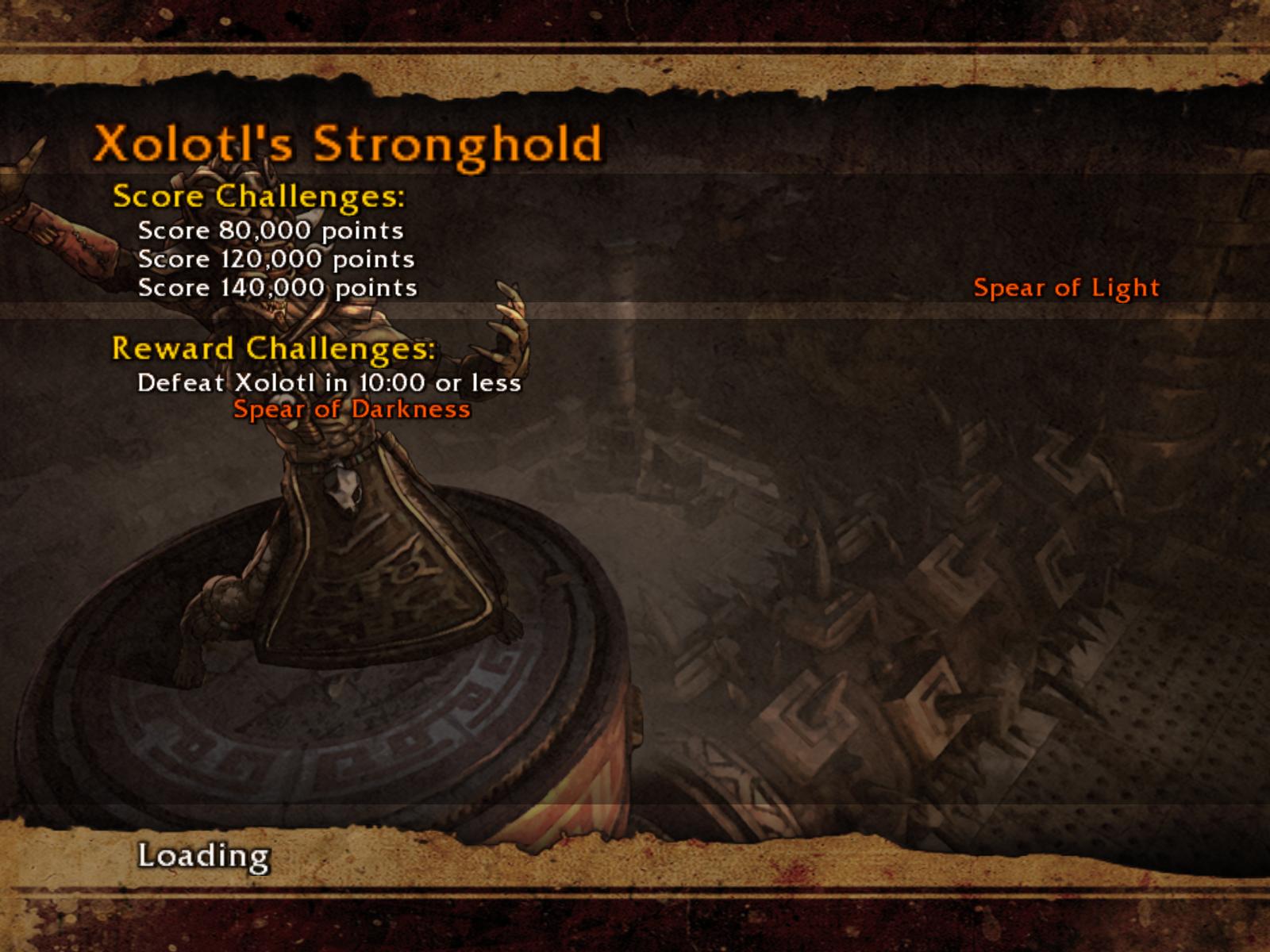 No akkor induljon a menet. Menj, és ugorj le a küzdőtérre. Megjelenik Xolotl, és működésbe hozza a csapdákat. Látod előre a felvillanó körökből, melyik padlólapok lesznek tüskések. Kerüld el azokat, de közben lőnöd is kell az istent, amikor két oldalt megjelenik. Ha elfogyott az energiacsíkja elmegy feltölteni magát, de addig is, pókok özöne ront rád, és a csapdák még ekkor is működnek. Még egyszer le kell csapolnod az energiacsíkját. A végén felmegy az emelvényére a főisten, és rád indítja a hengert. Óvatosan menj ki a tér oldalára, és amikor elment a henger, menj mögé, és ezzel vége is az első küzdelemnek. Van más mód is. Tegyél egy bombát a henger útjába, robbantsd fel amikor odaér, és a felemelkedett henger alatt futva átérsz. Ha nem bírod a gyűrődést, innen itt egy Mentés (Savegame)