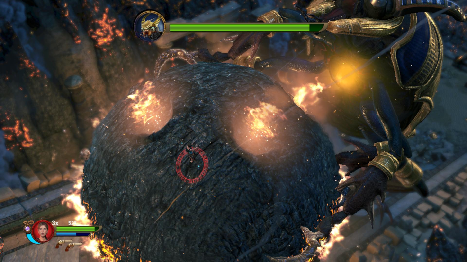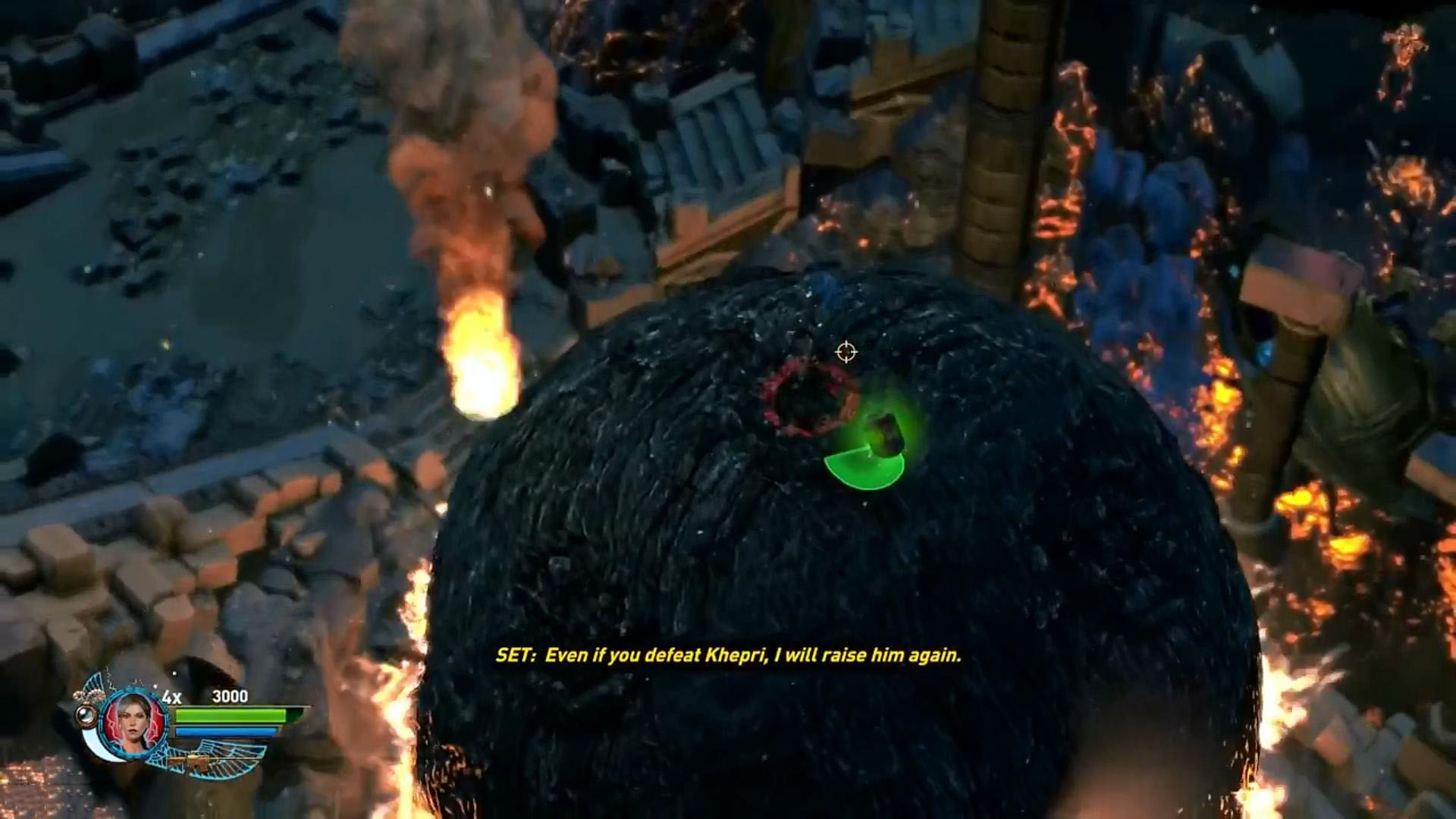 Menj fel a lépcsőkön, és menj be a zöld fénnyel fénylő kapun. Töltsd fel magadat mindennel, elő a legjobb fegyvereddel, és menj a lávából kimagasló hatalmas nagy golyóra. Megjelenik a szkarabeuszok anyukája, a rohadt ganajtúró bogarak istene, maga Khepri. Nem egyszerű kinyírni, de van mód rá. :)
