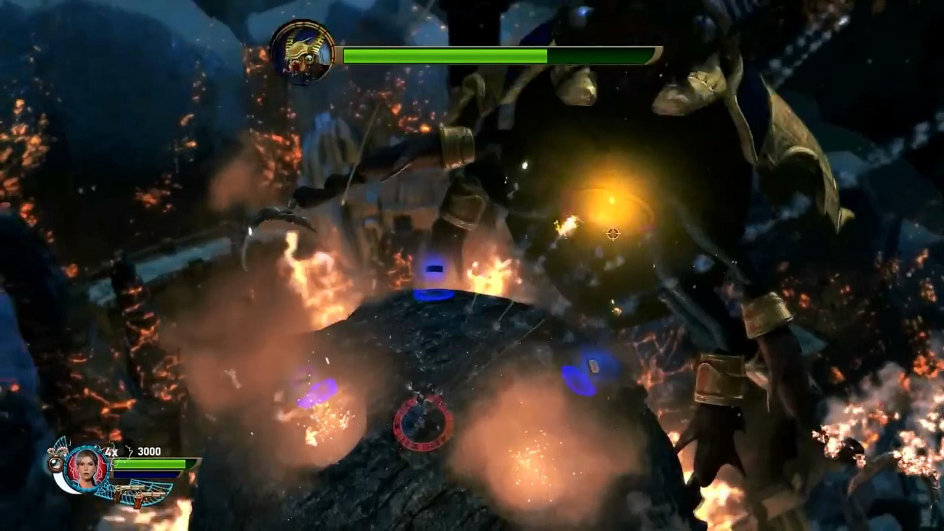 A két karmán sérülékeny. Tégy tehát egy bombát a karmához, és robbantsd fel. Háháh…….. nem tetszett az anyukának, fáj kicsi praclija. Felágaskodik, és feltűnik a mellén egy fénylő folt. Nosza oda célozz, és sorozd meg. Addig kell lőni, amíg életcsíkja lemegy egy harmaddal. Igen, majd háromszor kell ezt megcsinálni. No ha lement, akkor leesik a galacsinról, és az elkezd gurulni. Azért úgy intézd, hogy kerüld el a lávafolyásokat, kicsi fénylő lyukakat a golyón, és akkor meg fogod kapni a végén a Max Ammo Upgrade-t.