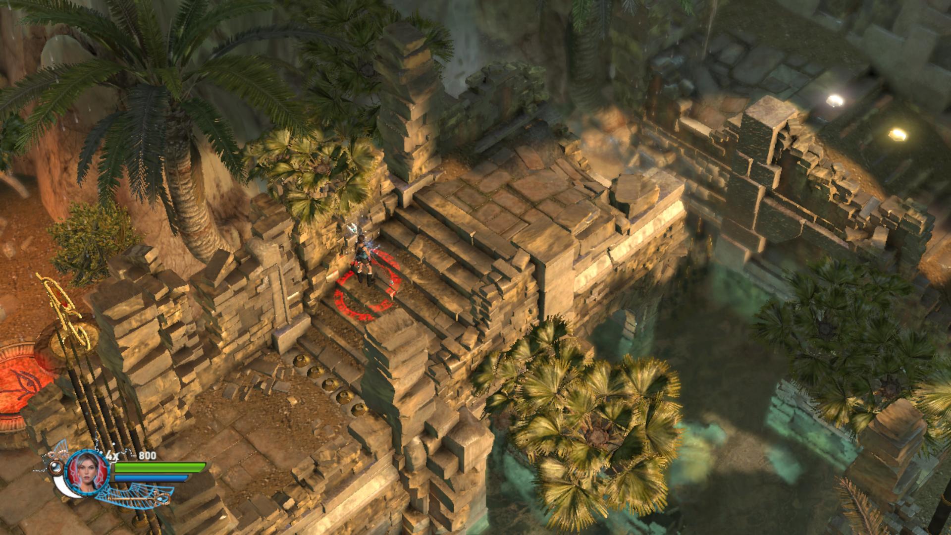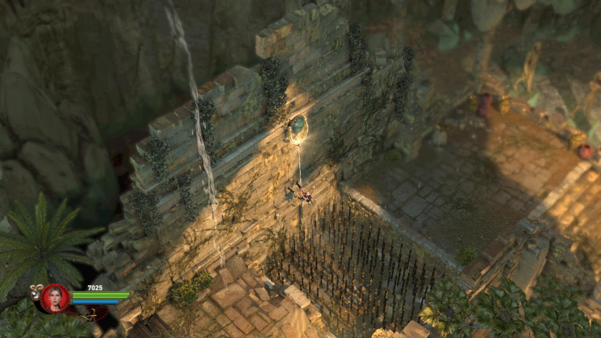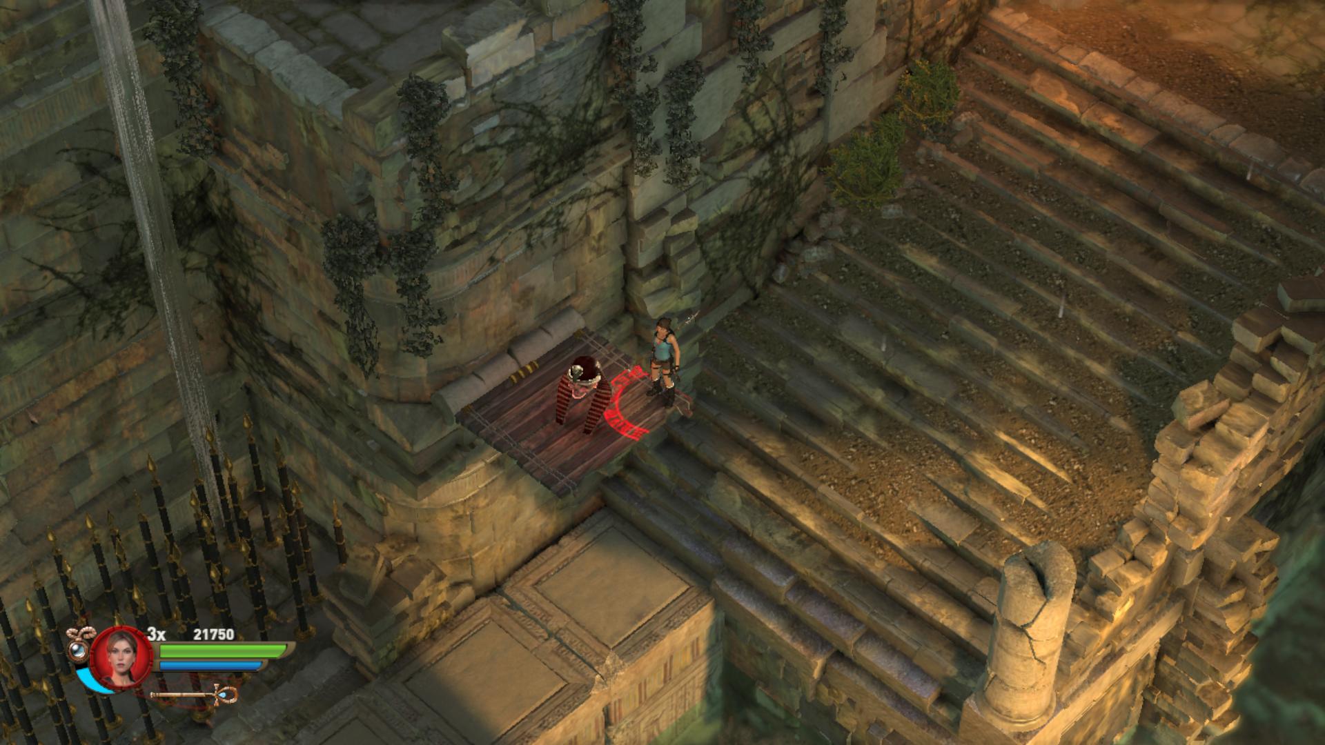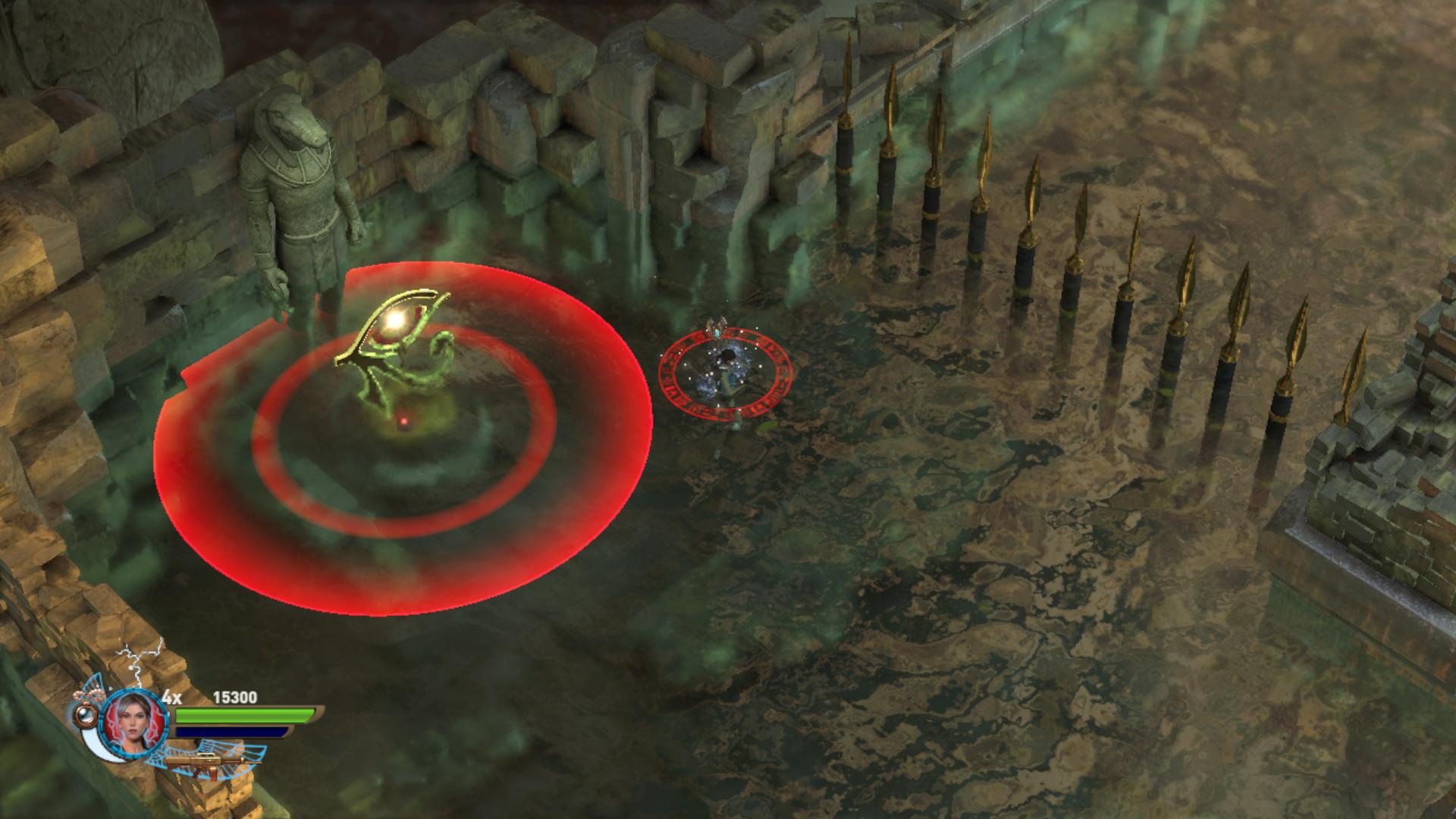 Továbbmenve a tüskés gödörnél csáklyázd meg a magasban a karikát, így juss át a túloldalra. lemenve a lépcsőn, egy medencéhez értél. Fuss át a potyogó padlólapokon. Az sem baj, ha a vízbe esel, a krokikat fel tudod robbantani is a vízben. Kimászni a „Staff” gomb használatával tudsz, akkor visszahúzódnak a tüskék. Állj rá a súlykapcsolóra, és oszlopok emelkednek fel a vízben. Lődd le a rádtámadó csontikat, majd a felemelkedett oszlopokról meg tudod szerezni a 2. Vörös Koponyát.