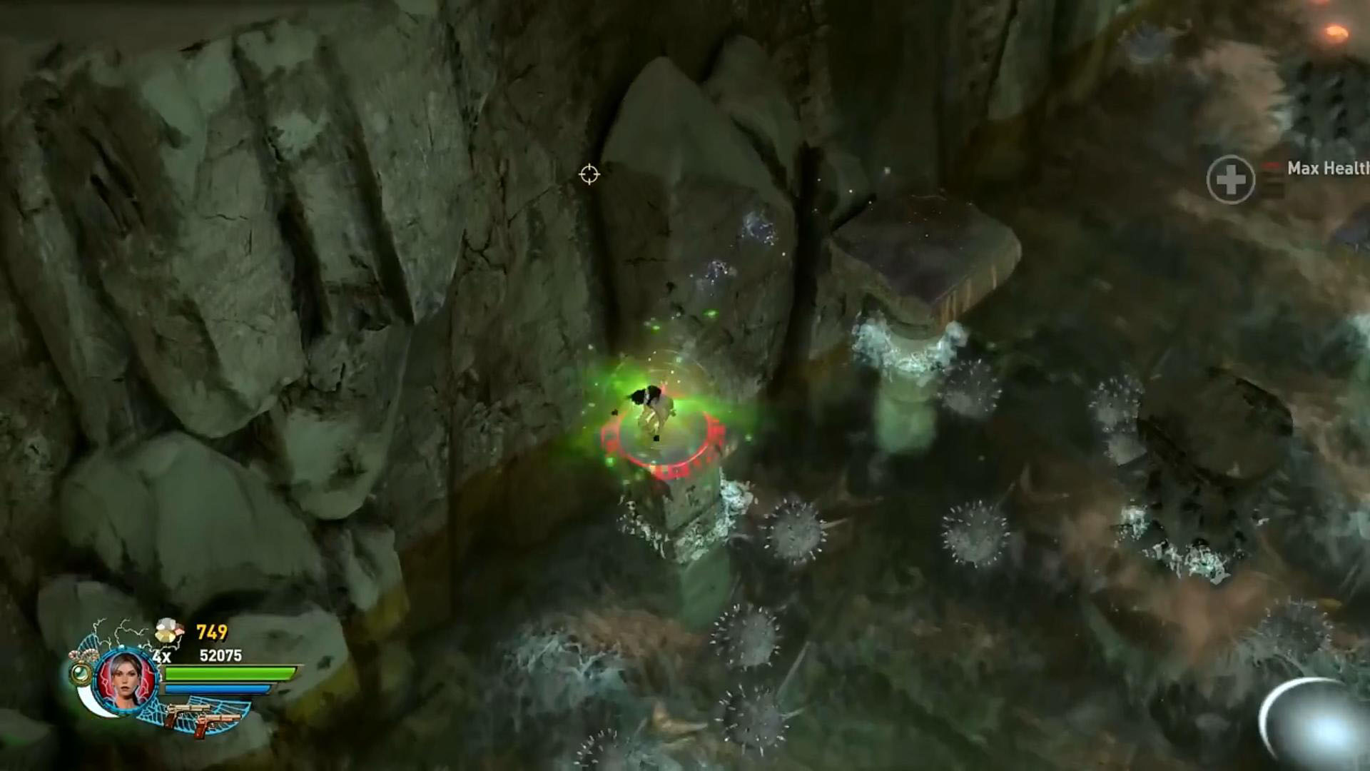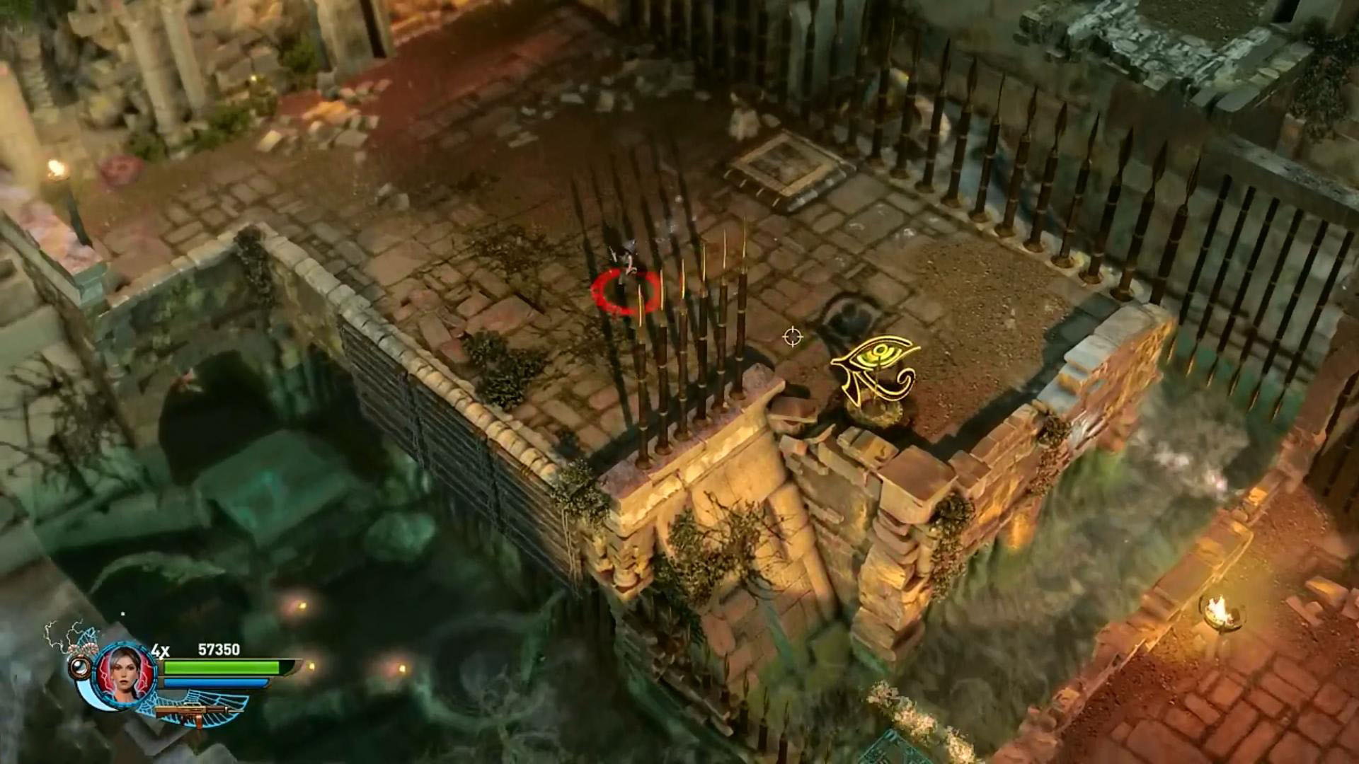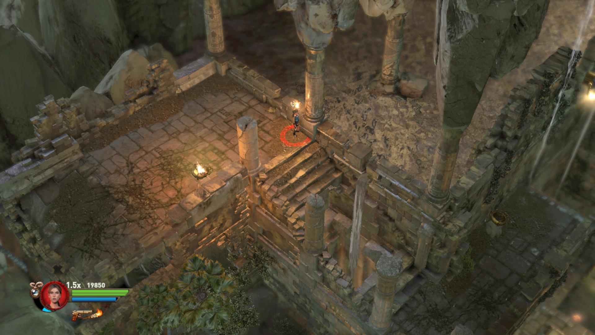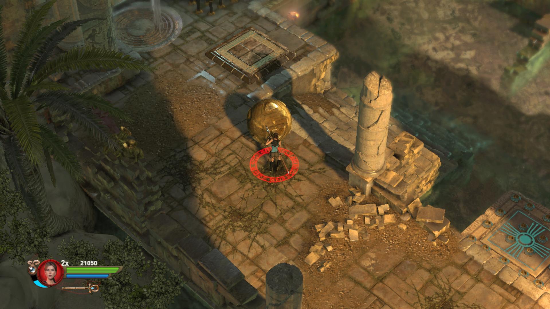 Továbbmenve a tüskés gödörnél csáklyázd meg a magasban a karikát, így juss át a túloldalra. lemenve a lépcsőn, egy medencéhez értél. Fuss át a potyogó padlólapokon. Az sem baj, ha a vízbe esel, a krokikat fel tudod robbantani is a vízben. Kimászni a „Staff” gomb használatával tudsz, akkor visszahúzódnak a tüskék. Állj rá a súlykapcsolóra, és oszlopok emelkednek fel a vízben. Lődd le a rádtámadó csontikat, majd a felemelkedett oszlopokról meg tudod szerezni a 2. Vörös Koponyát.
