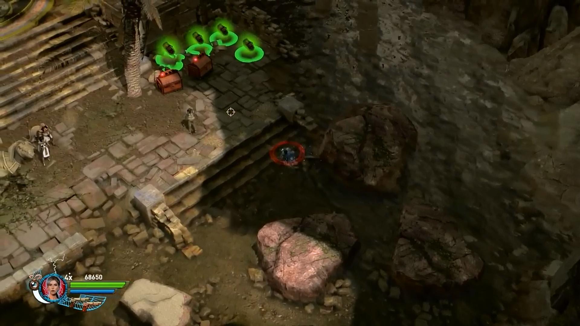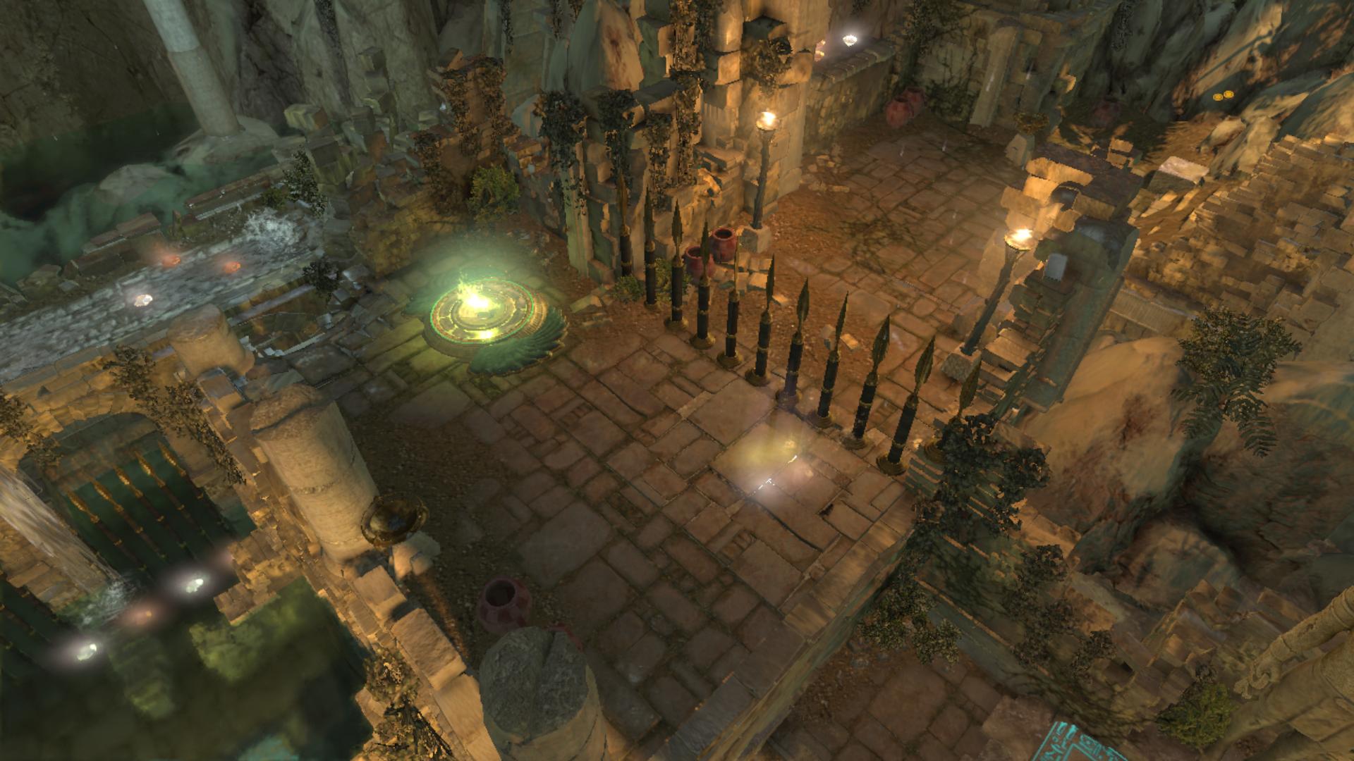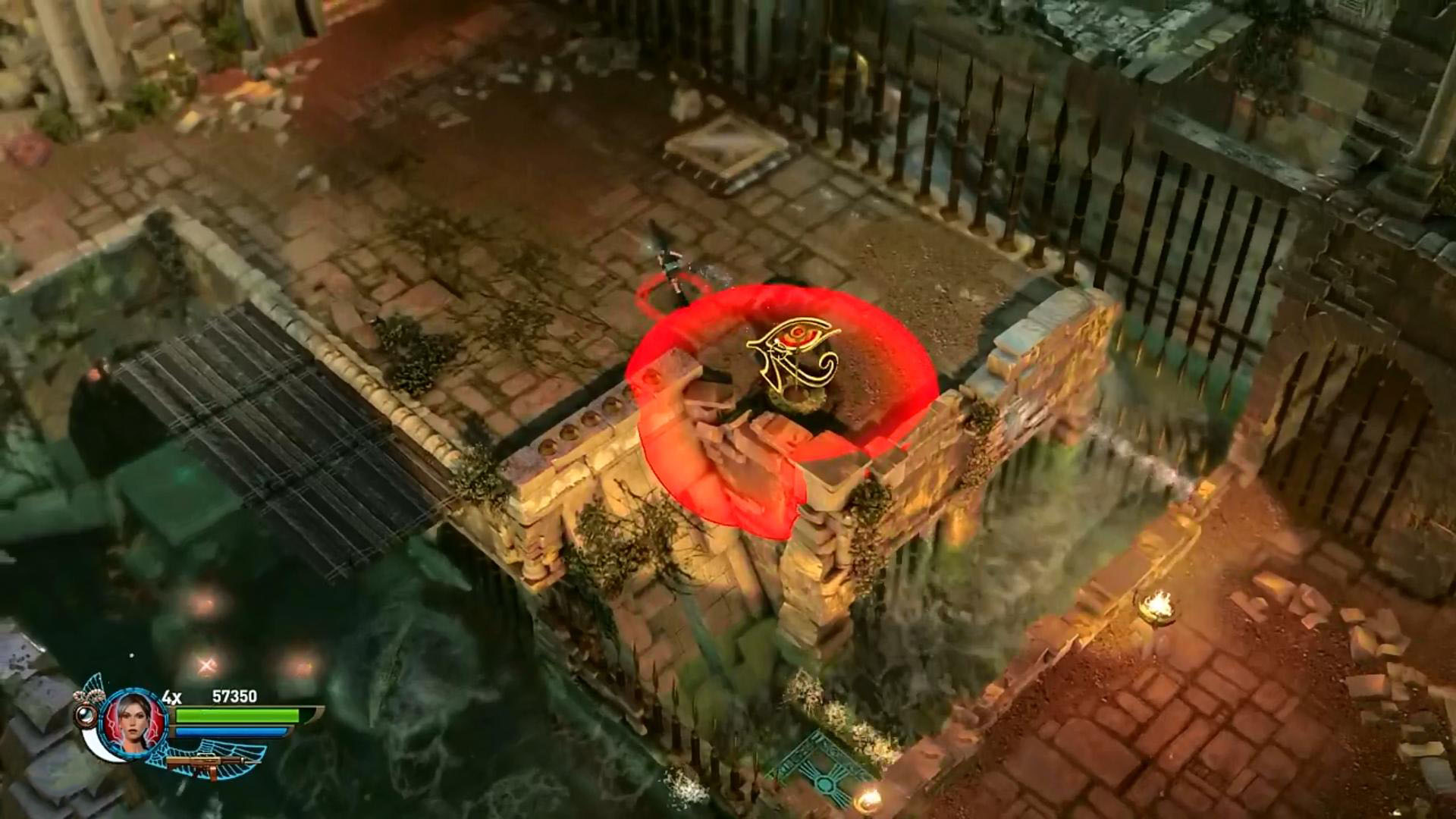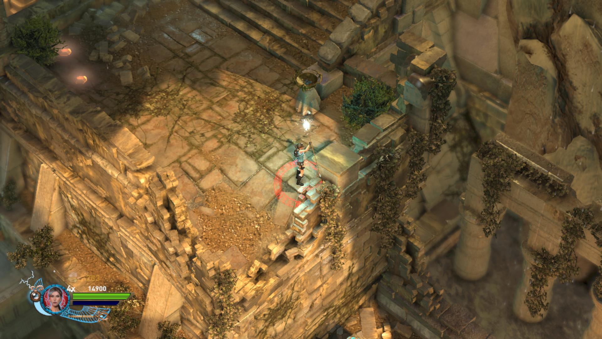 No egyébként itt az a feladat, hogy a fenti súlykapcsolóval elindíts egy időbombás golyót, majd a Staff-oddal fellőheted a felső szintre, és odatolva a szétrobbantható kapuhoz, megnyisd a továbbvezető utat. Ha úgy oldod meg, hogy nem nyúlsz kézzel a bombához, csak robbantgatva kezeled, akkor megkapod a Max Health Upgrade-t.