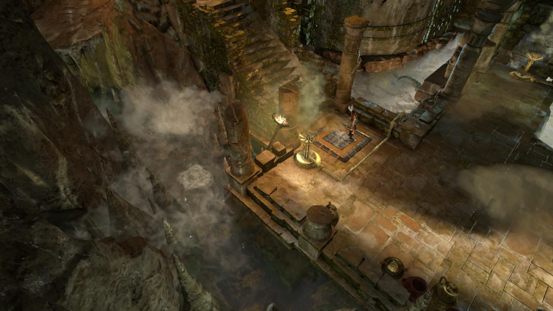 No tehát, ég a jobb oldali égő. Rakj egy bombát a szemszobor elé, majd mássz fel az emeletre. Állj rá a jobb oldali súlykapcsolóra, annak is jobb szélére, és onnan lőj bele a szembe. Megváltozik a forgásirány, és meggyújtod a második égőt is. Amikor meggyullad a másik keréken is az égő, lőj bele ismét a szembe. Most már a középső kerék balra forog, és meggyújtja a harmadik égőt is. Nagyon gyorsan rohanj át a szemközti súlykapcsolóra, és amikor a baloldali keréken is meggyullad az égő, akkor robbants. Onnan ugyanis nem tudsz belelőni a szembe. Így viszont megváltozik a forgásirány, és végre a bal szélső égő is meggyullad, és oszlopok emelkednek fel a vízben, amiken át eljutsz a túloldalra.