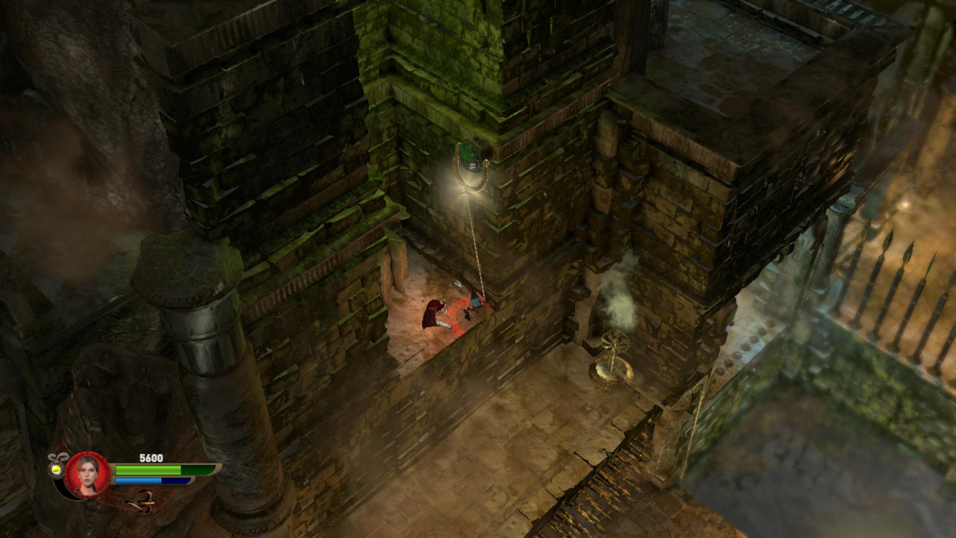 Továbbmenve húzd ki a falból a kapcsolót, és faplatformok emelkednek fel. Ezeken kell átjutnod a túloldalra, de igyekezned kell, mert időre megy a feladat. Ha átjutottál, csáklyázd meg a karikát, és ereszkedj le a falon, mert ott veheted fel a következő, a 2. Vörös Koponyát.
