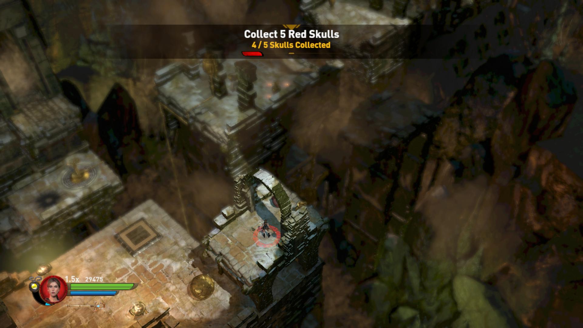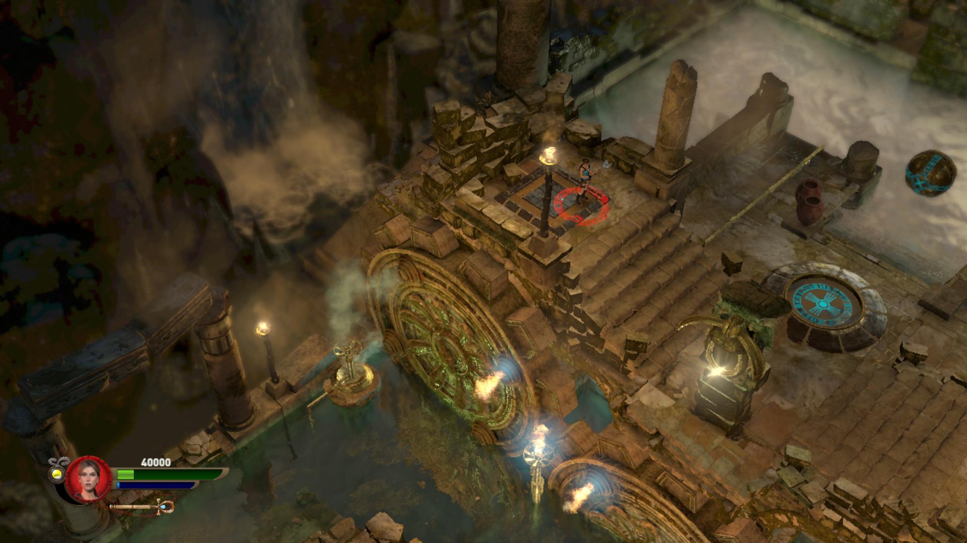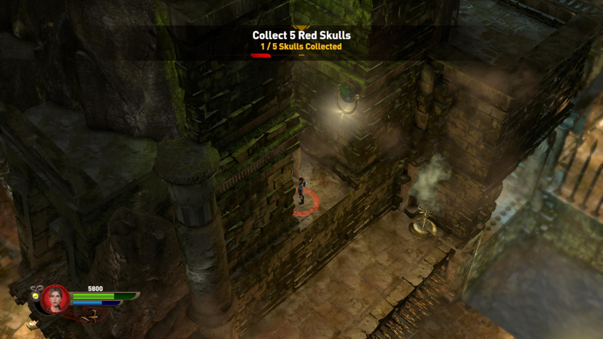 Most már betolhatod a kapu melletti foglalatába, és továbbmehetsz a kinyílt kapun. Most egy három kerekes feladat következik. Először is nyírj ki mindenkit, majd ugorj a jobb oldali kerék előtti platformra, és gyújtsd meg a kereket. Most az jobbra forog, és meggyújtja a jobb szélső égőt. A magasban megjelenik egy gyűrű. Nosza, a segítségével juss fel, és robbants le a lenti területre a robbanó gömböt. A karika baloldalához told, onnan sikerülni fog. Told kicsit a bejárat felé, és robbantsd át a vízen át a túloldalra, a falhoz. Ráállva megszerezheted az 5. Vörös Koponyát.