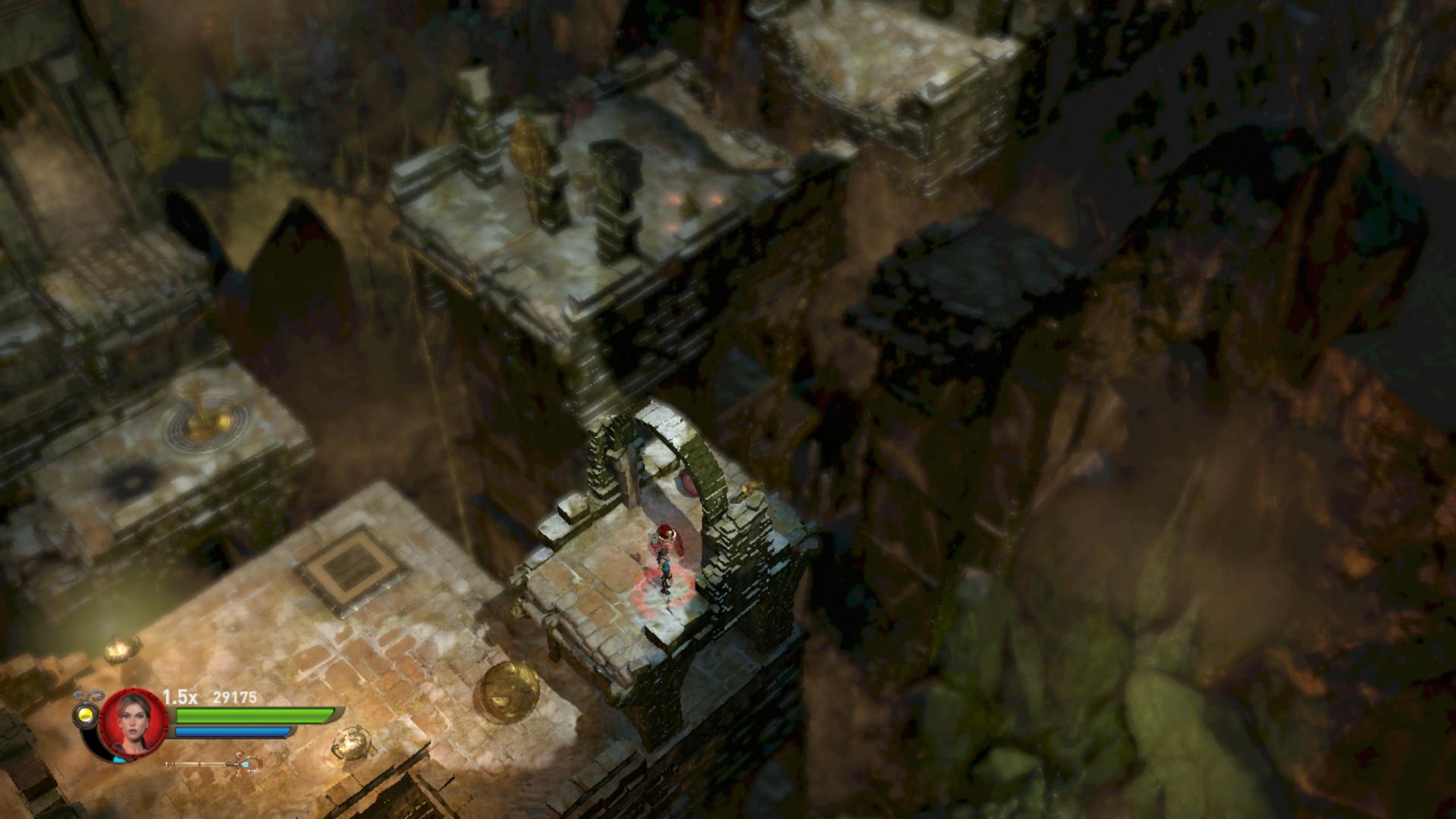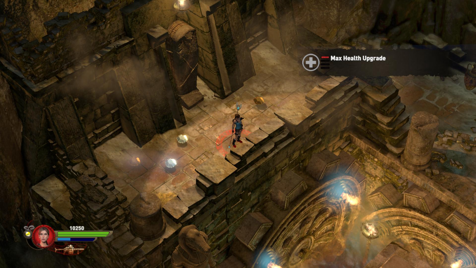 Lőj bele a szembe egyet, és fent kinyílik az egyik rács. Rakj egy bombát a szemhez, a csáklyával mássz fel a falon, menj át a nyitott rácson, és robbants. Most kinyílik a következő rács előtted. Gyújtsd meg az égőt, és lent, felemelkedik egy deszkaplatform. Rajta ker3sztül továbbjutsz. Egy két kerekes helyre értél. Ugorj a kis szigetre, és gyújtsd meg a baloldali kereket. Várd meg, amíg a végén meggyullad az égő, majd lőj bele a szembe, erre megváltozik a forgásirány, és a jobb oldali égő is meggyullad. A vízben felemelkedett egy oszlop. Rajta keresztül feljebb jutsz. Vigyázz, gránátvetőt elő, és lődd ki a krokiharcosokat az oszlopokon. Balra mássz fel a falon és meg is van a Max Health Upgrade.