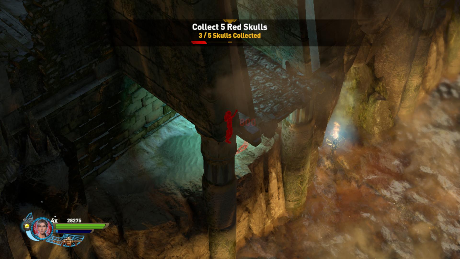 Most egy olyan helyre érsz, ahol több kis medence van, és több meggyújtható égő. Először szedj össze mindent, elő a gránátvetővel is, mert ahányszor meggyújtasz egy-egy égőt, rengetegen rontanak rád. Sőt, a végén a főnök is megjelenik. Rá koncentrálj, párszor fel kell robbantani mire kinyiffan, de ha ő megdöglik, a többi is eltűnik. Menj az egyik medencéhez, a baloldalihoz, és emeld fel a vízben rejtőző oszlopot. Rajta keresztül eljutsz a túloldalra, és felveheted a 3. Vörös Koponyát.