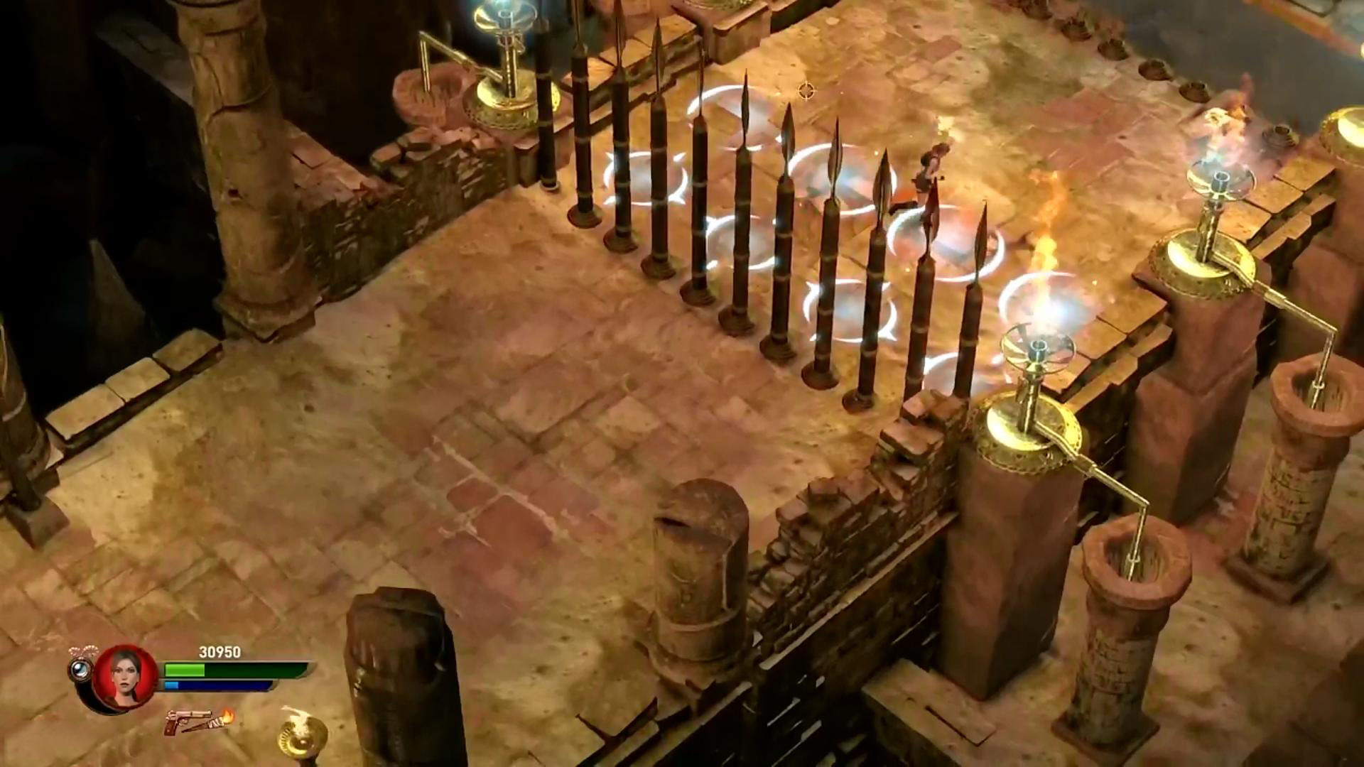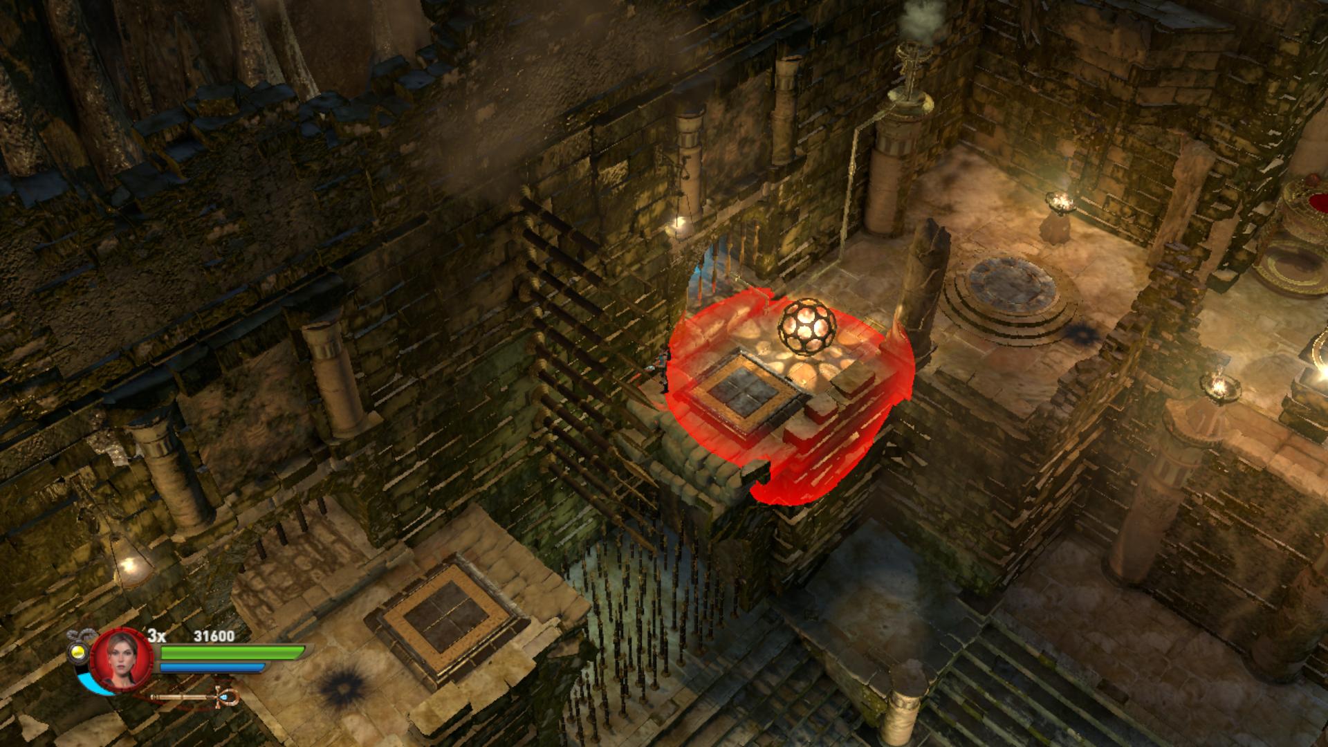 Most told a golyót a súlykapcsolóra, ugorj át a másik oldalra, és gyújtsd meg az égőt. A csáklyával jutsz tovább. No elértél a következő feladathoz. Van egy mozgatható golyó, amiben tűz ég. No de mit tegyél vele? Hát először is a csáklyáddal juss fel az emeletre. Lépj rá a súlykapcsolóra, erre a falból visszahúzódnak a tüskék, és át tudsz ugrani a baloldalra. Ott a Staff-oddal lődd szét a fényes gömböt, és kinyílik lent a kapu. Menj le, és a lyukacsos gömböt told rá a felemelhető oszlopra, majd told le onnan. Robbantsd át a jobb oldalra. Most a súlykapcsoló utánra told egy kicsit, és tégy le egy bombát. Úgy kellé robbantanod, hogy fent, a magasban meggyújtsa az égőt. Ha sikerült, kinyílt ott egy rács, és bemenve megkaptad a Max Ammo Upgrade-t.
