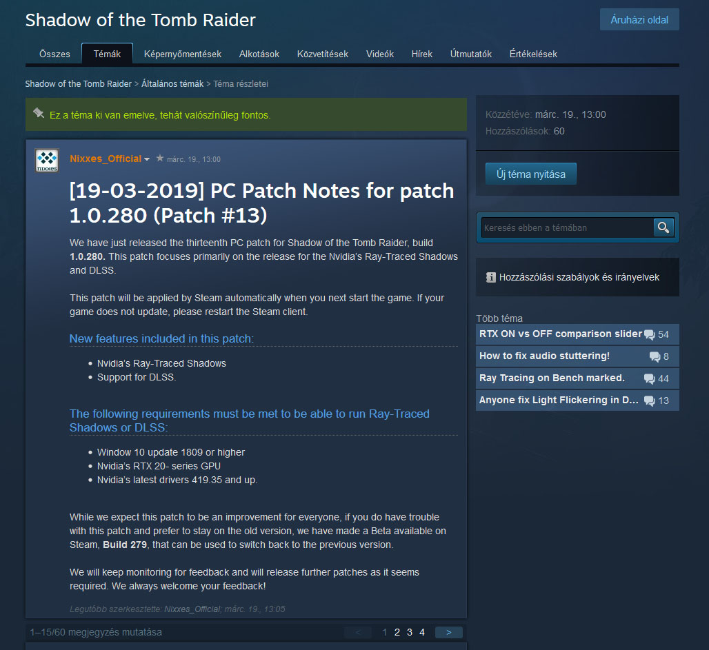A Shadow of the Tomb Raider-hez most végre elkészült a 1.0.280-es patch, aminek a leírása itt van, amúgy letöltődik automatikusan.