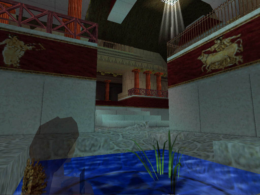 Chapter 2: Ez a pálya sem lineáris. Ha beértél a fõterembe, sokfelé indulhatsz el. Rengeteg kapcsolót, gombot kell megtalálni, tömböket tologatni 4 kapcsolóra, miközben hárpiák, csontvázak, és gladiátorok zaklatnak. Néha bizony többen is, kicsit nehezebb volt megcsinálni a pályát medipack nélkül. :) Igaz, a kispisztolyokat használtam, ahol csak lehetett. Sokáig nem találtam meg az utolsó kapcsolót, nem vetten észre a kis medencében a felrántható csapóajtót. Idõre futás is van a pályán, de nem vészes. Remek pálya volt ez is. Itt is két secretet találtam, és érdemes õket felfedezni, mert rengeteg utánpótlást lehet felvenni ott.