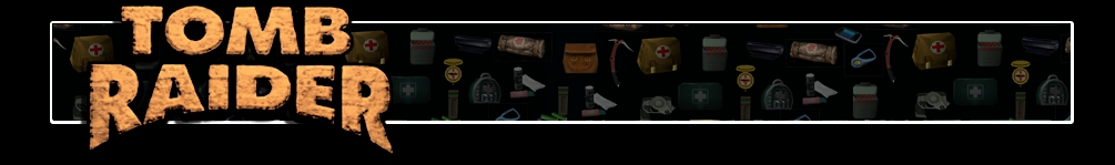 A háttérben a Tomb Raider-játékok különböző felszerelési ikonjait ábrázoló banner látszik. Balra a Tomb Raider 1. logója látható.