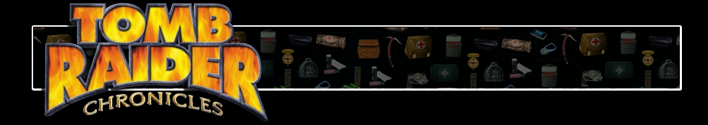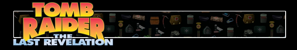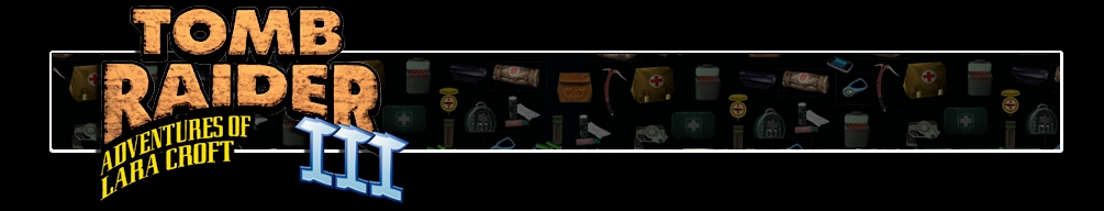 A háttérben a Tomb Raider-játékok különböző felszerelési ikonjait ábrázoló transzparens látszik. Balra a Tomb Raider III logója látható.