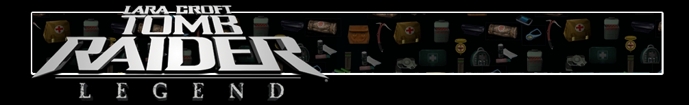 A háttérben látszik egy banner a Tomb Raider-játékok különböző felszerelési ikonjaival. Balra a Tomb Raider Legend logója látható.