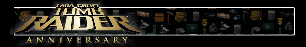 A háttérben a Tomb Raider-játékok különböző felszerelési ikonjait ábrázoló banner látszik. Balra a Tomb Raider Anniversary logója látható.