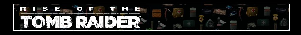 A háttérben a Tomb Raider-játékok különböző felszerelési ikonjait ábrázoló transzparens látszik. Balra a Rise of the Tomb Raider logója látható.