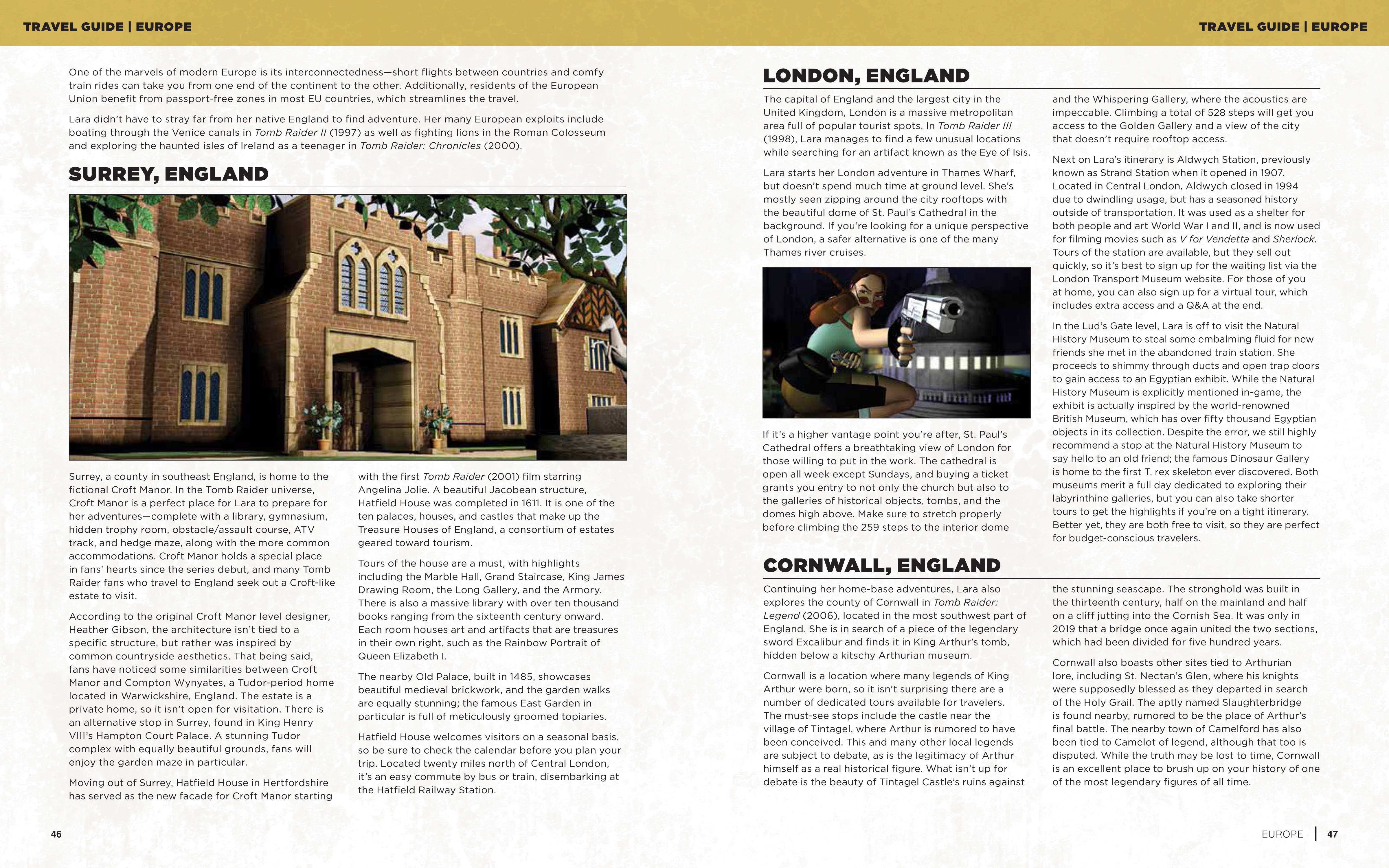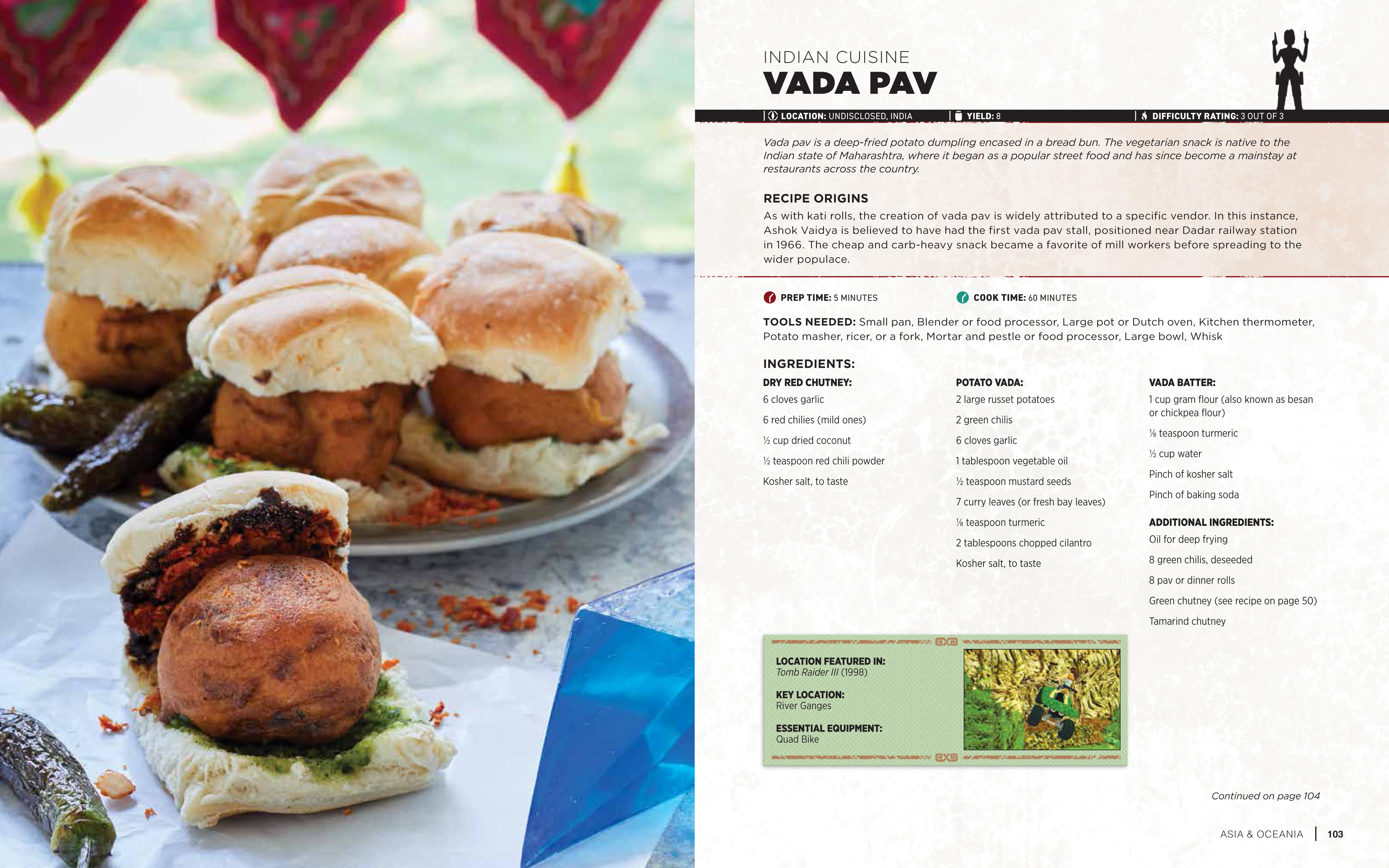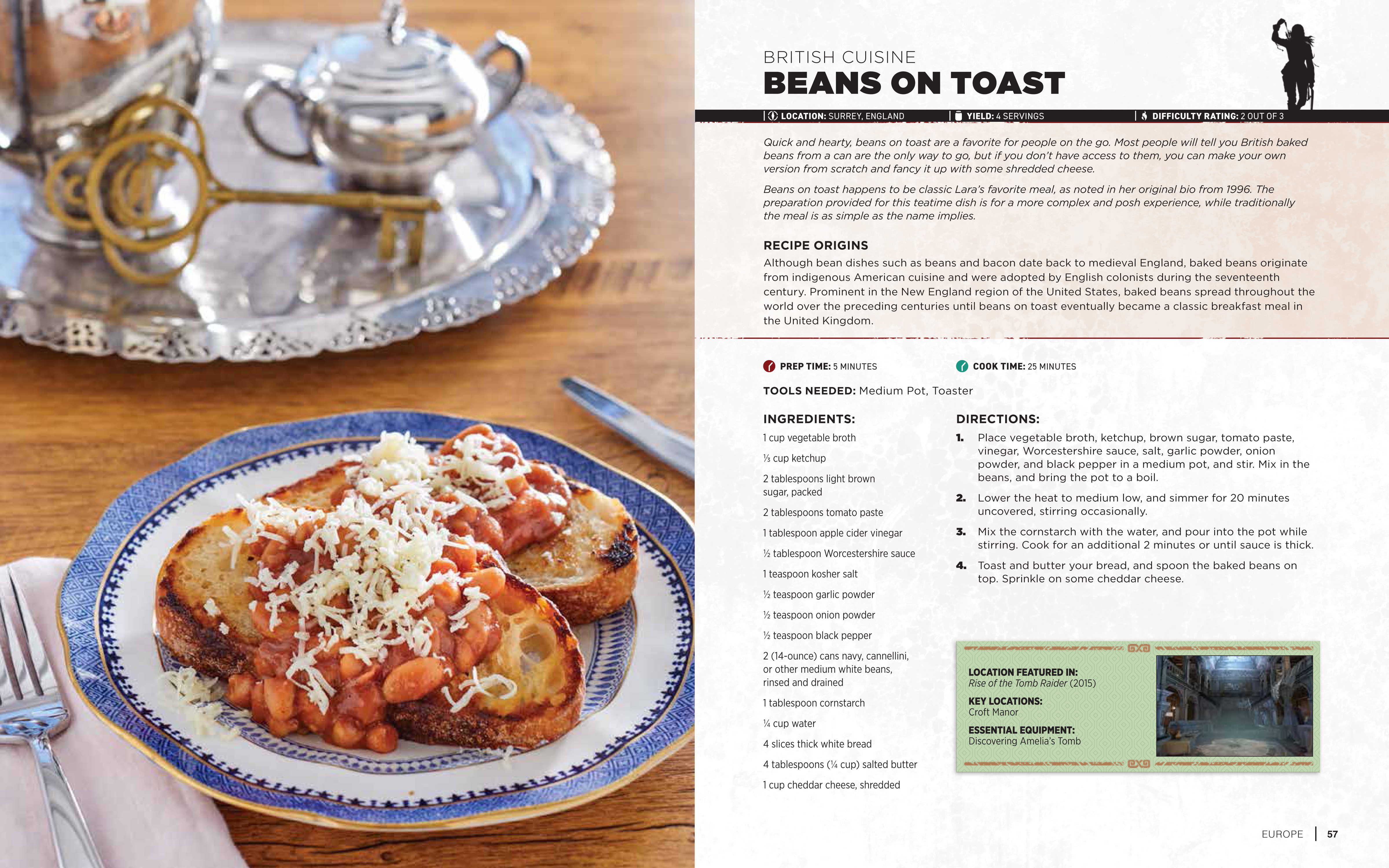 "A Tomb Raider The Official Cookbook and Travel Guide egy izgalmas és ízletes útmutató a receptekhez, amelyeket a számos helyszín kultúrtörténete ihletett, amelyeket Lara Croft 25 éves globális kalandjai során meglátogatott - így az ízek hazatérnek hozzád. A Tomb Raider videojáték-sorozat sikere alapján készült könyv több mint 40 receptet tartalmaz, amelyeket a Lara Croft által meglátogatott és felfedezett számos helyszín inspirált világszerte, a kulcsfontosságú karakterek és helyszínek által ihletett ételekkel és italokkal."