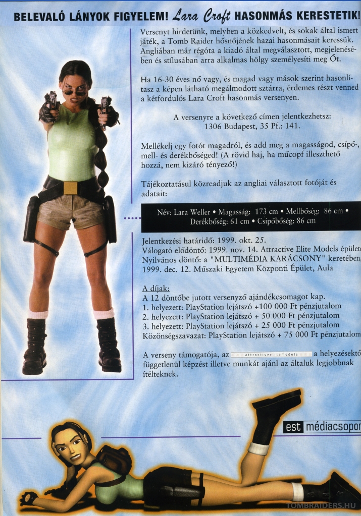 1999. december 12-én a Computer Karácsonyon lezajlott a Lara Croft Hasonmásverseny döntője, a BME K épületében. A Baby Sisters és C'est La Vie zenekarok után lépett színpadra este a 12 döntős, akik közül az alábbi sorrend alakult ki. (A nyertesek pénzdíjat és egy-egy Sony Playstationt kaptak.)