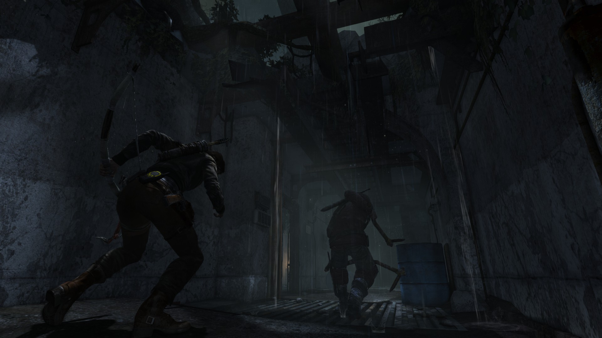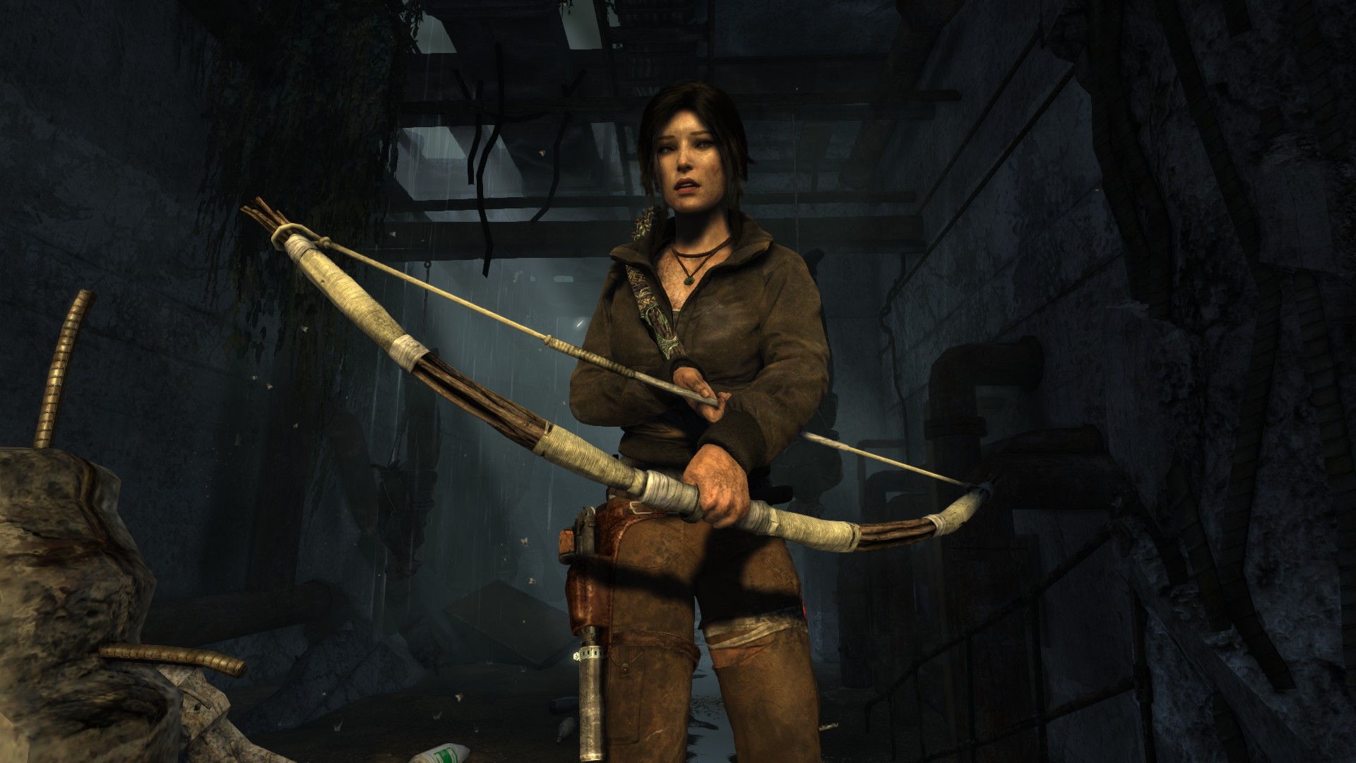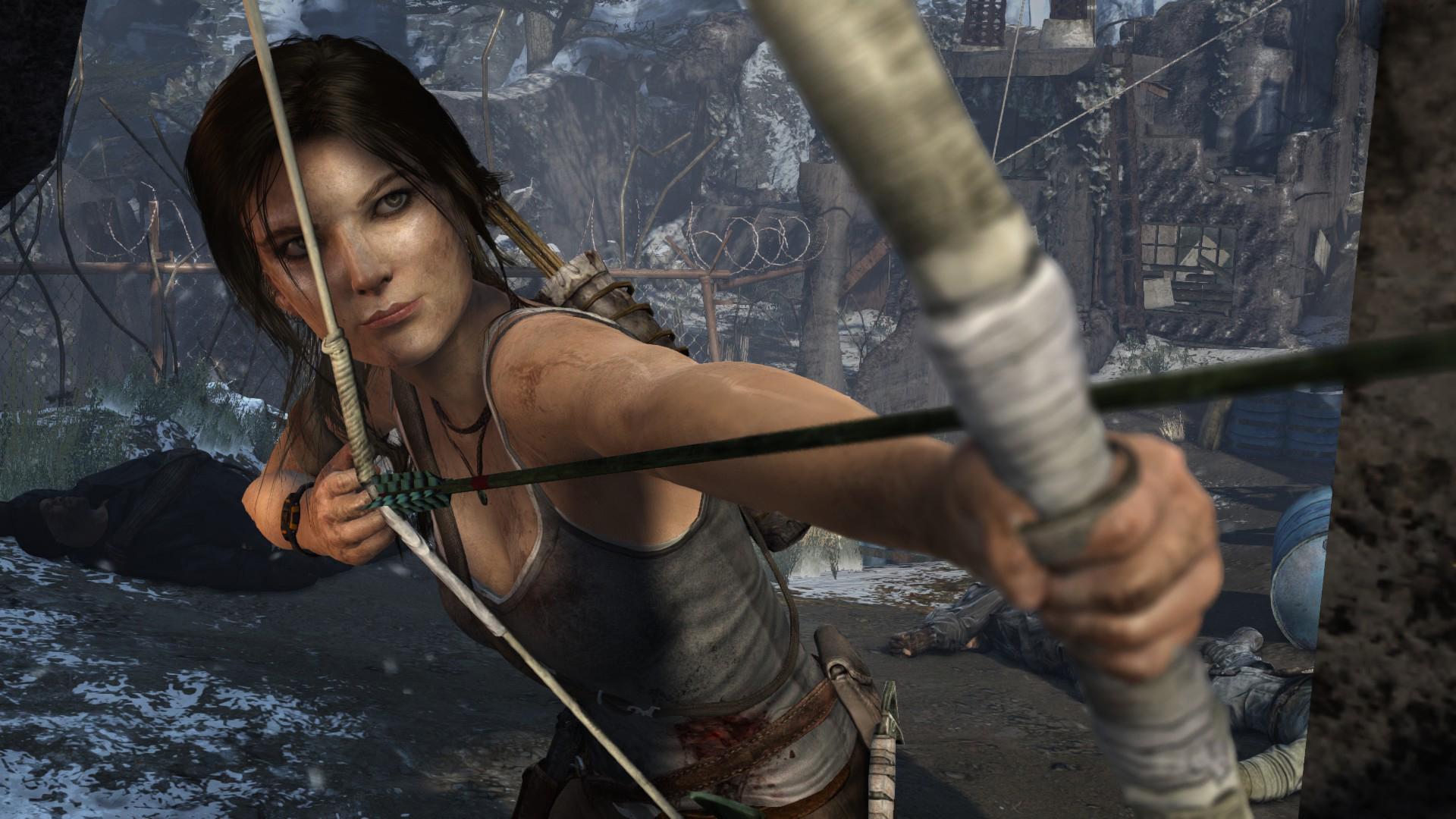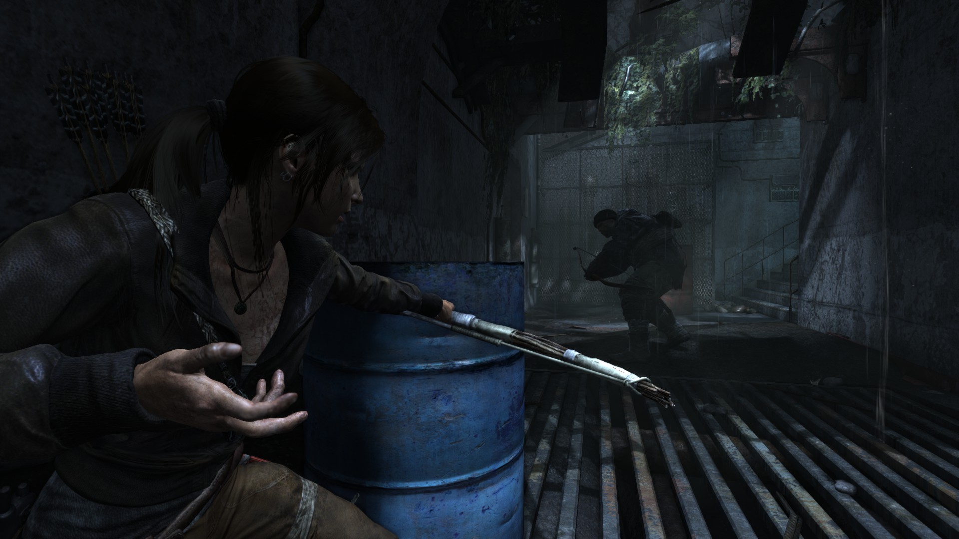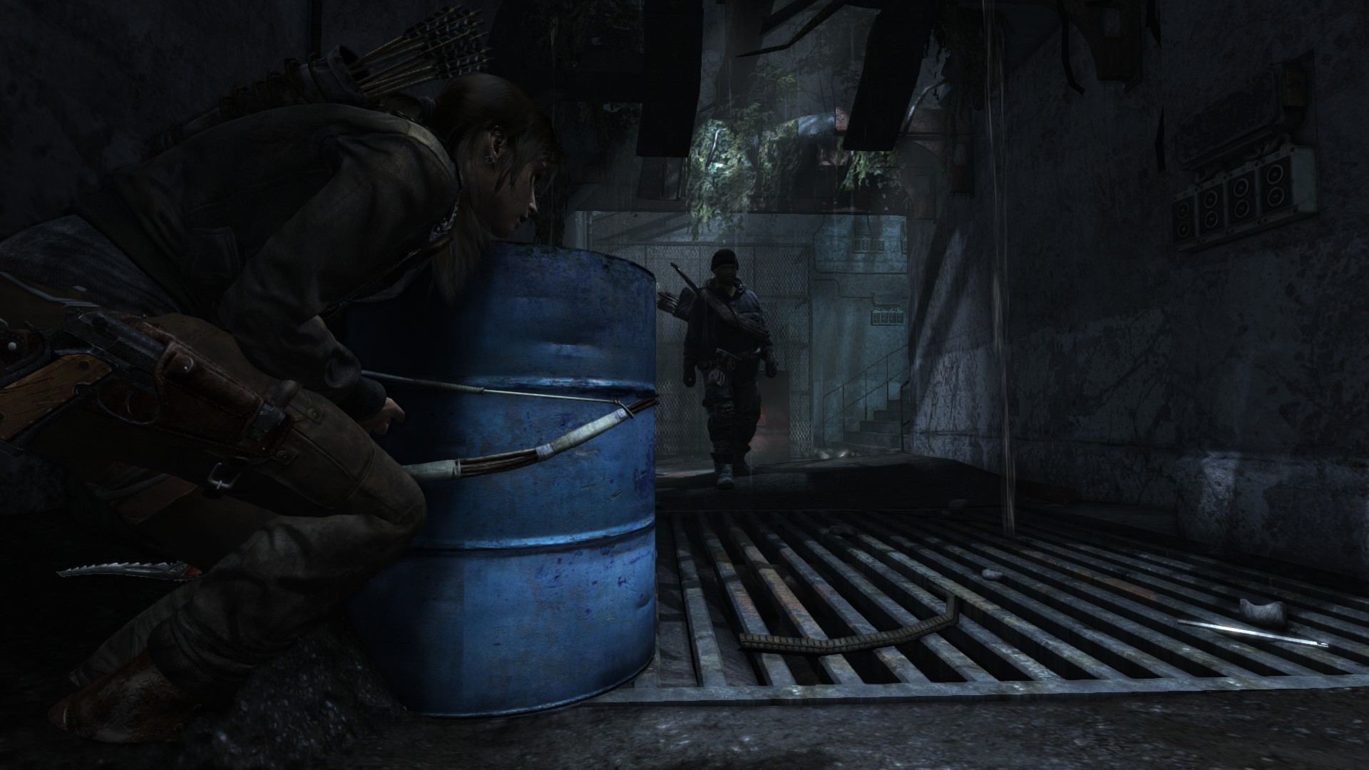 [HUN] Ahogy közeledünk a bázishoz, az idő továbbra is sötét és esős, így csak természetes, hogy mostanra már egy kis változatosságra vágyunk. A bázis elég lepukkant, még hullák is lógnak a víz felett, ami arra késztet, hogy minél hamarabb kimásszunk a nem túl tiszta vízből. És egy jó példa arra, hogy (ellentétben a Tomb Raider Anniversary hosszú és unalmas folyosóival) egy rövid folyosó is nézhet ki jól a lerombolt, benőtt mennyezettel, jó világítással és részletekkel.