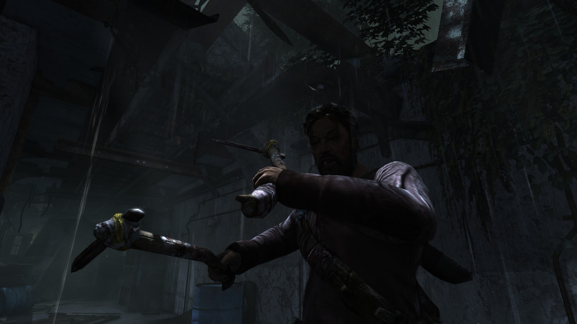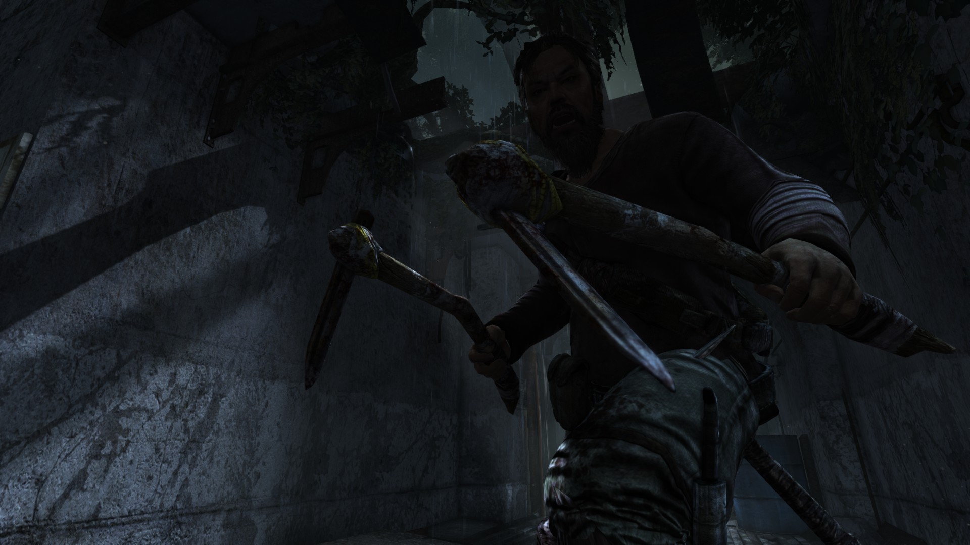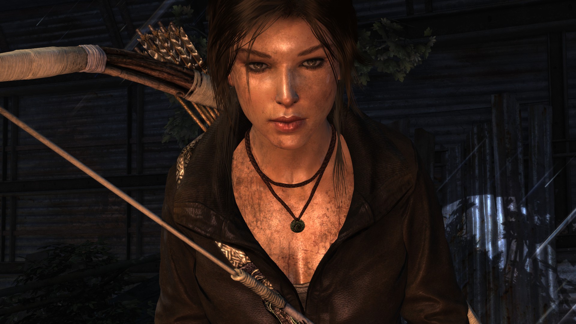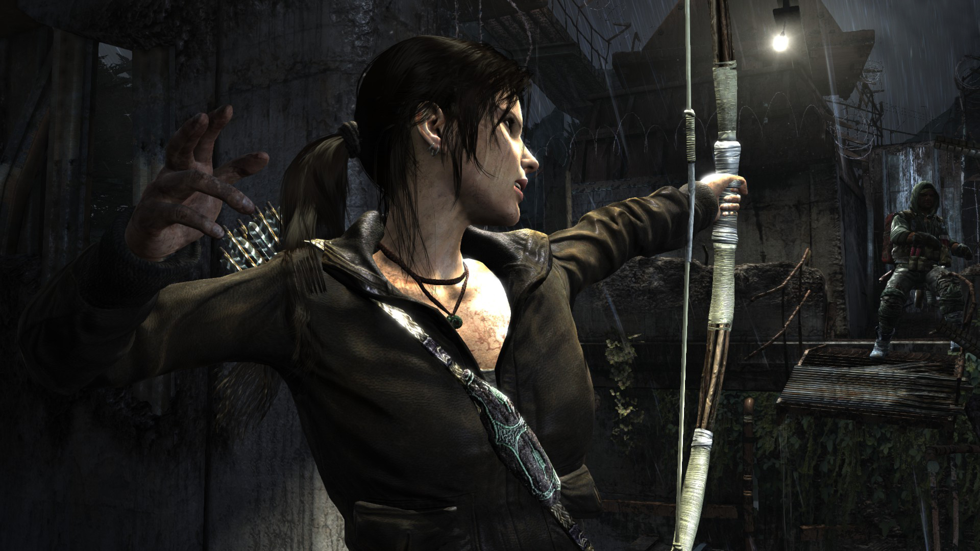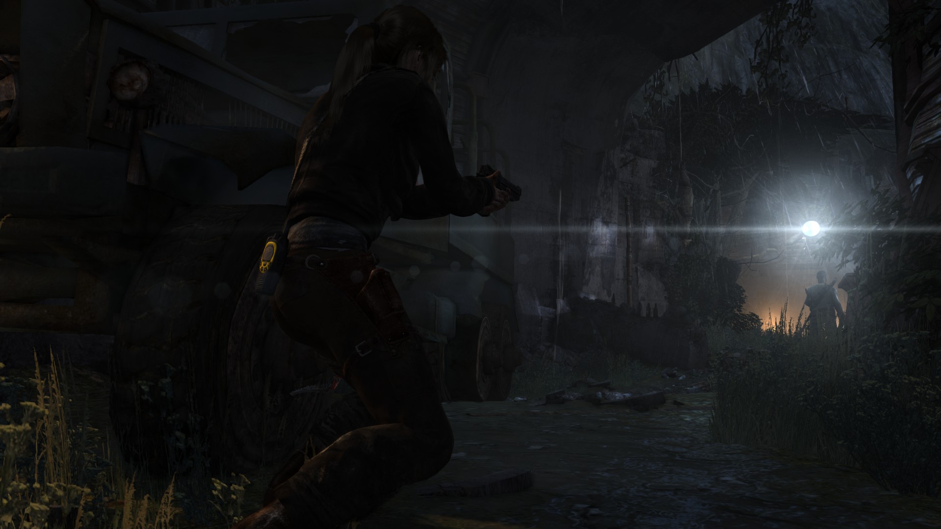 [HUN] Ahogy közeledünk a bázishoz, az idő továbbra is sötét és esős, így csak természetes, hogy mostanra már egy kis változatosságra vágyunk. A bázis elég lepukkant, még hullák is lógnak a víz felett, ami arra késztet, hogy minél hamarabb kimásszunk a nem túl tiszta vízből. És egy jó példa arra, hogy (ellentétben a Tomb Raider Anniversary hosszú és unalmas folyosóival) egy rövid folyosó is nézhet ki jól a lerombolt, benőtt mennyezettel, jó világítással és részletekkel.