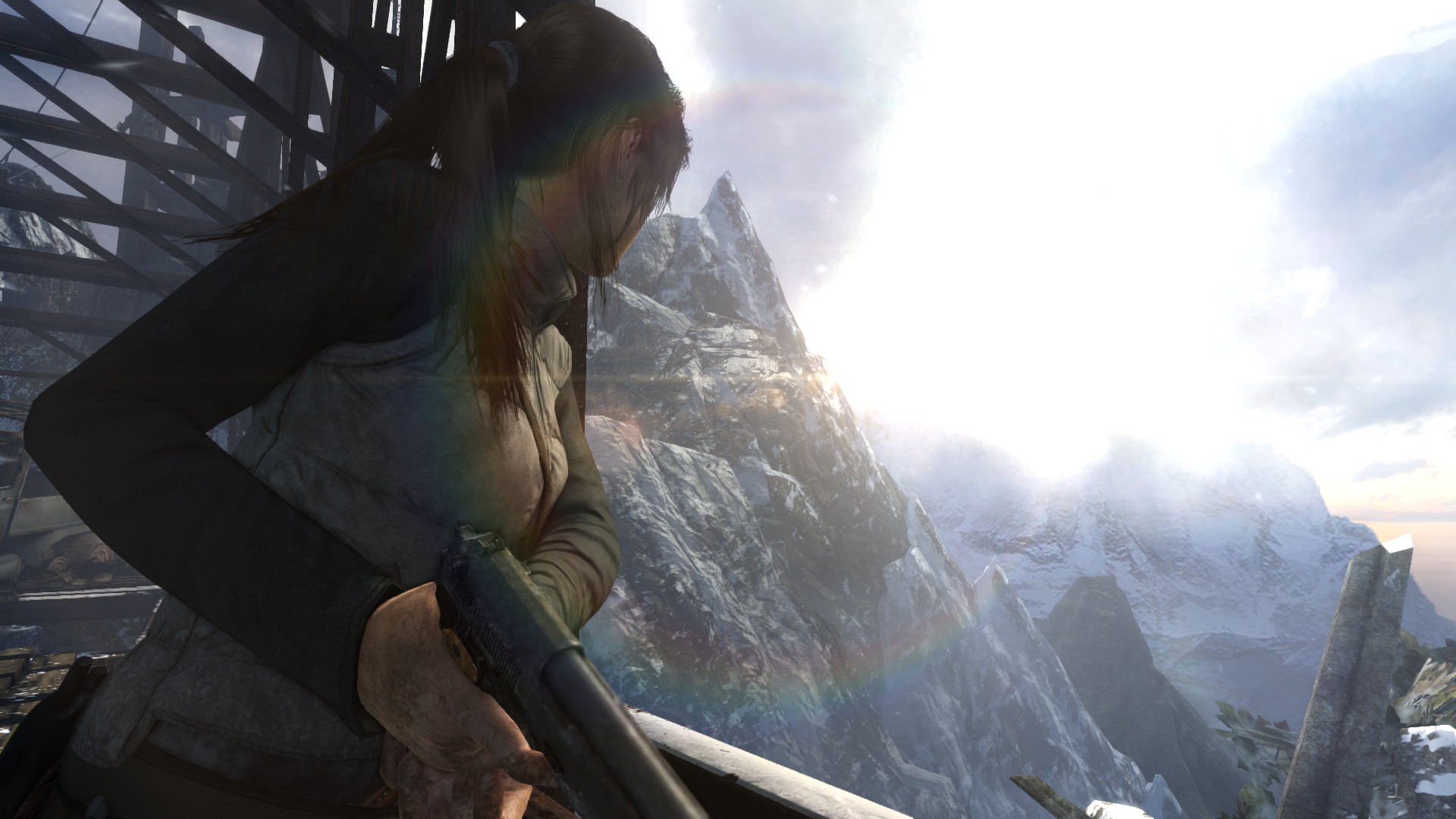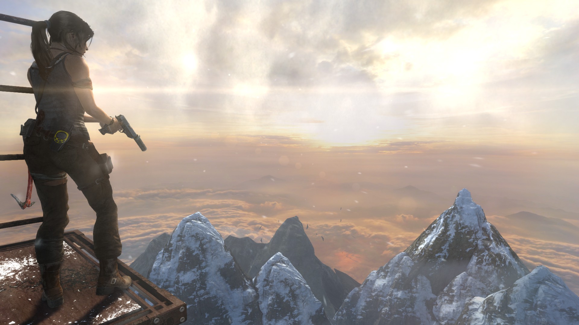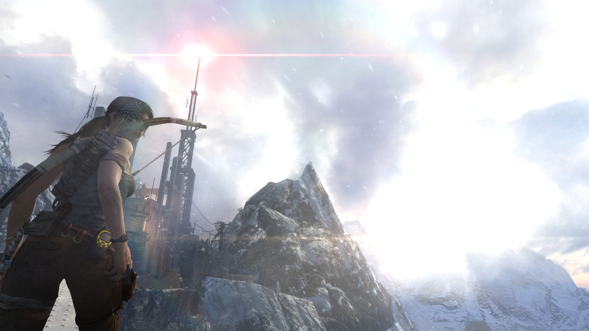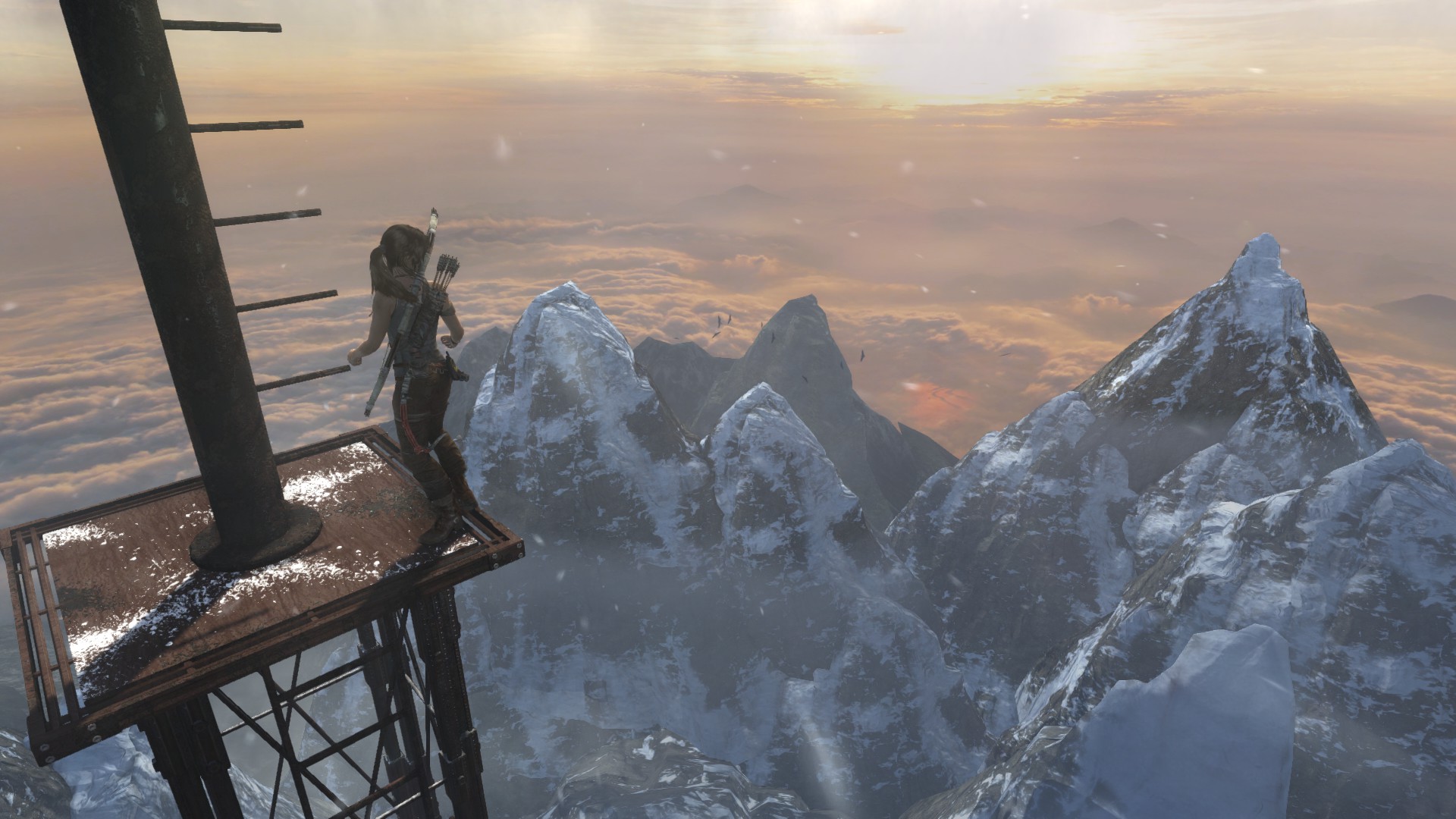 [EN] And finally, the radio tower. The horizon is incredibly beautiful here, I also enjoyed the camera angles and movements during the cinematic. The sequence is very well done, though I was disappointed when I let go of the movement buttons and I found out that I don't have any control over Lara in the majority of the climbing sequence - therefore the sense of danger only comes across thanks to the thrilling visual experience and sadly, it's missing from the gameplay, as we lose control entirely and realize Lara can't fall. Too bad, I did fall a few times while trying to take some pics and it was quite scary.