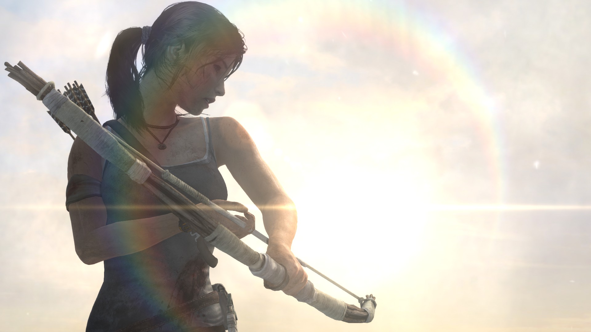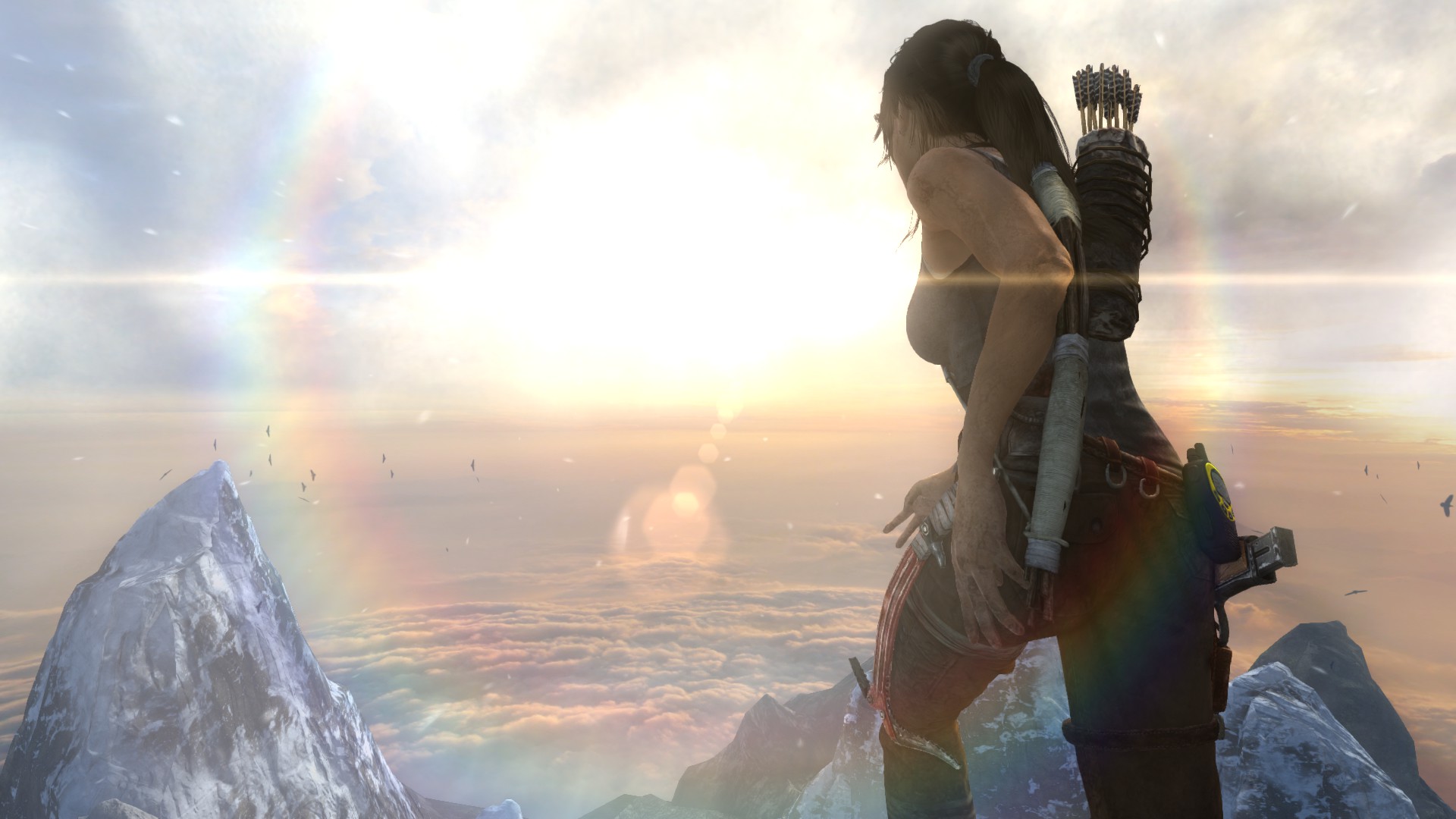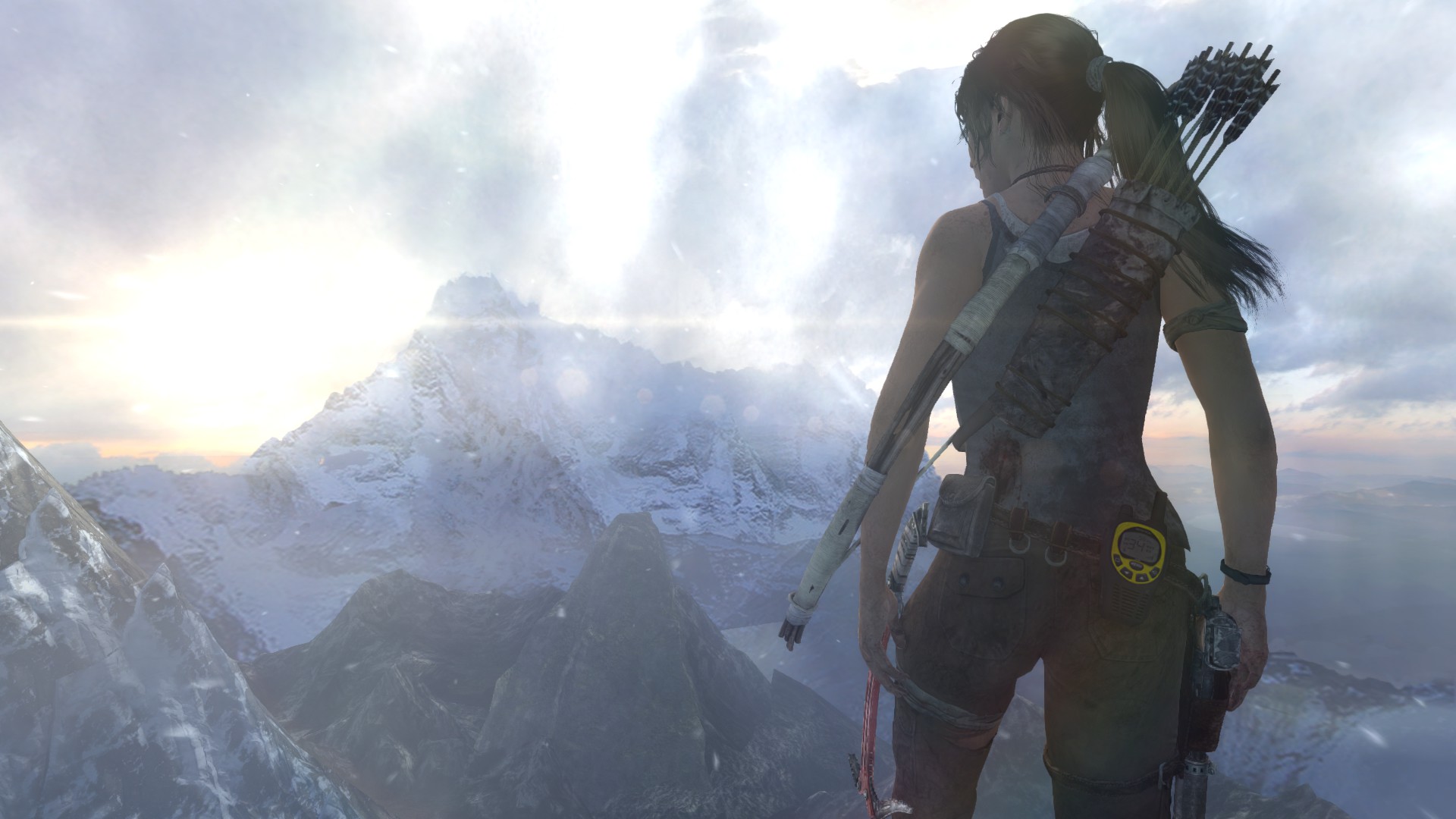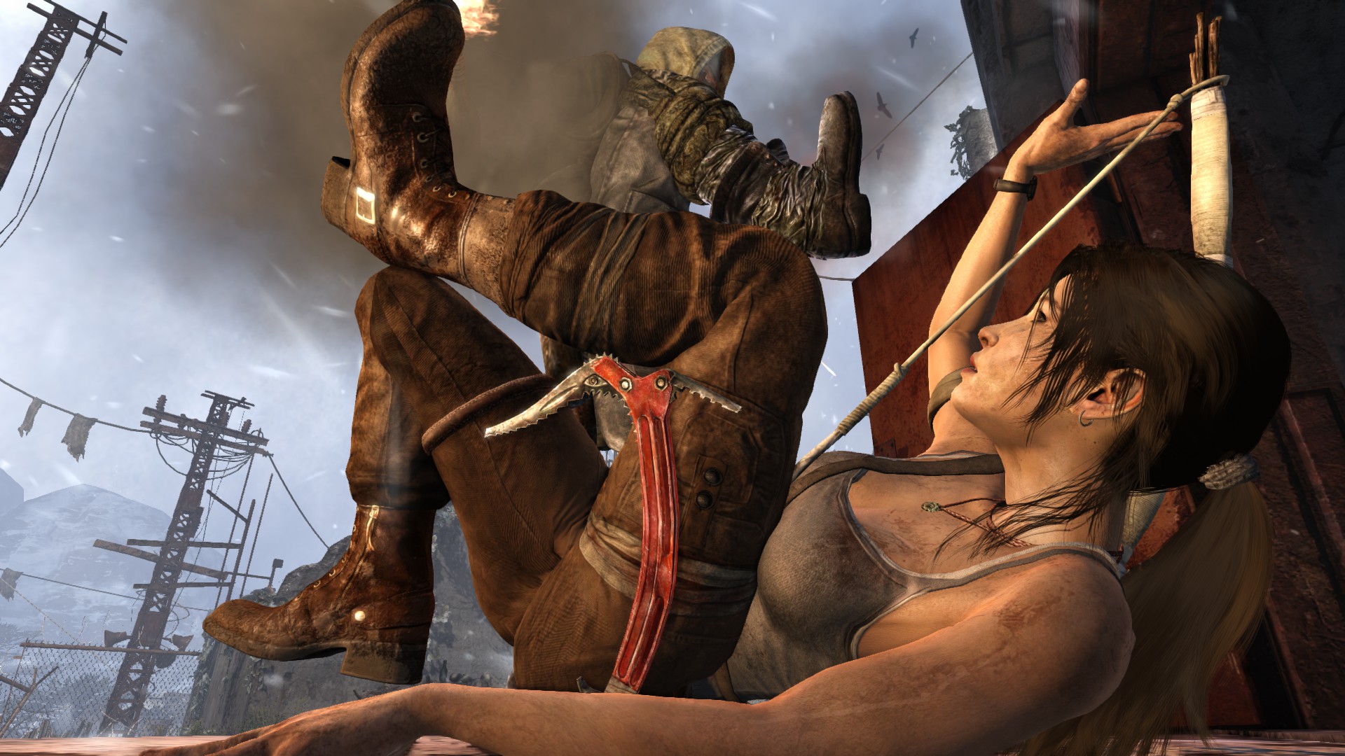 [EN] And finally, the radio tower. The horizon is incredibly beautiful here, I also enjoyed the camera angles and movements during the cinematic. The sequence is very well done, though I was disappointed when I let go of the movement buttons and I found out that I don't have any control over Lara in the majority of the climbing sequence - therefore the sense of danger only comes across thanks to the thrilling visual experience and sadly, it's missing from the gameplay, as we lose control entirely and realize Lara can't fall. Too bad, I did fall a few times while trying to take some pics and it was quite scary.