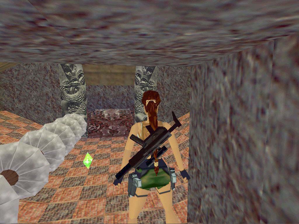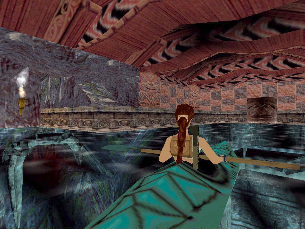 Visszafelé egy bonyolult ugrást kell kiviteleznünk a bambuszállványról a szembe-jobb oldalon levõ lenti sziklára. (Segítség: lógassuk le magunkat a bambuszállvány bal szélérõl - úgy hogy a létra a jobb felünk felé essen, még ha nem is látjuk -, majd húzzuk fel magunkat, fordítsuk Larát kissé jobbra a cél felé, de ne nagyon! Futás, elrugaszkodás, és kellõ mértékben nyomjuk a jobbra gombot, hogy Lara a levegõben is forduljon picit. Kitartás, elõbb-utóbb sikerül!) Újból fel a létrán, de ezúttal bemehetünk a terembe, ahol vízbe ugrás elõtt tanácsos végezni az óriásgyíkokkal. A medencében egy kart találhatunk, mely a bambuszajtót nyitja, ezzel belekezdhetünk Lara vadvízi-evezõs túrájába! :-) Az irányítás nem túl könnyû, ki kell tapasztalni. Ha vízesésen esünk lefelé, tompíthatjuk az esést egy kis hátrafelé evezéssel. Ha tüskékhez érünk, kivédeni õket nem lehet, minél elõbb jussunk túl rajtuk. Menjünk, míg el nem érünk egy teremig, melynek a közepén egy lánc lóg - furcsa módon ez egy dugó, mint a kádakban, majd ki kell húznunk. Most menjünk kicsit visszafelé, arra amerrõl jöttünk, és evezzünk a zöld kristály felé, itt lesz a harmadik titkos hely, azonban felvenni semmit nem tudunk egyelõre.