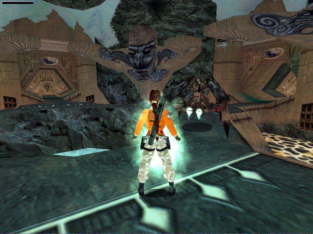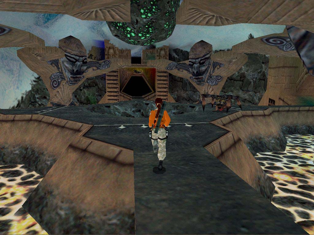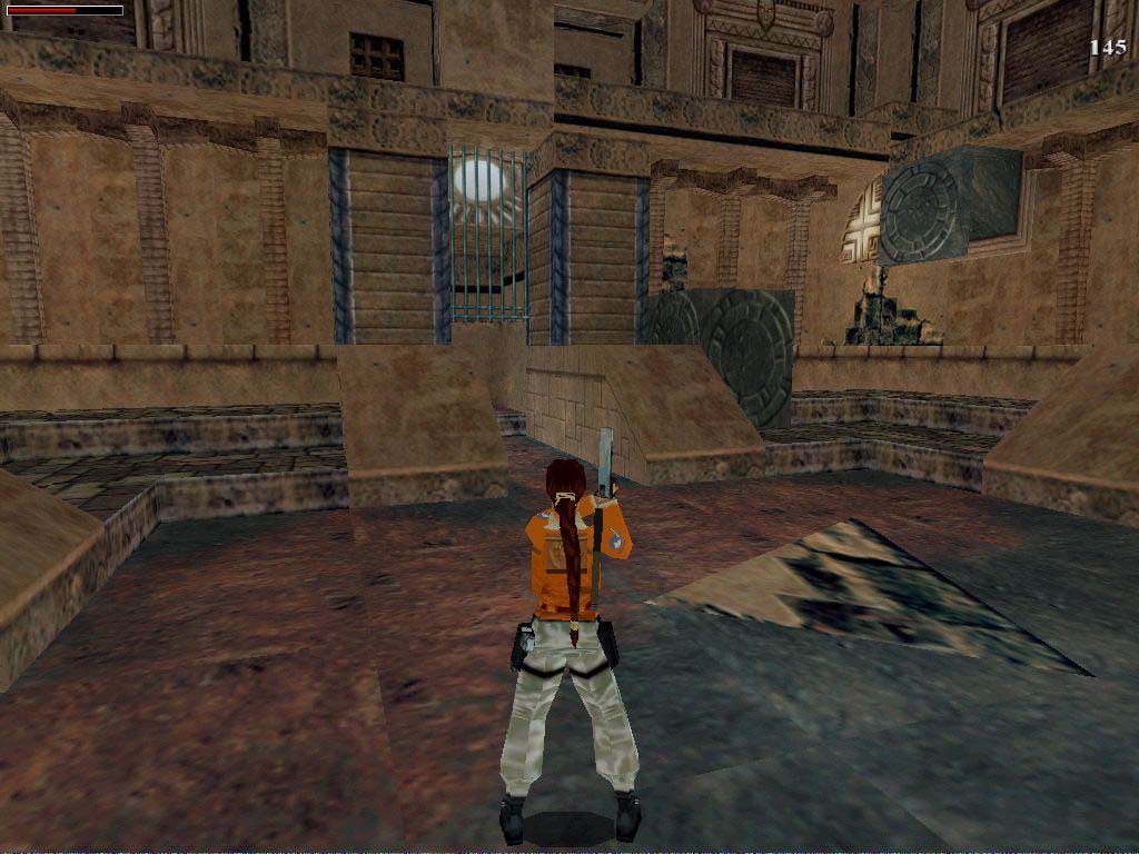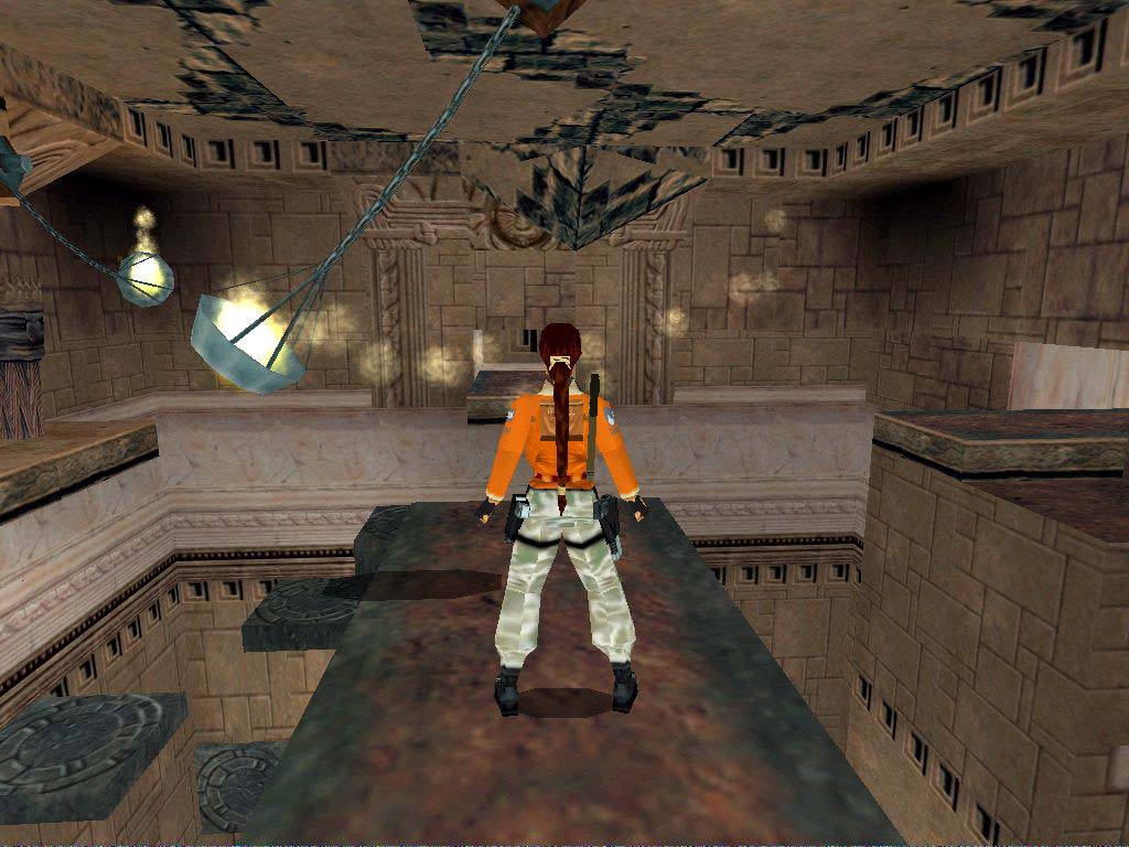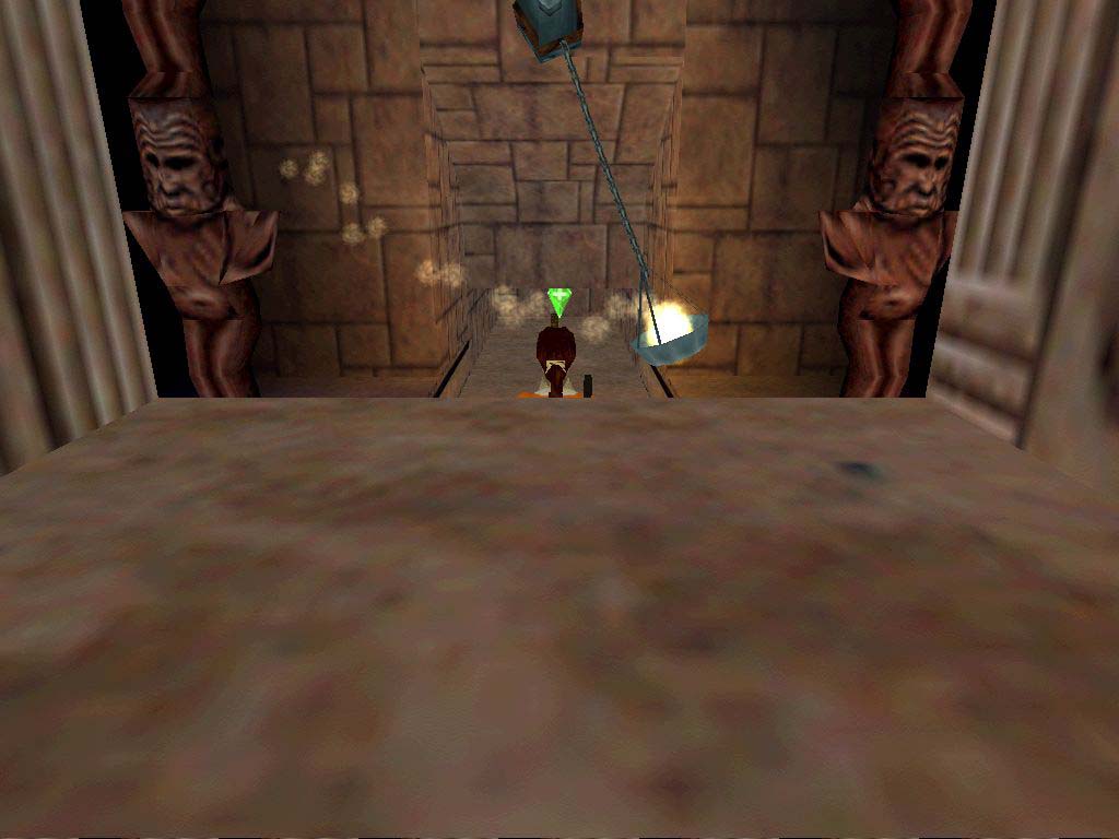 Utána a cél a középen levõ híd aljára felkapaszkodni, de ehhez az alatta levõ platformot fel kell nyitni, és oda kell jutni. Szóval menjünk vissza a bejárattal szembeni legfelsõ kapcsolóhoz, ez lesz most a segítségünkre. Húzzuk vissza, majd a híd elõtti platformra jussunk át. Álljunk a közepére arccal a falnak, majd egy oldalugrással a híd alatti platformon vagyunk, vagy egyet hátralépve a szélétõl sima kis ugrással is odajuthatunk. Függeszkedjünk át a következõ kapcsolóhoz. Ha azt is meghúztuk, kinyílik lent a nagykapu. Óvatosan essünk le, ajánlatos szétnézni és gyakorlatozni, mert most idõre kell majd lefutni a hídon levõ kapcsolótól, ha kell a titkos helyig. Szóval, menjünk át a nagykapun, a tócsás terembe, itt kerüljük meg a szárazon a tócsát, és jobbra nézzünk alaposan szét, miénk lehet az Uli Key. Ha alaposan átkutatunk mindent, két lelõtt szörnnyel gazdagodhatunk. Ezután fussunk a terem bal hátsó részéhez, a létrához, másszunk fel rajta.