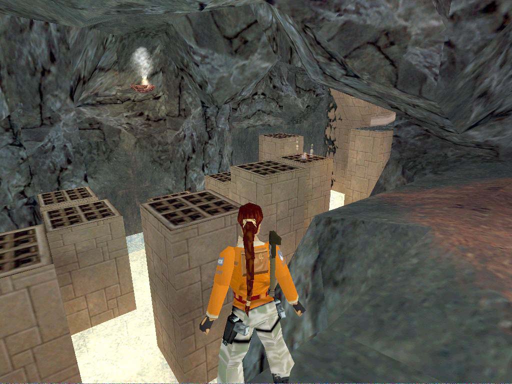 A platformokon haladjunk felfelé oda, ahol fáklyát szedhetünk fel, és ugorjunk középre, a magasabb oszlopra a két kerítés közé, majd fenti kapaszkodással menjünk majdnem végig, essünk a csúszós platformra. Mielõtt leesnénk, töltsük fel az életerõnket, majd zuhanjunk le a beszakadós részhez, onnan pedig tovább egy nagy terembe. Vegyük fel az elsõsegély csomagot, majd ugorjunk át a fáklyához, onnan pedig balra egy szinttel lejjebb, majd onnan át a kerítéses részhez, ahol a járatban egy kapcsolóhoz tudunk felkapaszkodni. Húzzuk meg, majd ereszkedjünk lentebb a platformra, onnan ugorjunk át a szemközt levõre középre, a síremlék oldalához, majd onnan a másik falon kapaszkodóréses részt szúrhatunk ki, ugorjunk oda. A végén egy újabb kapcsoló vár ránk, mely lent nyit ki egy ajtót, úgyhogy kapaszkodjunk visszafelé, majd jussunk le.